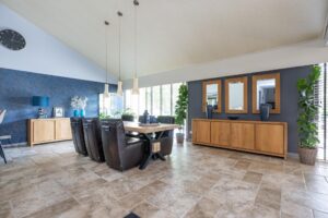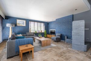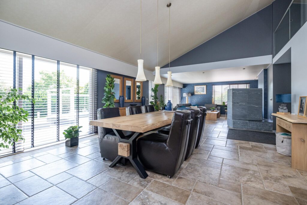 Toegang tot ruime woonkamer (5.00mx11.75) met zitgedeelte (5.00mx5.00m) met houtkachel. Het eetgedeelte (6.75mx5.00m) is verbonden met de woonkeuken.