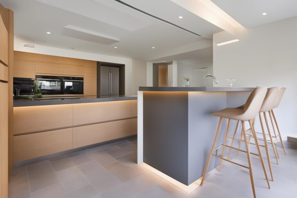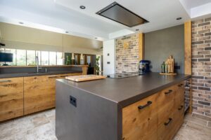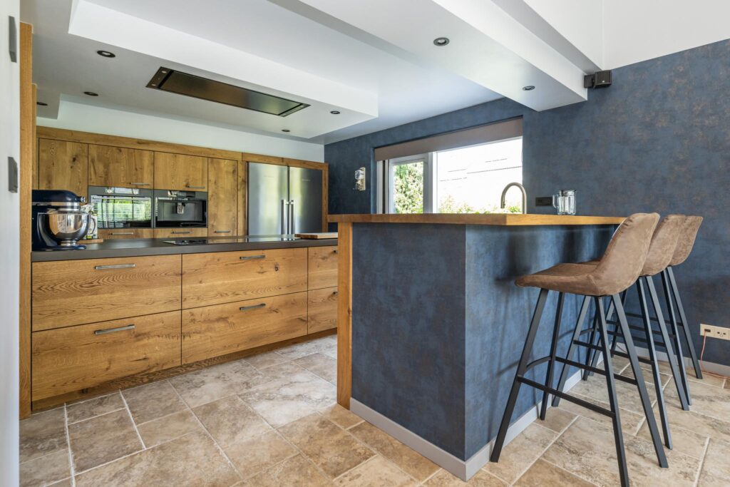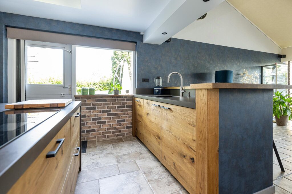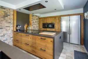 Luxe keuken van massief eikenhout (2022) voorzien van kookeiland met composiet aanrechtblad, spoelbak, geïntegreerde vaatwasser, koelkast, vriezer, stoom-/combioven, inductie-kookplaat, afzuigkap, koffiezetapparaat, oven en quooker.