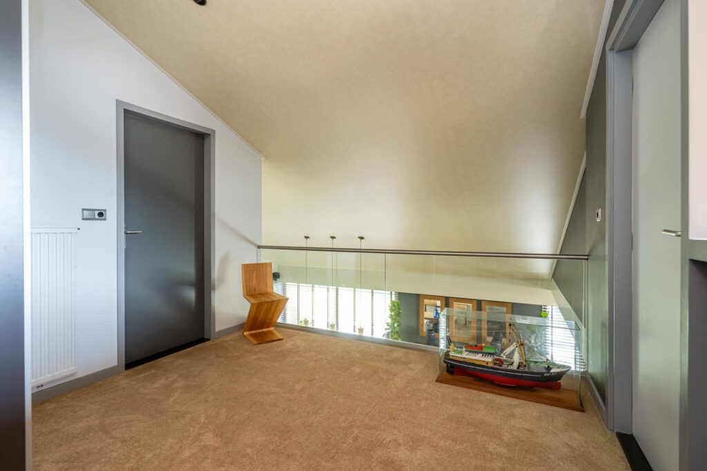 De 1e verdieping is voorzien van een zeer ruime overloop/vide, toegang tot 4 slaapkamers, 2 badkamers, 2e toilet, bergzolder en balkon, airco’s.
