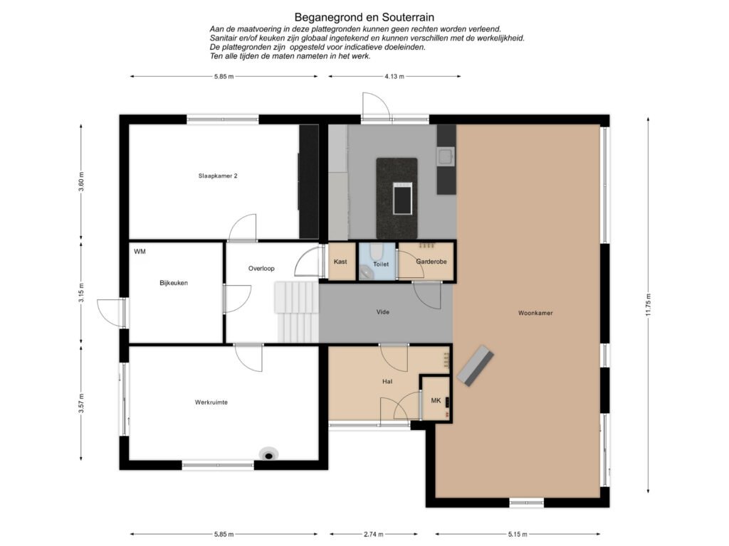 Vanuit vide eveneens met vaste trap bereikbaar souterrain. Hier bevinden zich nog een werkkamer, slaapkamer en bijkeuken, bergkast/technische ruimte.