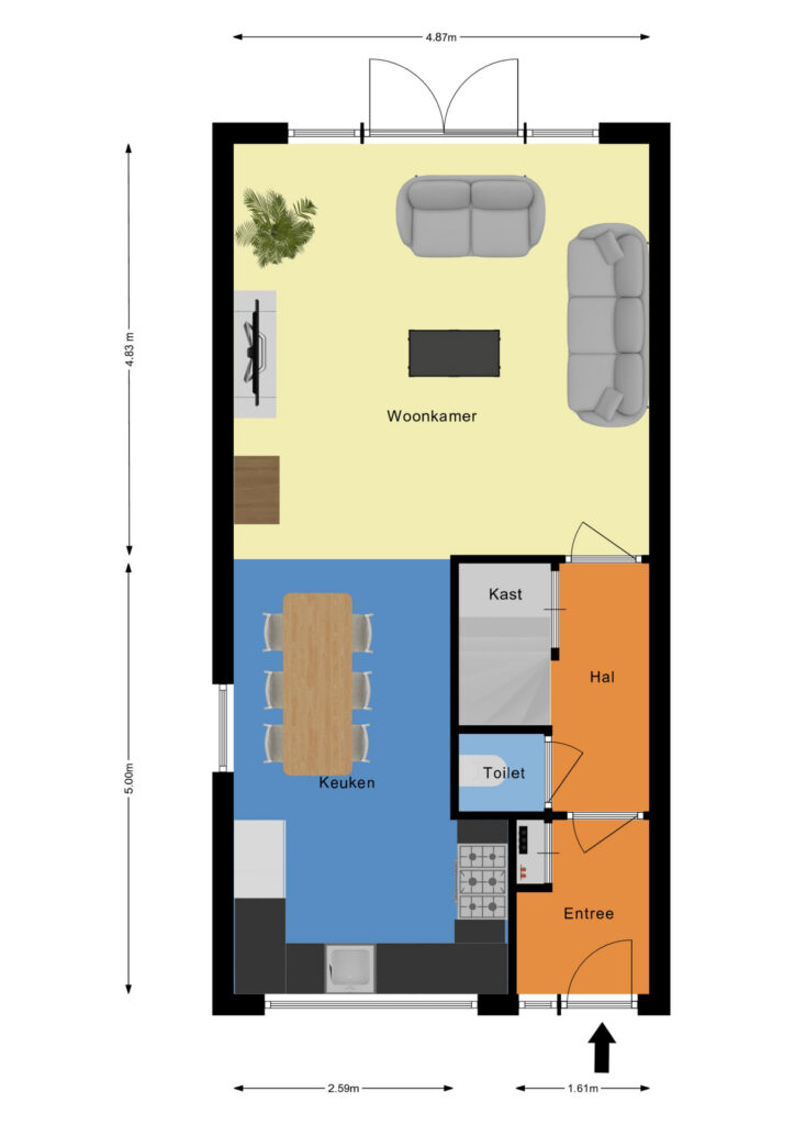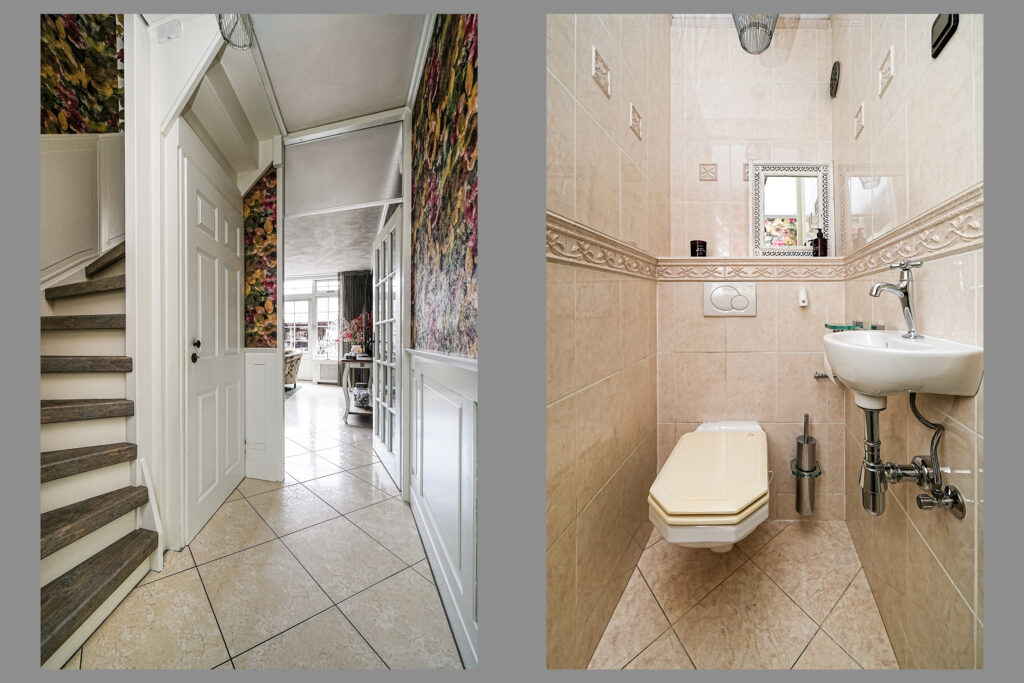 *Entree: voorportaal met de meterkast. Hal met het toilet, trapopgang naar de eerste verdieping, trapkast en toegang tot de woonkamer.