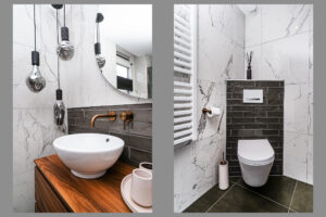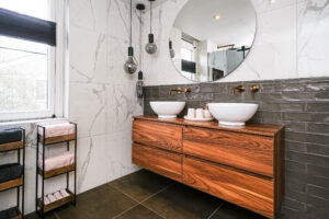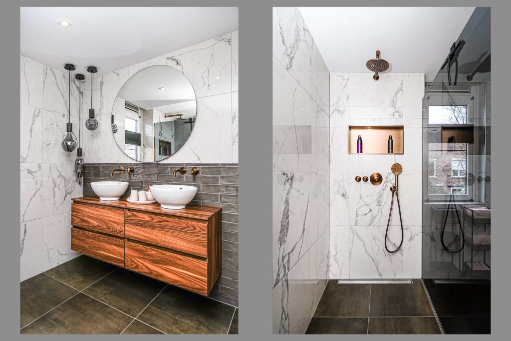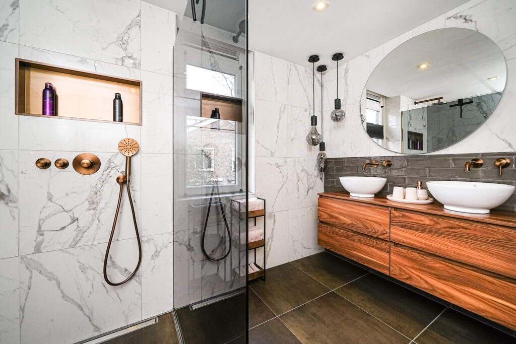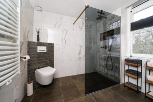 * De moderne badkamer (2022) is voorzien van een inloopdouche, dubbele wastafel en het toilet.