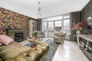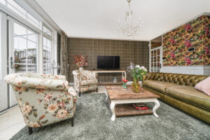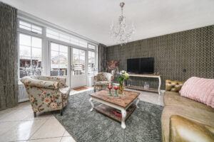 * De woonkamer is aan de achterzijde gelegen voorzien van een plavuizen vloer met vloerverwarming. Middels openslaande deuren is er toegang tot de achtertuin en aan de voorzijde van de woonkamer bevindt zich de keuken.