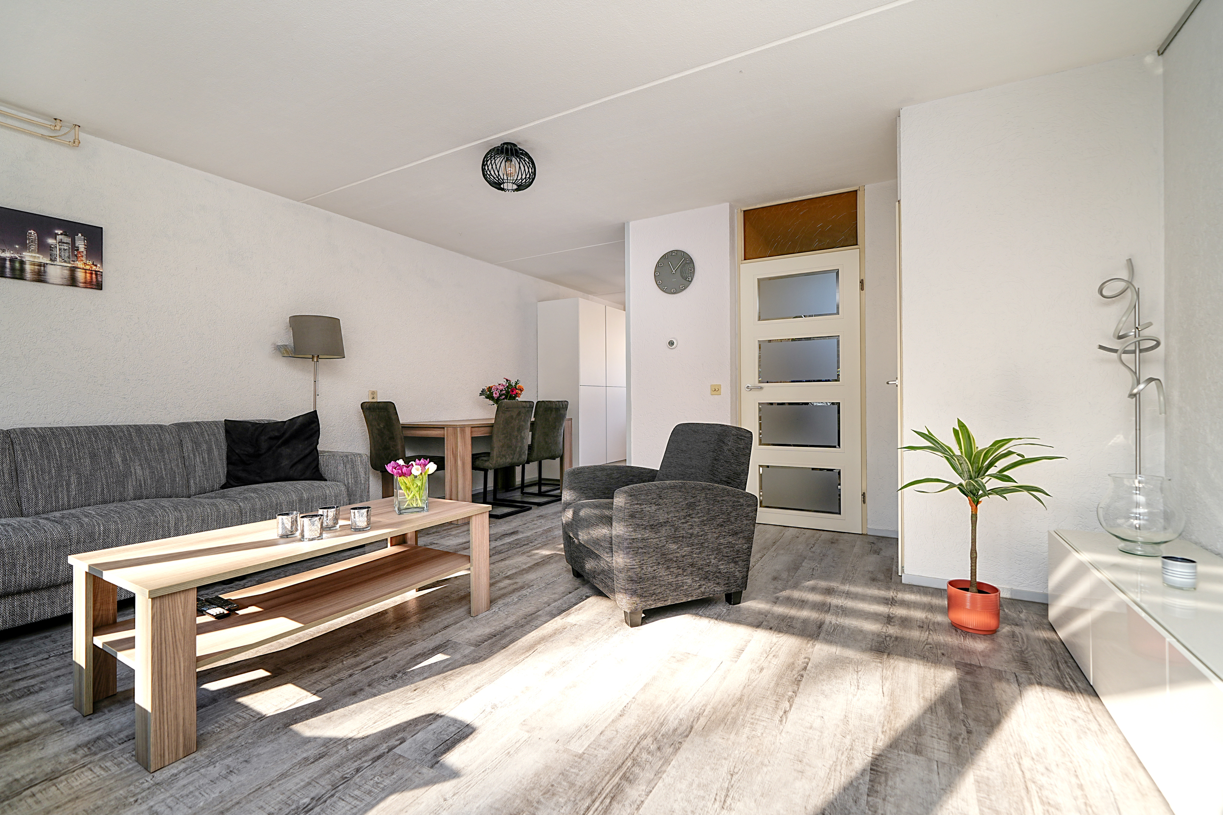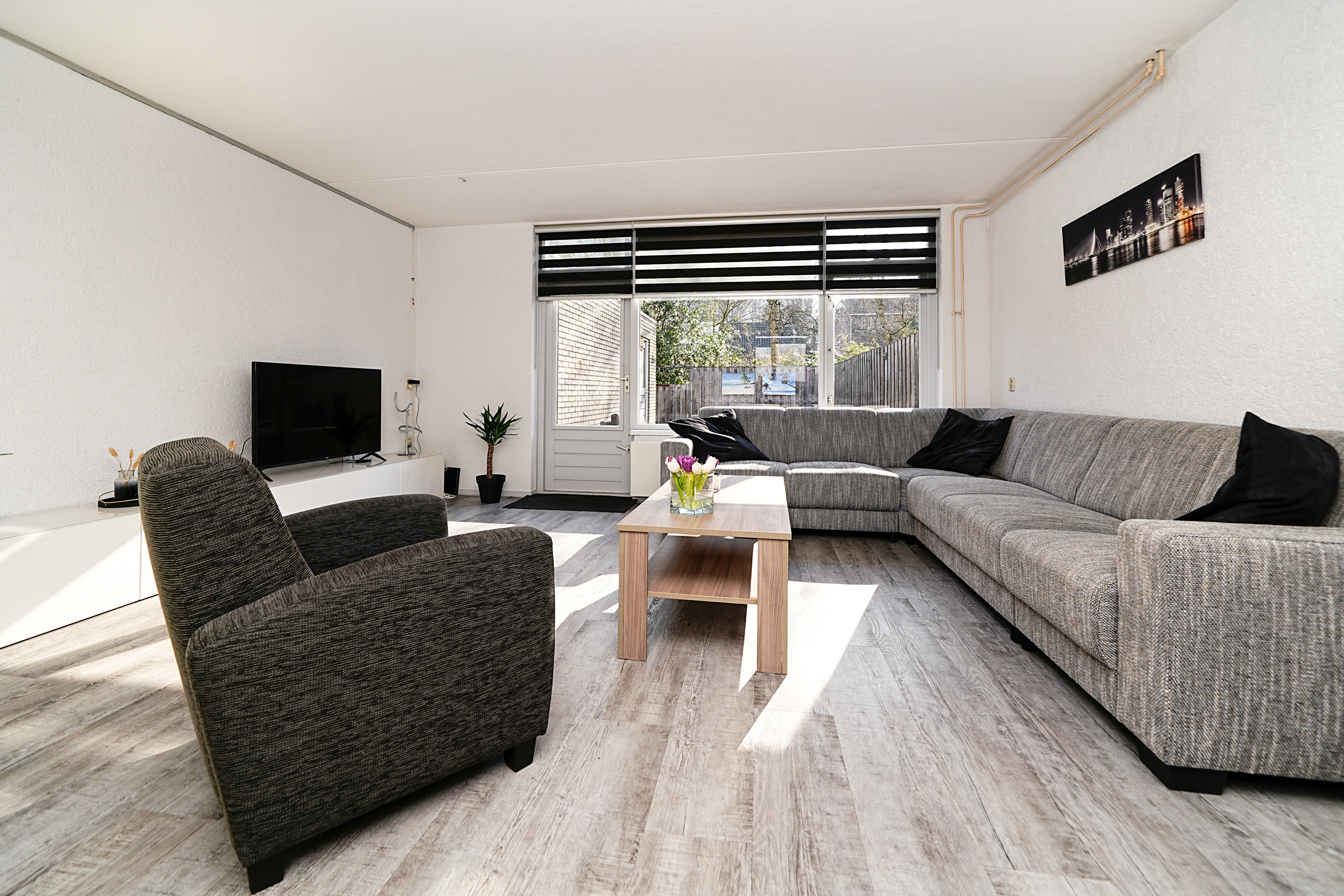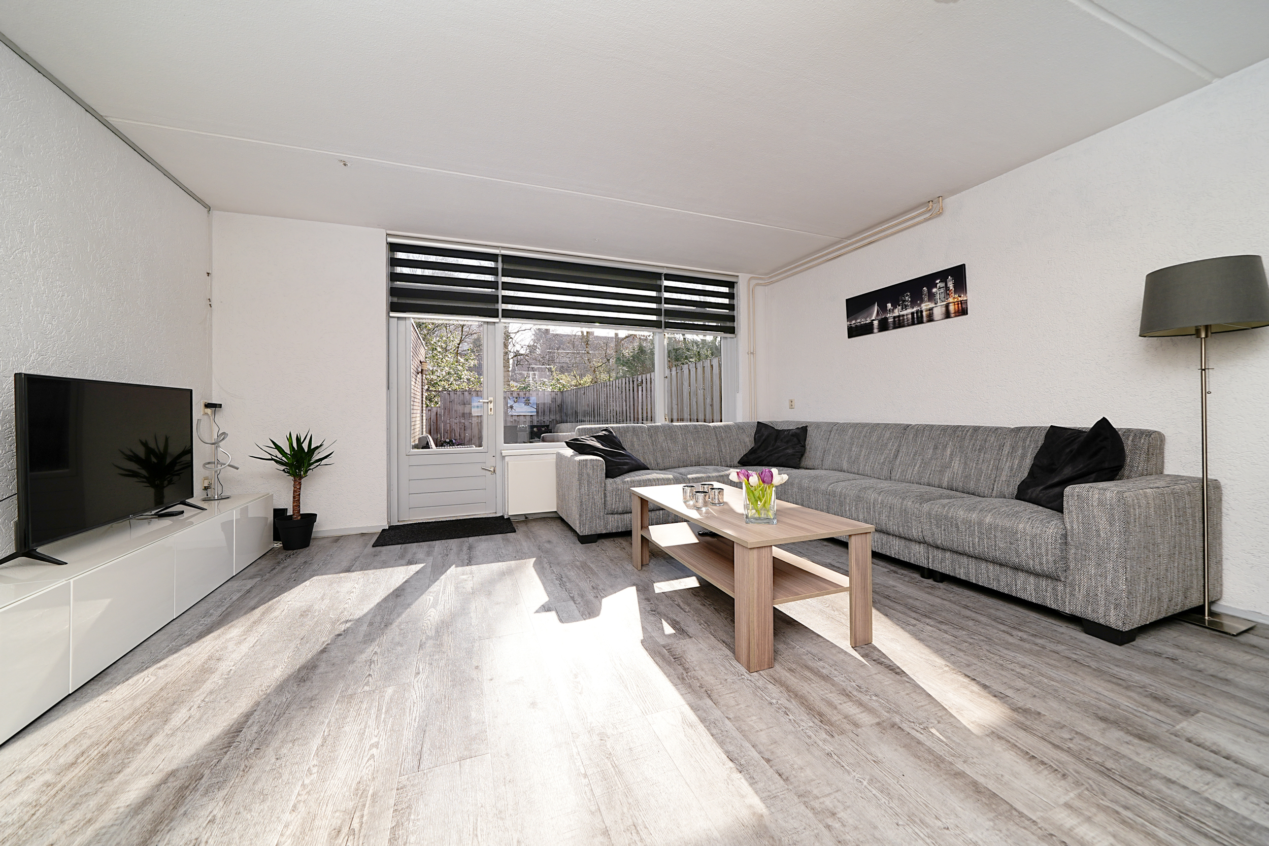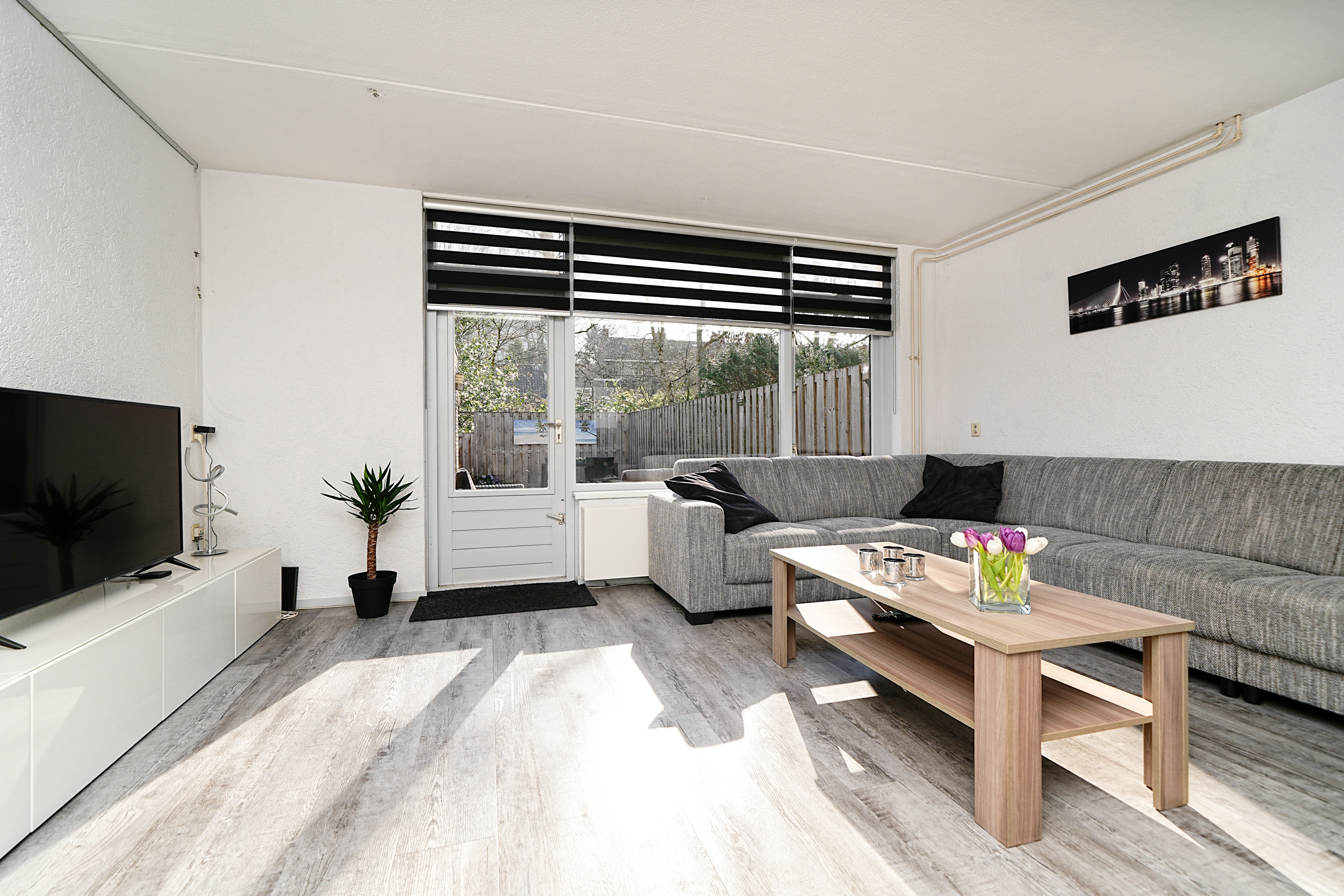 * Lichte woonkamer met toegang tot de keuken, trapkast en de achtertuin;
