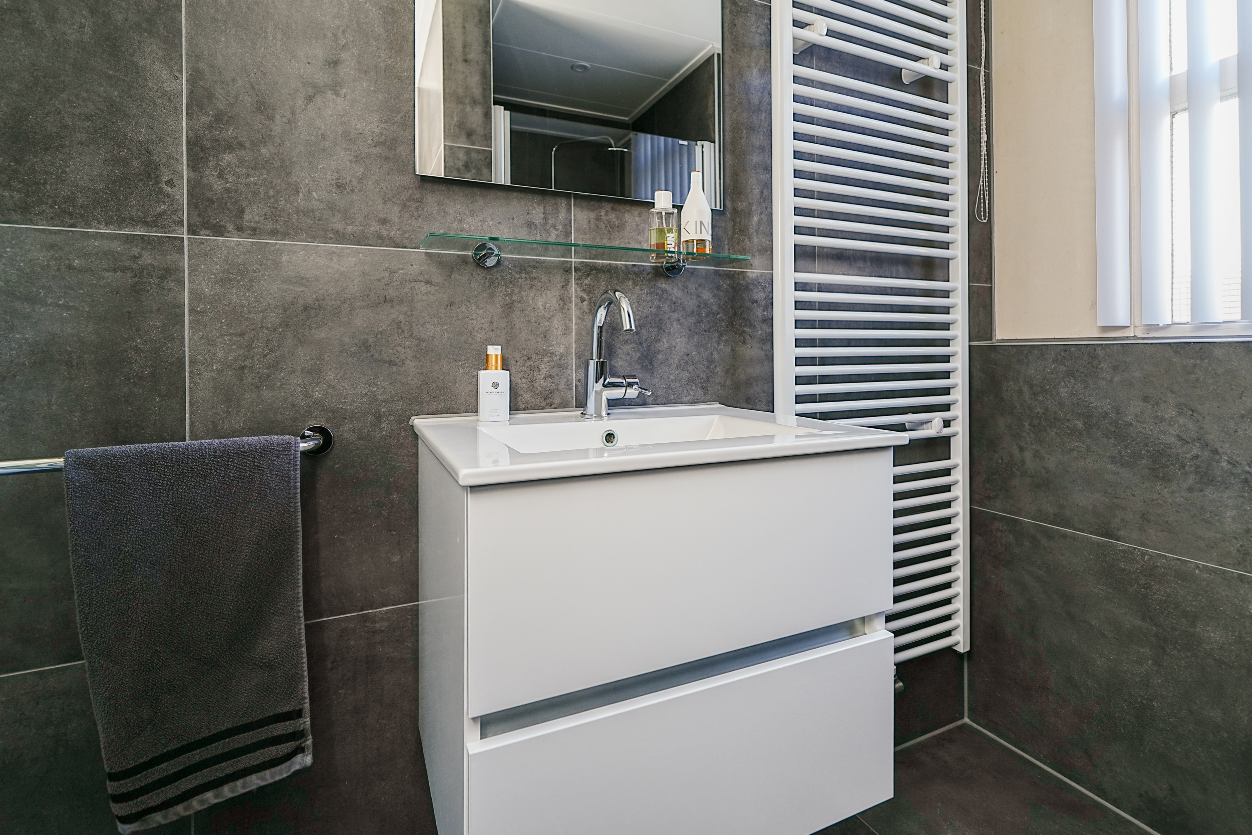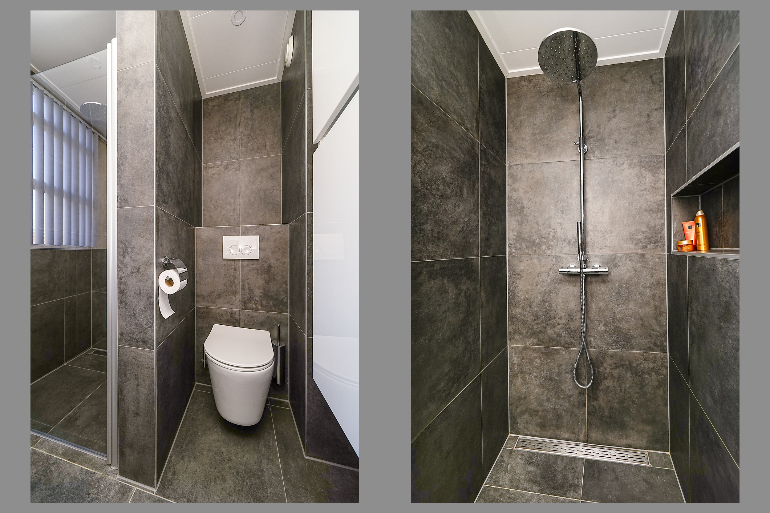 * De badkamer (jan. 2022) beschikt over een inloopdouche, toilet en een wastafelmeubel.
