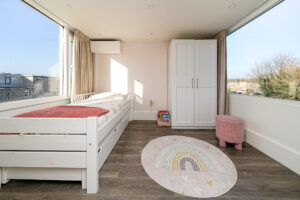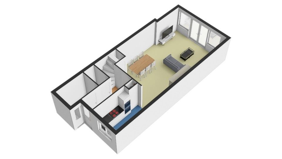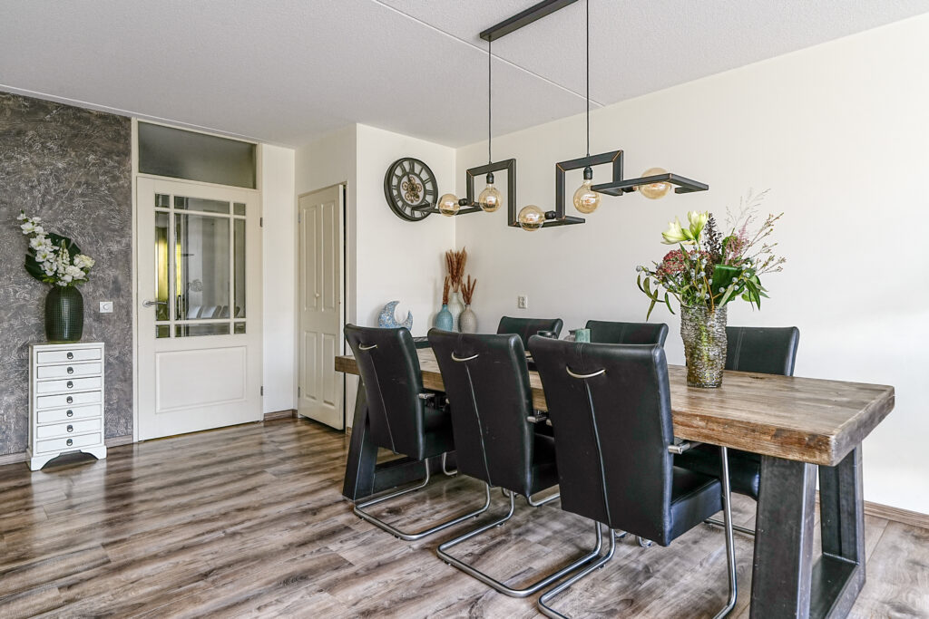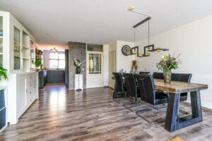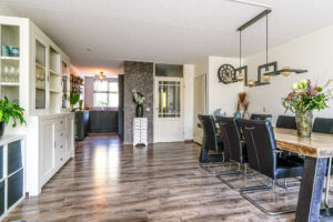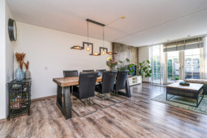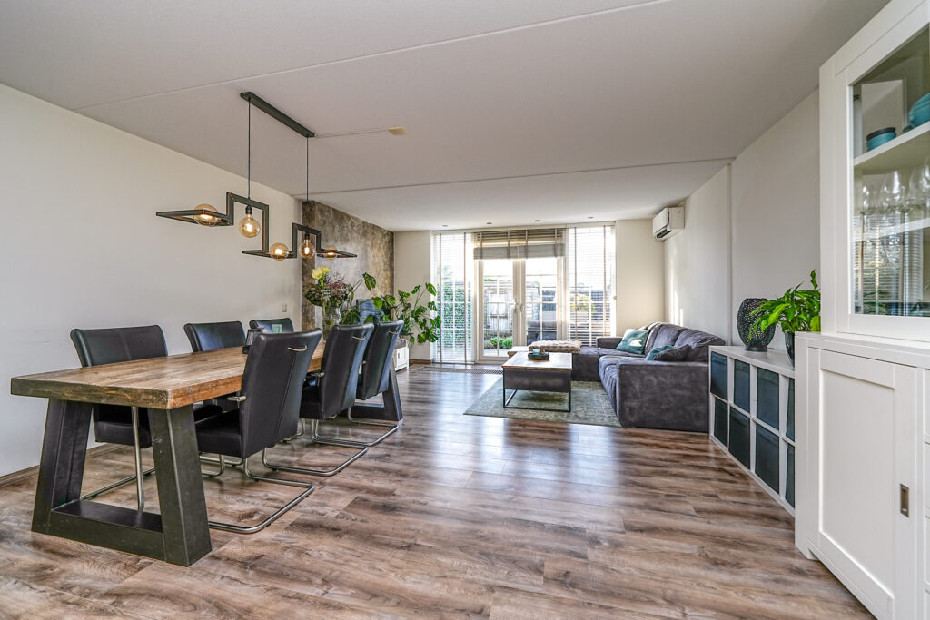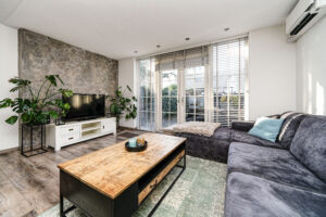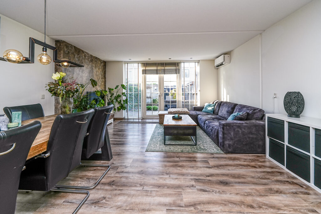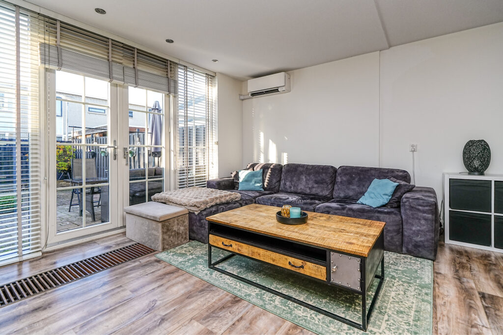 * De lichte woonkamer is voorzien van airco en twee terrasdeuren die toegang geven tot de achtertuin, gelegen op het Zuidwesten. Dankzij de uitbouw is er een ruime en lichte woonkamer ontstaan;