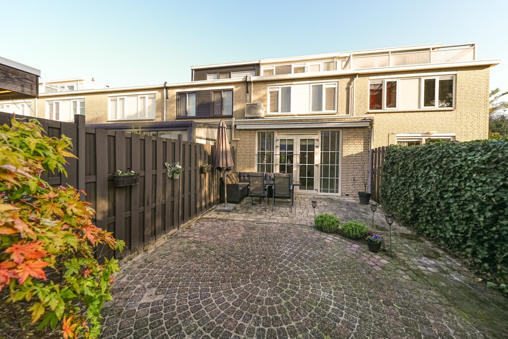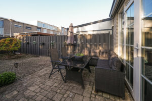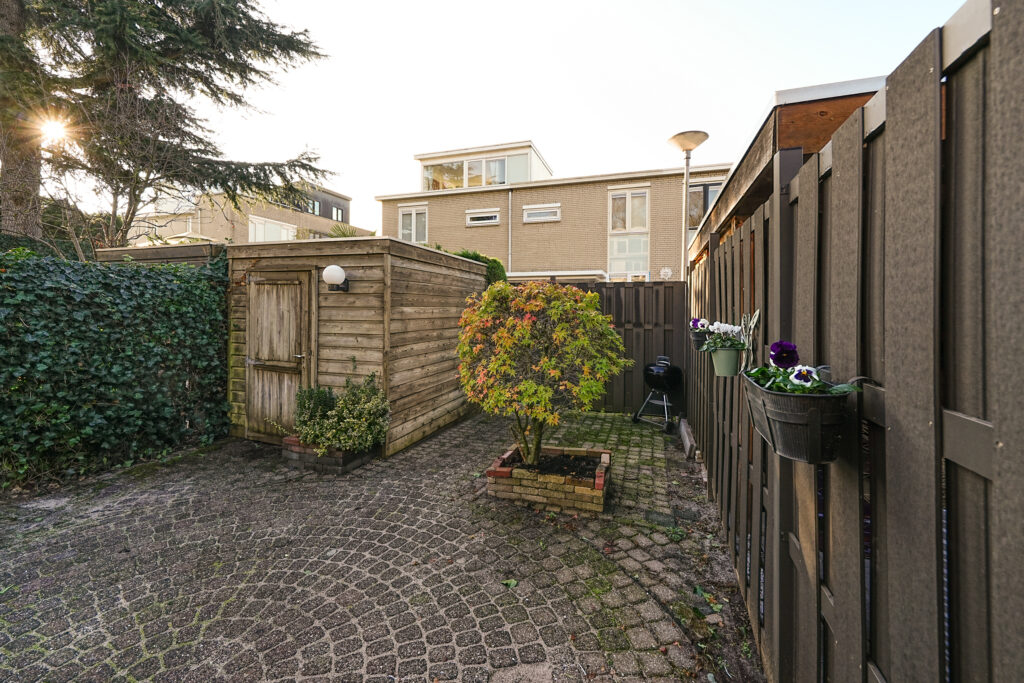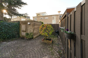 * De achtertuin, gelegen op het zuidwesten is voorzien van houten berging en een achterom.