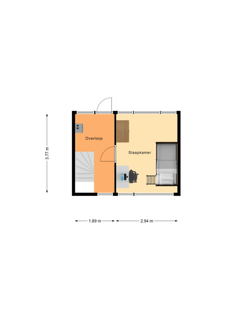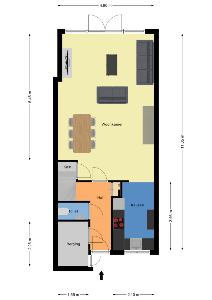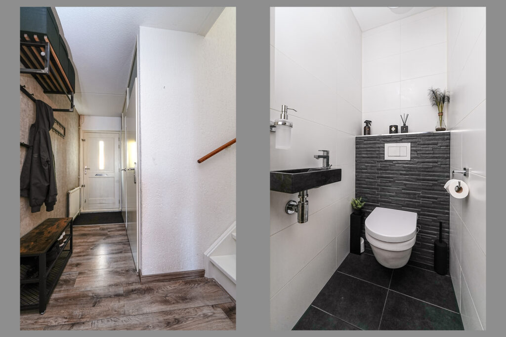 * Hal met het toilet, trapopgang naar de eerste verdieping en toegang tot de woonkamer en de berging met de wasmachine-aansluiting;
