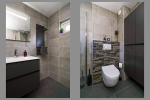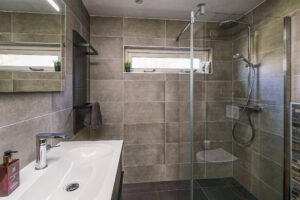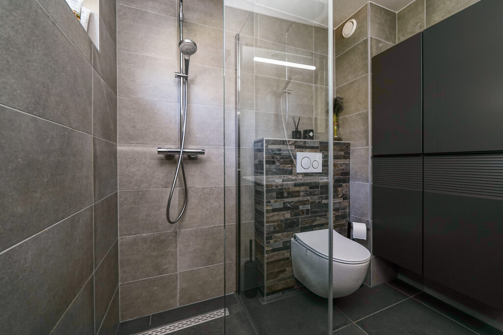 * De moderne badkamer (geplaatst in 2023) is voorzien van een inloopdouche, wastafelmeubel, wandmeubel en toilet.