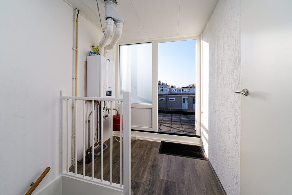 * Overloop met CV-opstelling en toegang tot het dakterras (vergunning aanwezig voor de balustrade)
