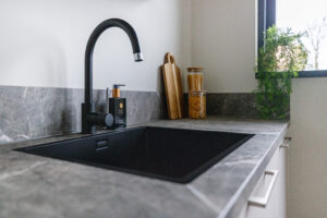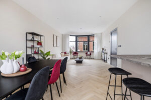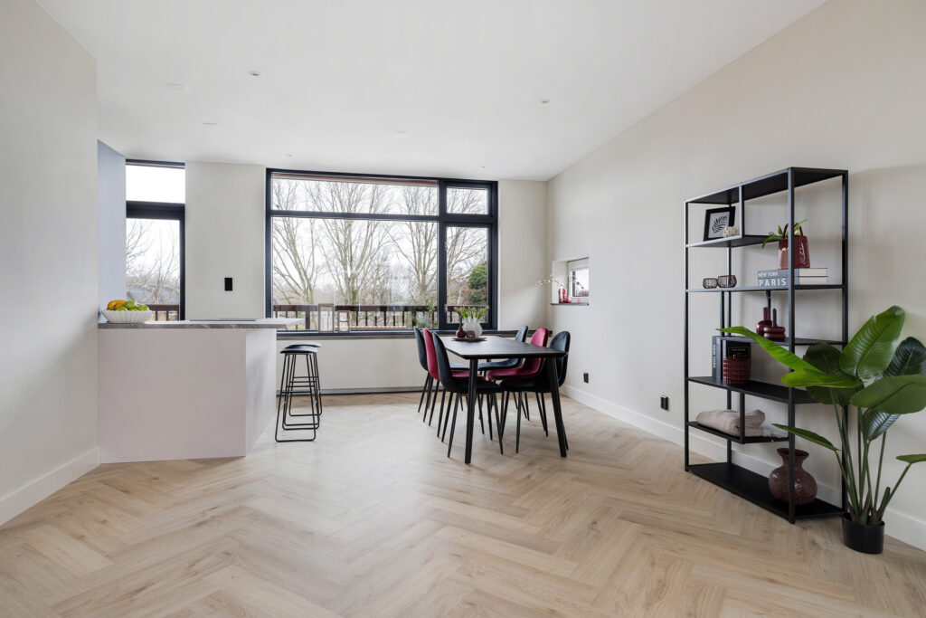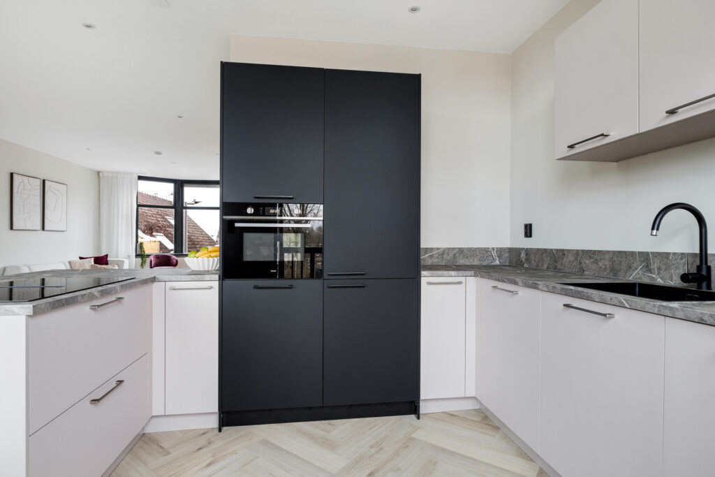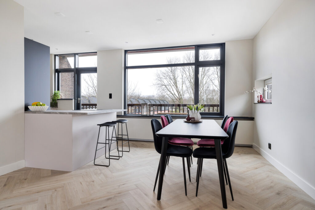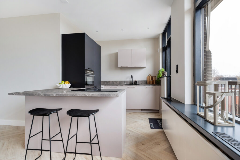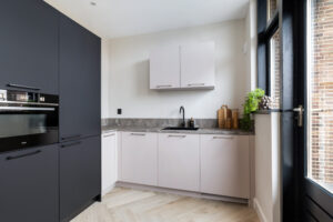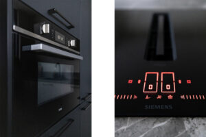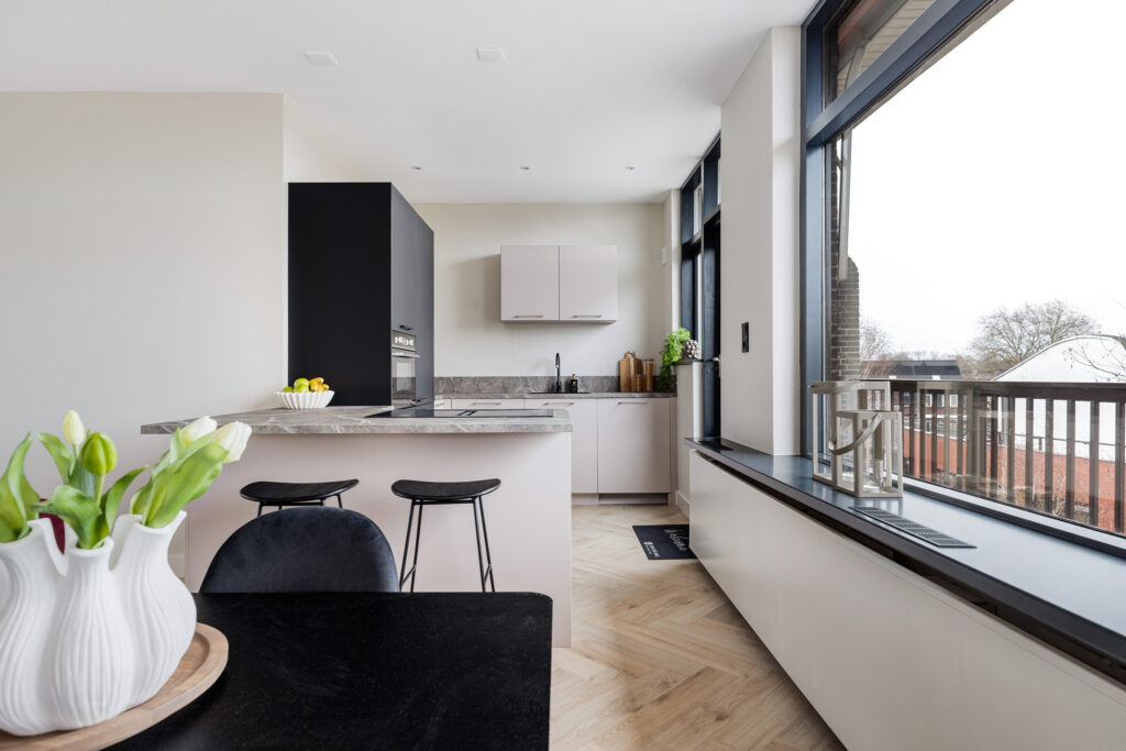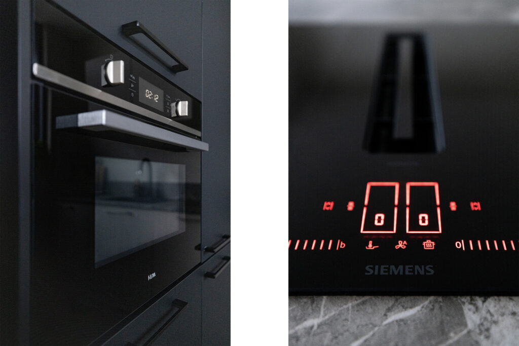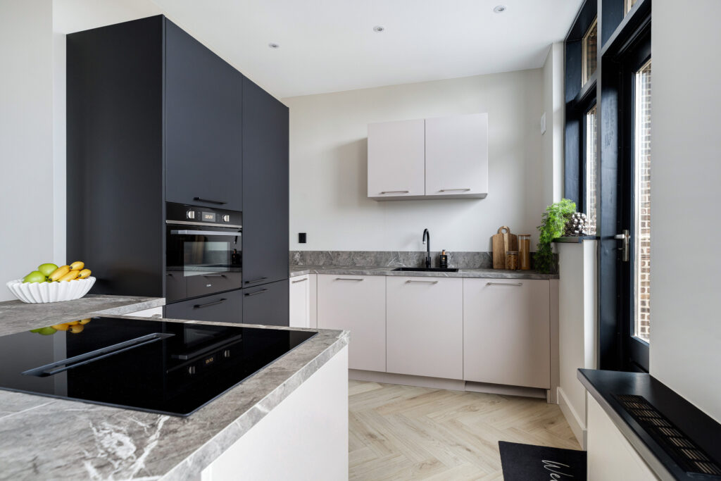 * Open keuken (2024) met ingebouwde inductie kookplaat met geïntegreerde afzuiging, koel/vriescombinatie, combi-oven en vaatwasser.