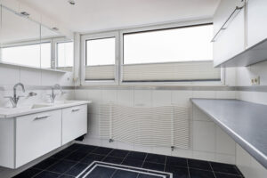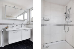 * Badkamer met douchecabine, dubbele wastafel en aansluiting voor de wasmachine;