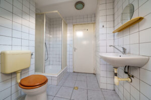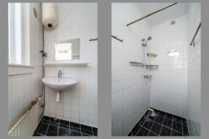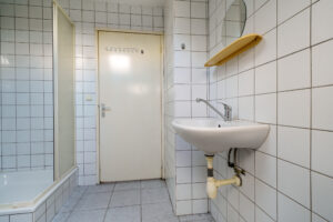 * De badkamer is voorzien van een douchecabine, toilet en hier is ook de aansluiting voor de wasmachine te vinden.