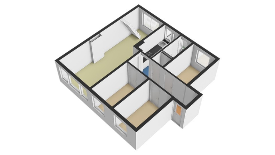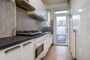 * Aan de achterzijde bevindt zich ook de keuken in een rechte opstelling en deze is voorzien van een gaskookplaat. Middels een deur krijgt u toegang tot het balkon en de badkamer;