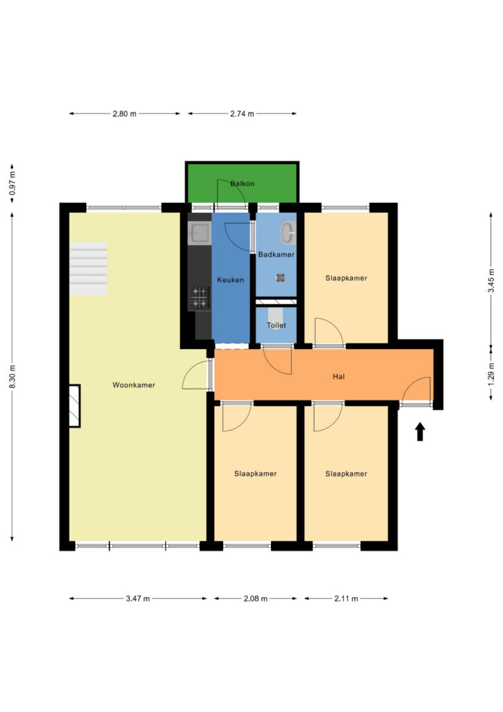 * De ruime hal geeft toegang tot de woonkamer, keuken, 3 slaapkamers en het toilet;