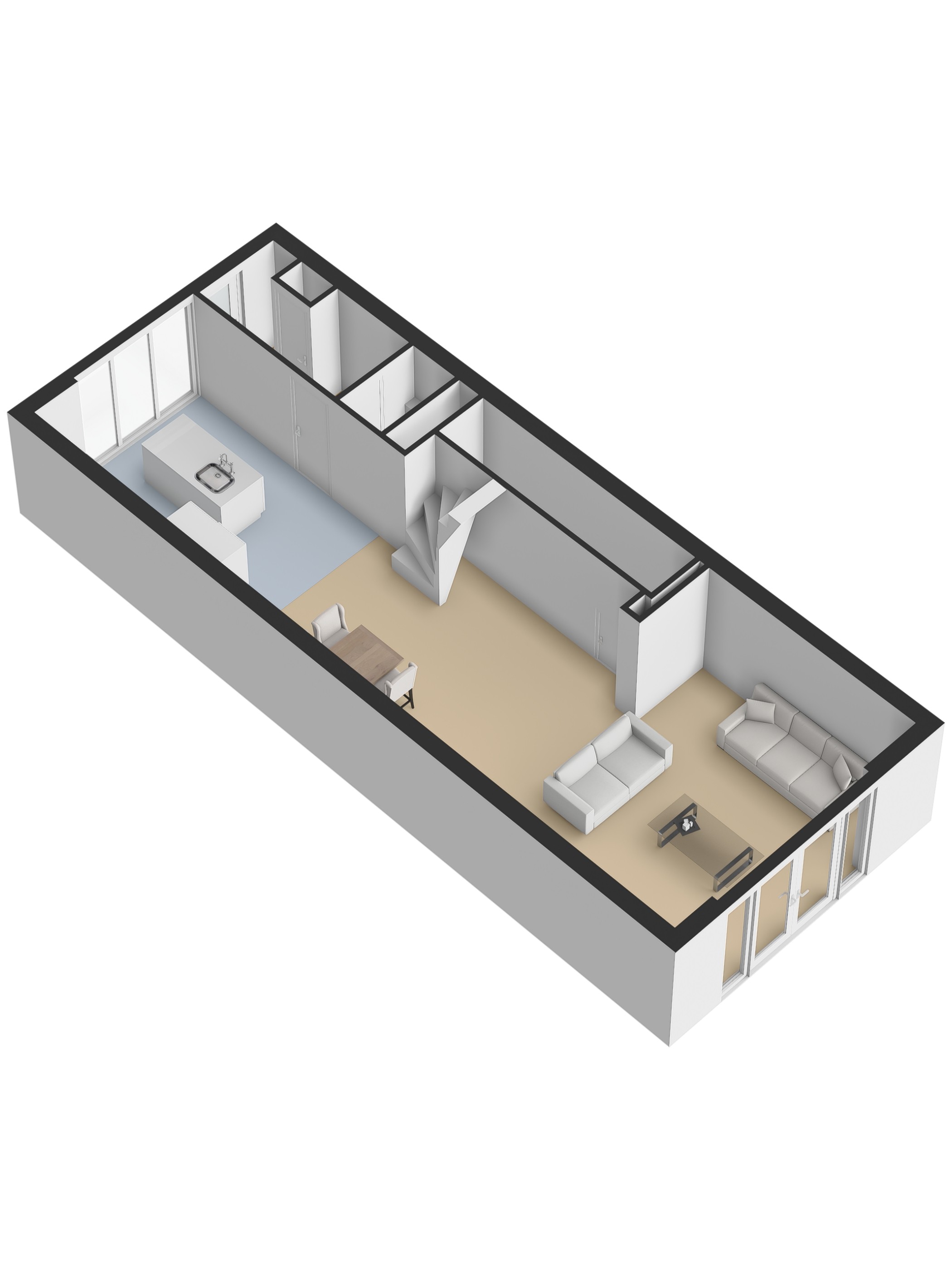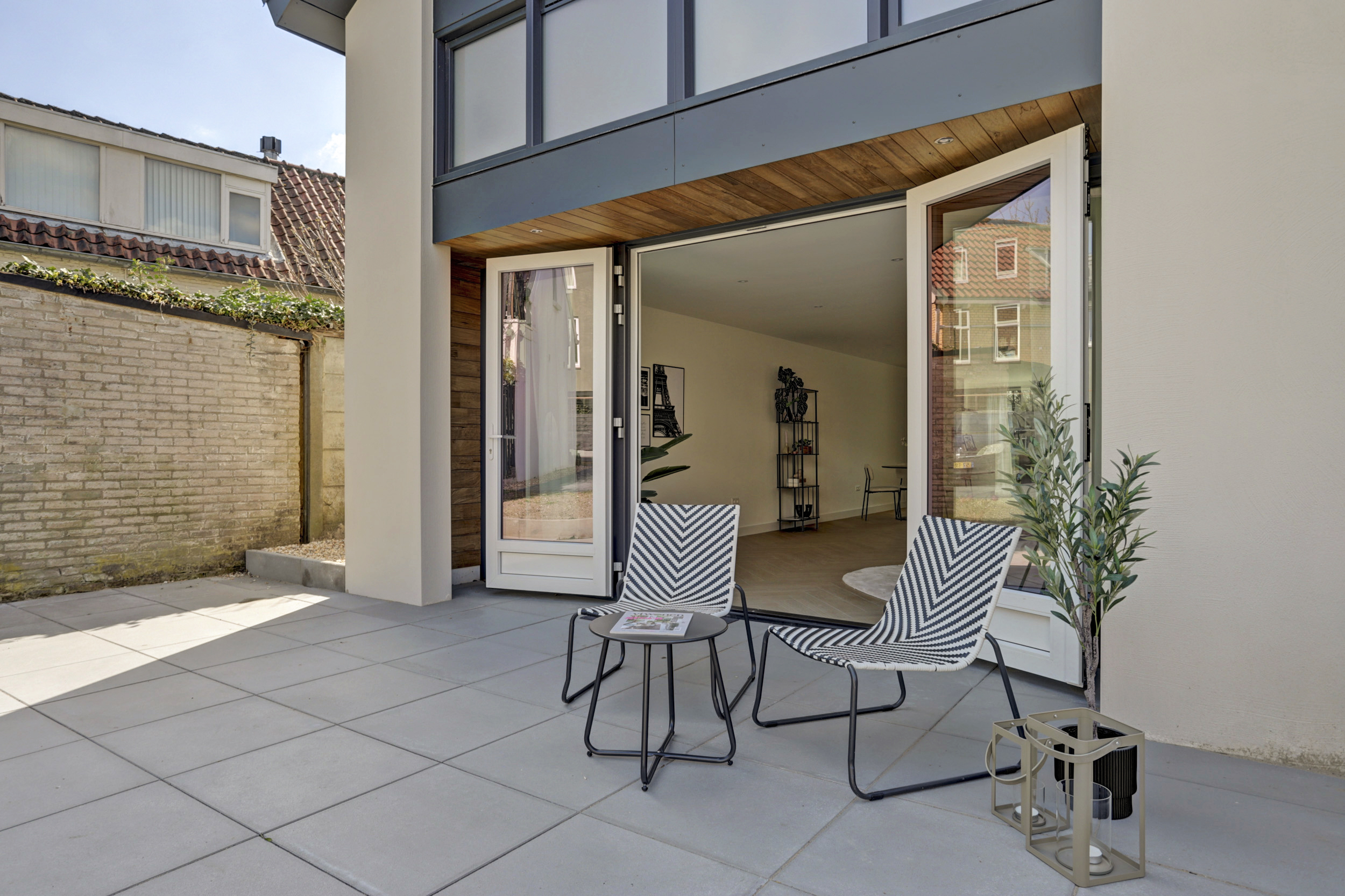 * Woonkamer aan de achterzijde met dubbele openslaande deuren naar de achtertuin.