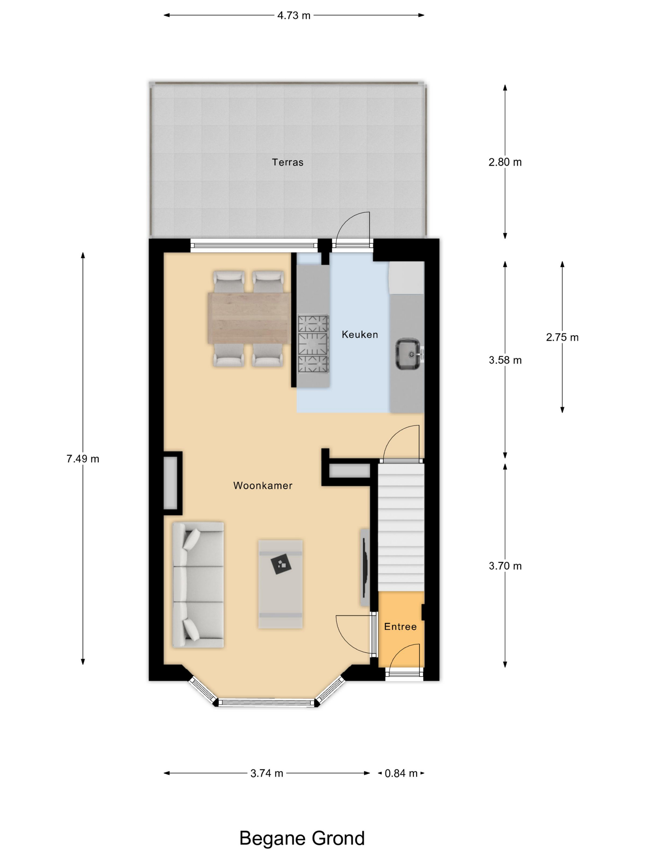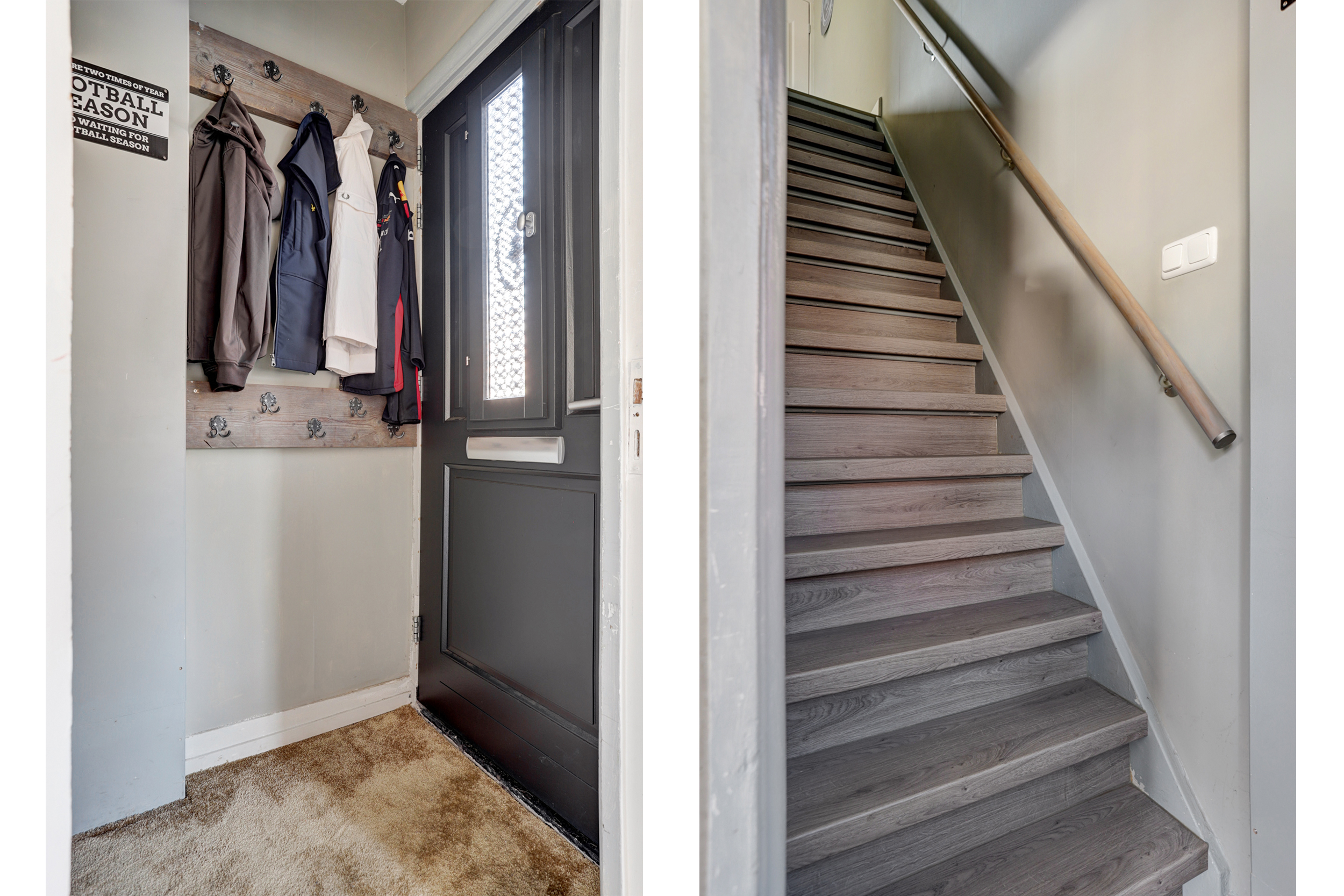 * Hal met toegang tot de woonkamer en trapopgang naar de eerste verdieping.
