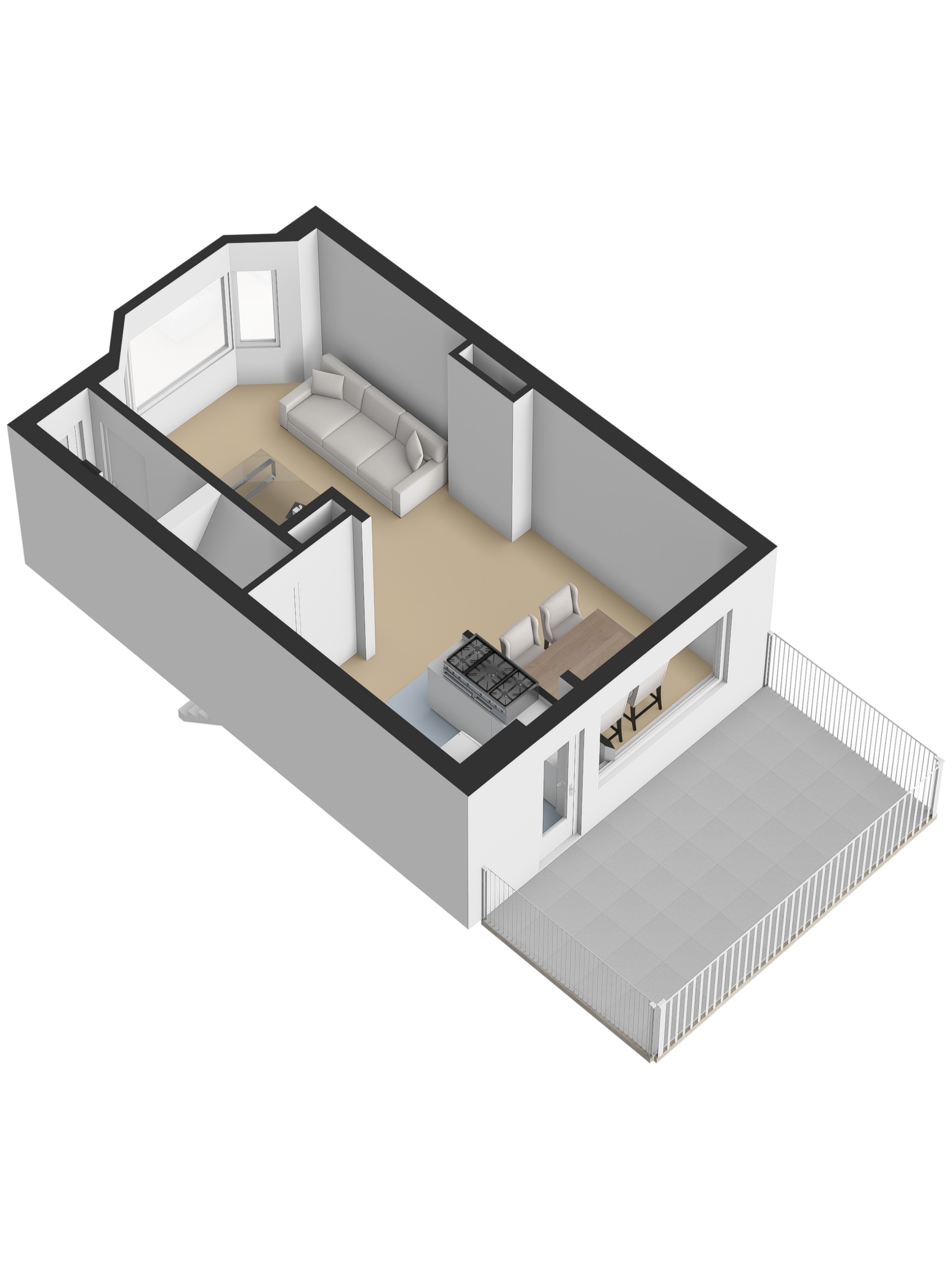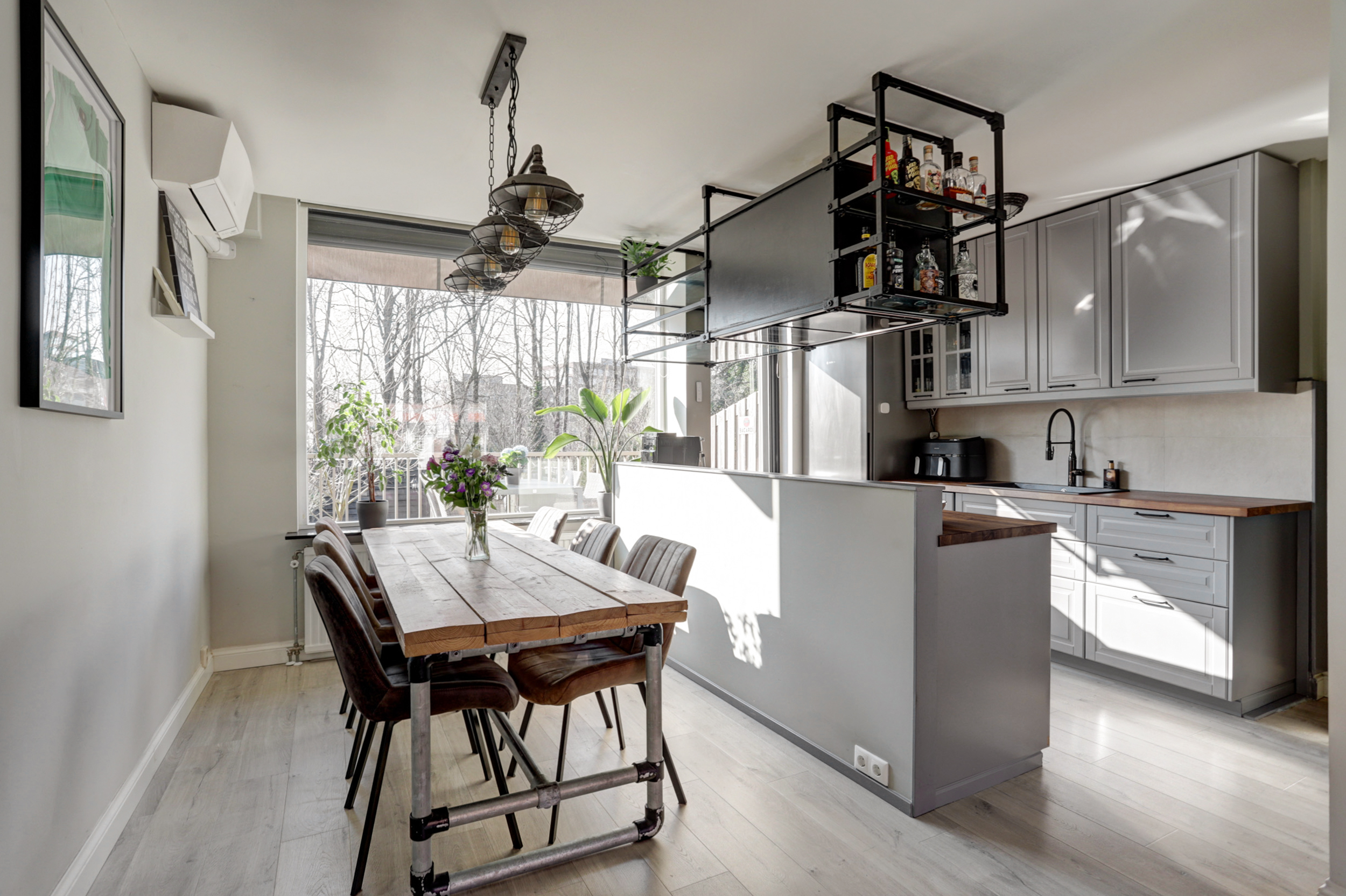 * Doorzon woonkamer met aan de voorzijde een erker en voorzien van airconditioning. Aan de achterzijde bevindt zich de open keuken met toegang tot het terras.