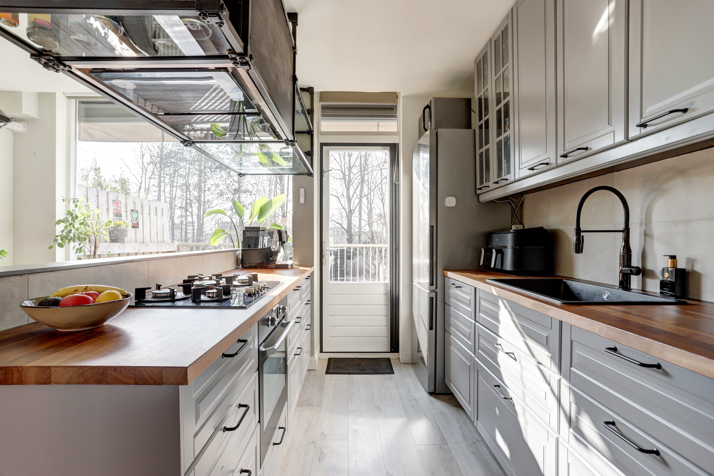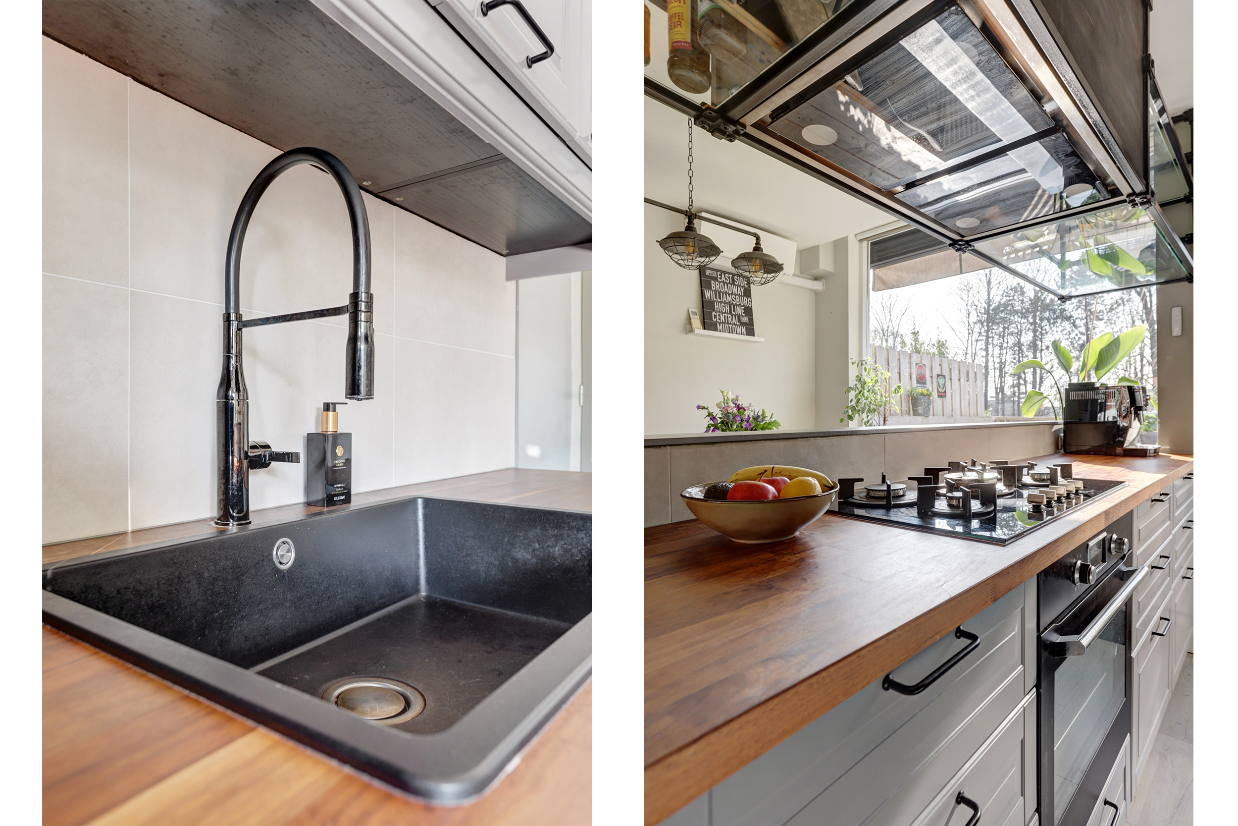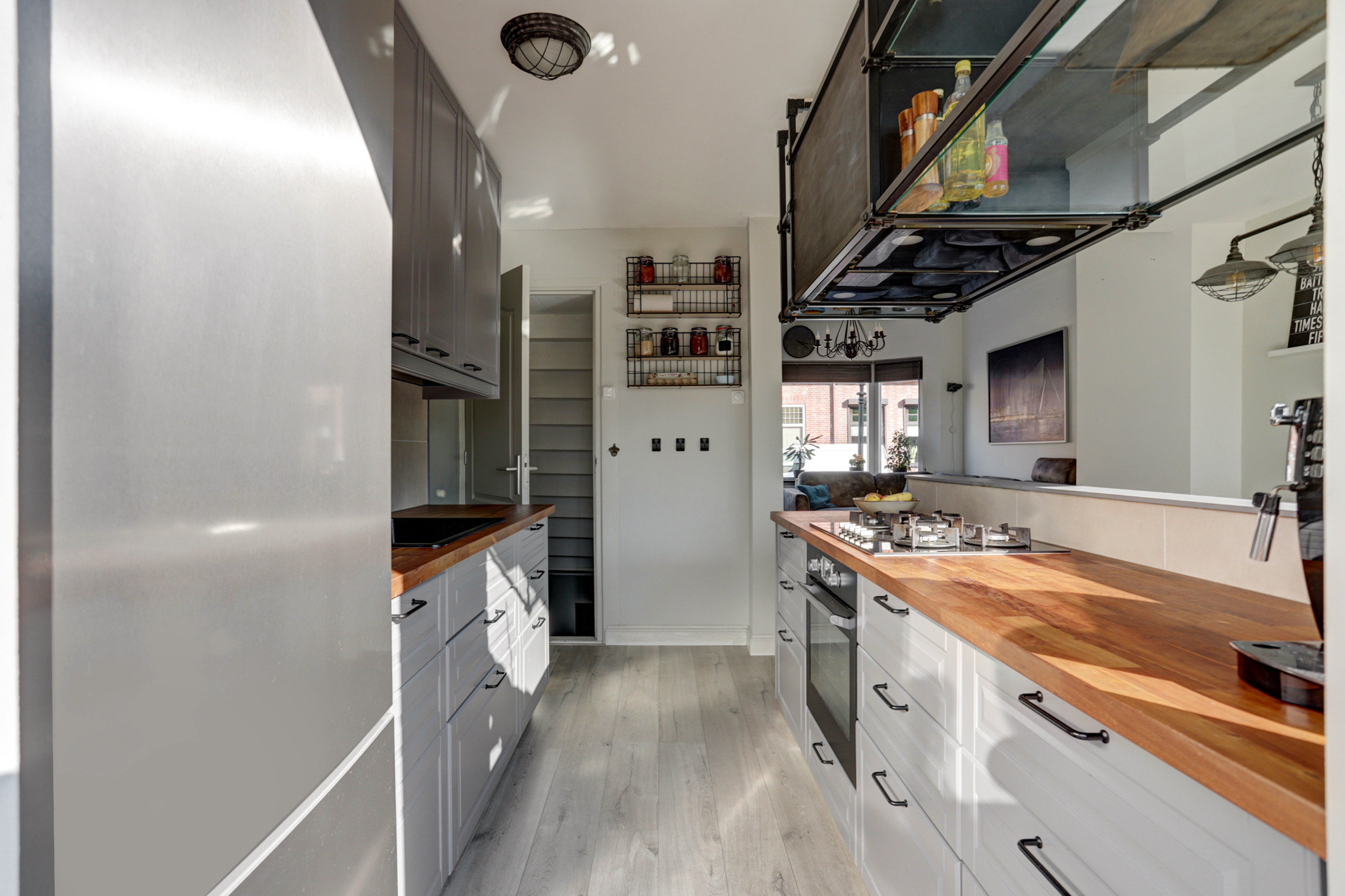 * De keuken (2022) is voorzien van een 5 pits-gaskookplaat, een strak geïntegreerde recirculatie afzuigkap, heteluchtoven en een vaatwasser.