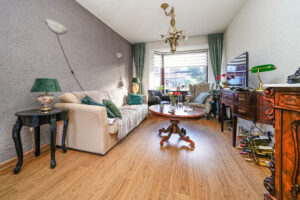 * De lichte doorzon-woonkamer heeft een prachtige vloer en geeft toegang tot de keuken. Aan de achterzijde is zonwering geplaatst;