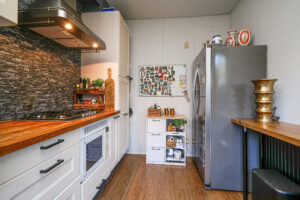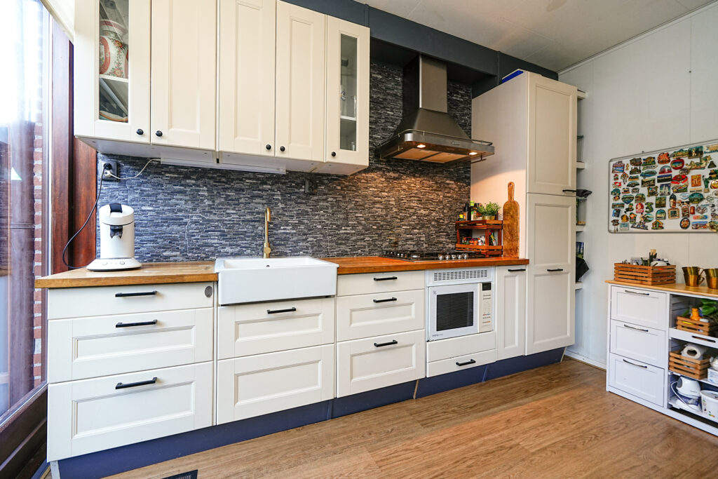 * De keuken is voorzien van een gas-kookplaat, afzuigkap, vriezer, koelkast en combimagnetron. Via een deur is er toegang tot de achtertuin;