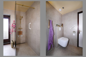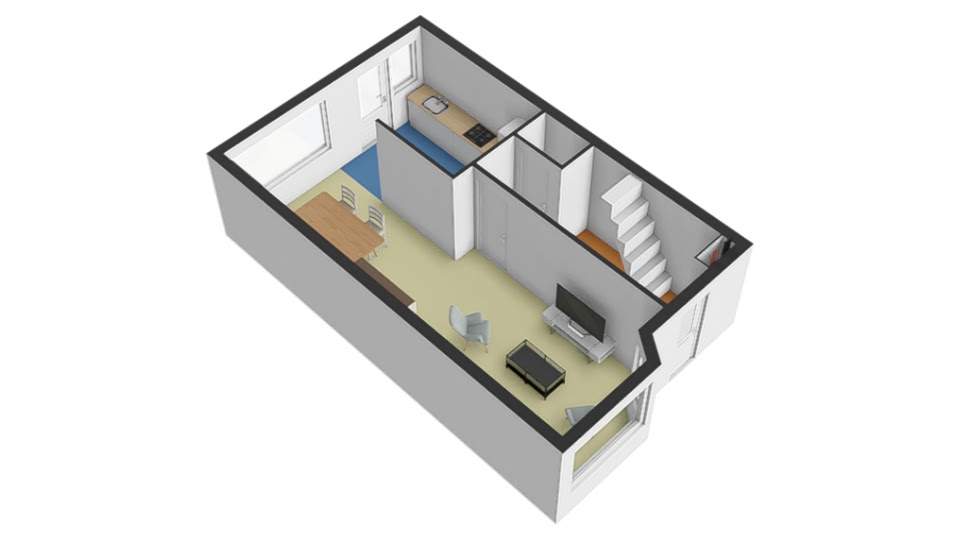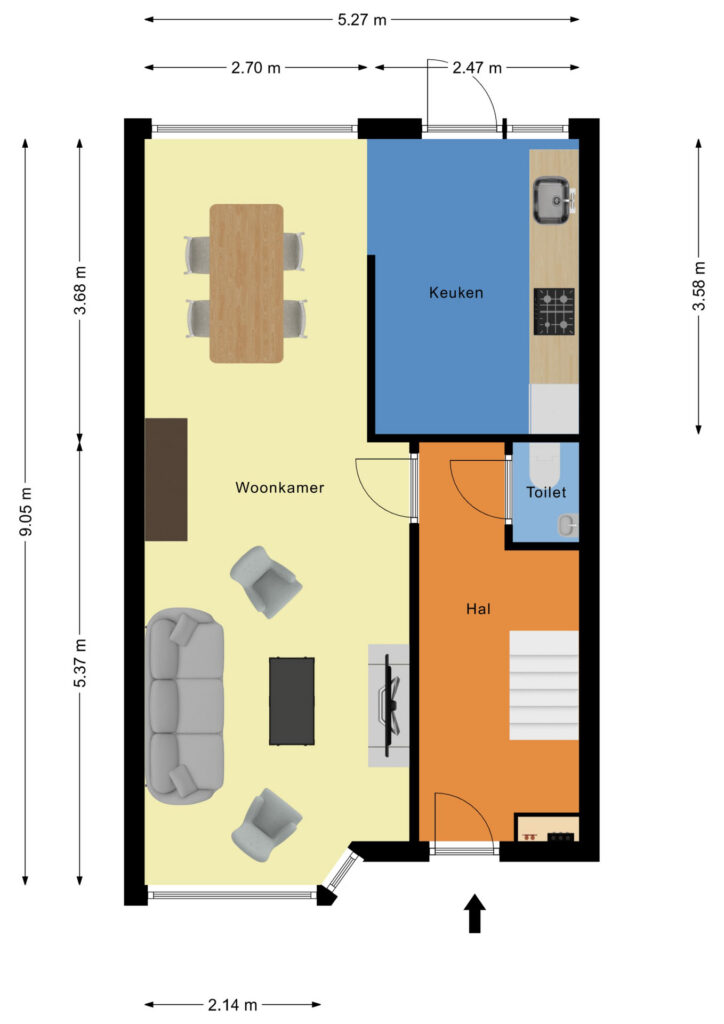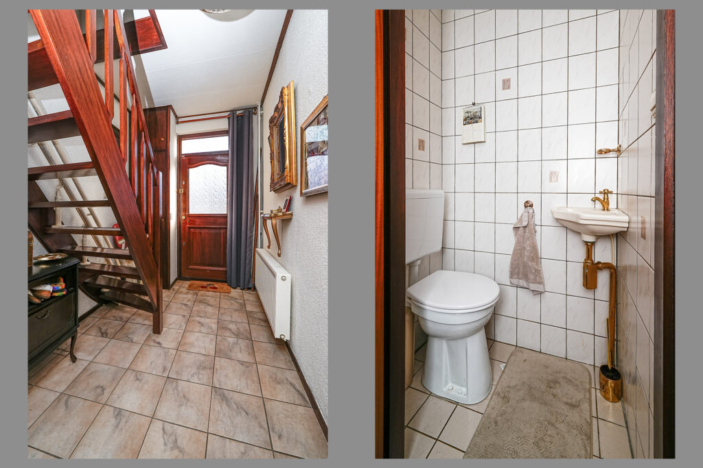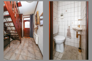 * Hal met meterkast, traplift en toilet geeft toegang tot de woonkamer. Ook bevindt zich hier de trapopgang naar de eerste etage;
