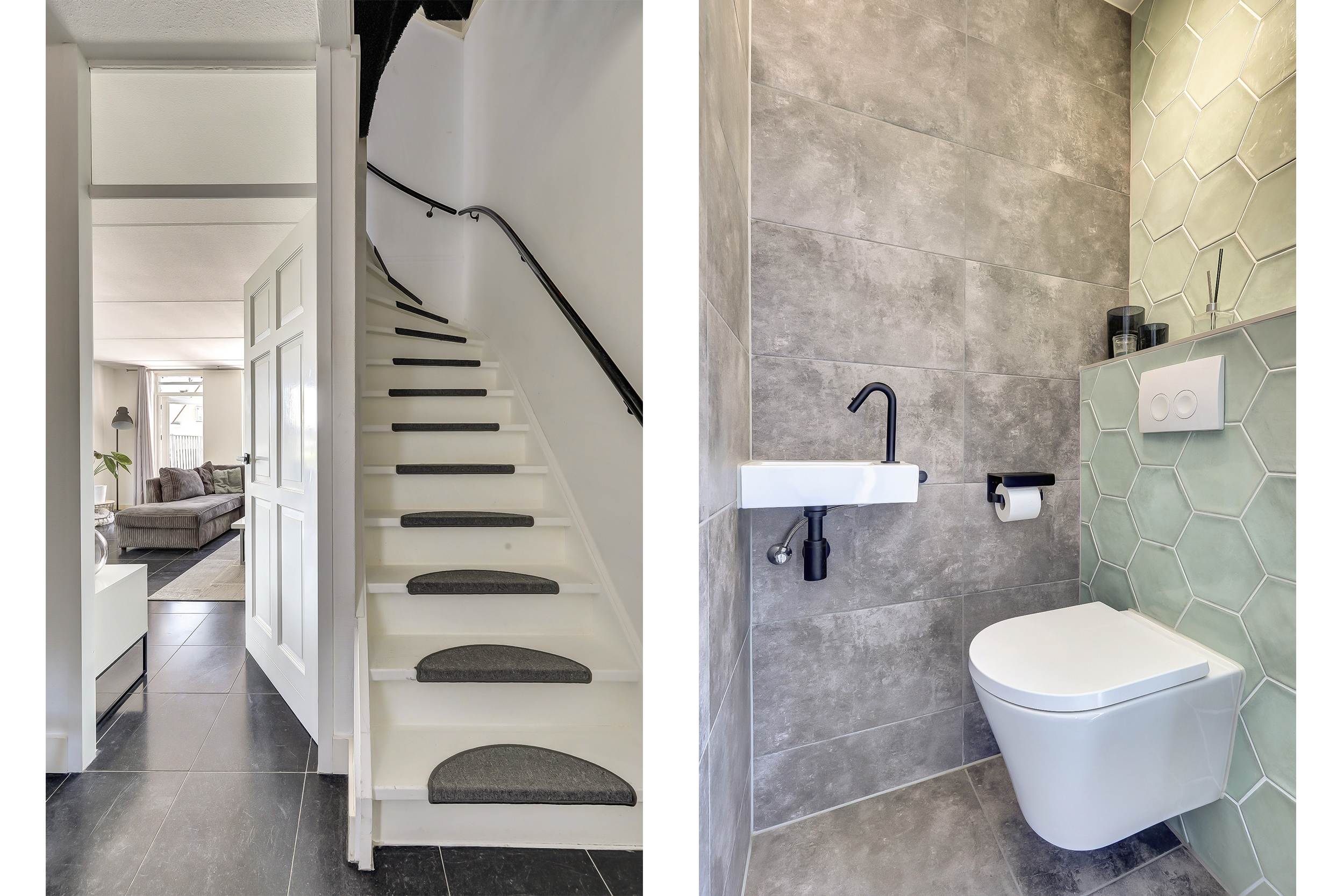 * Hal met meterkast, het toilet, trapopgang naar de eerste verdieping en toegang tot de woonkamer.