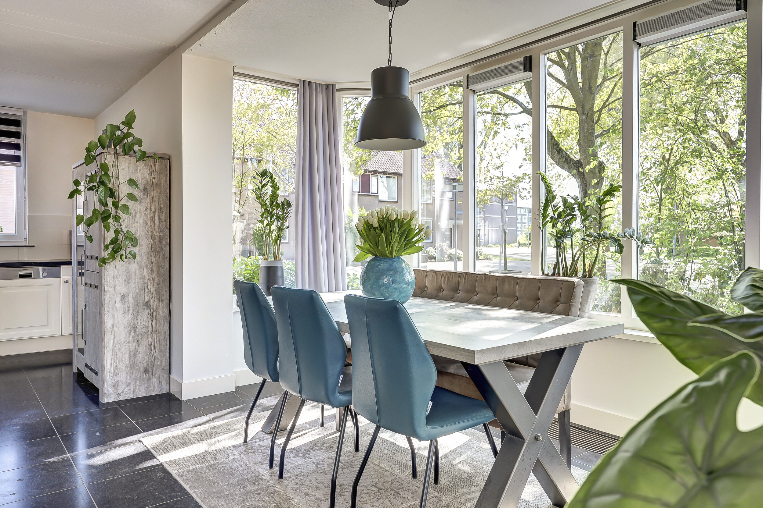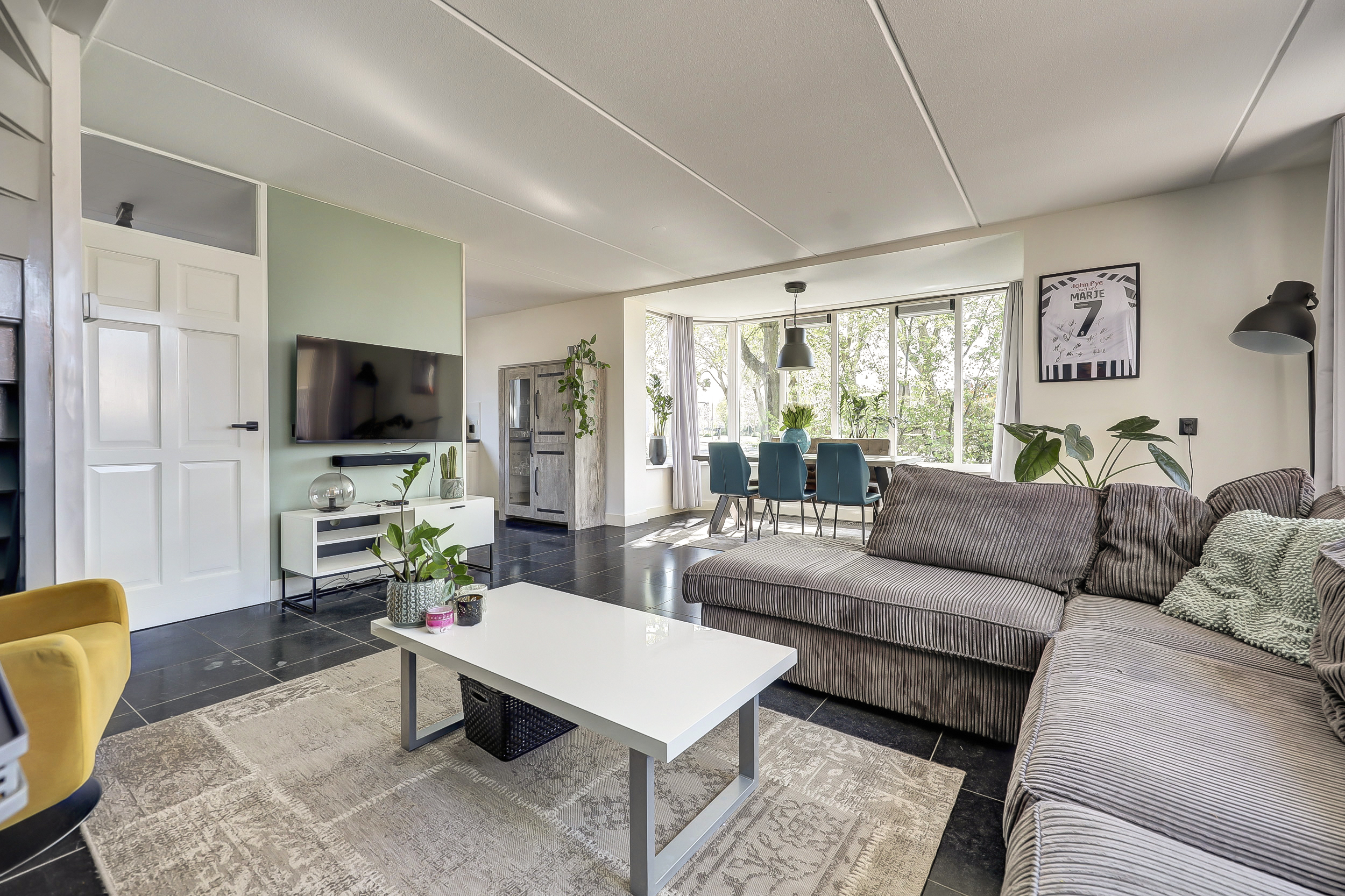 * Ruime en zeer lichte woonkamer met aan de zijkant een aangebouwde erker en aan de achterkant toegang tot de tuin.