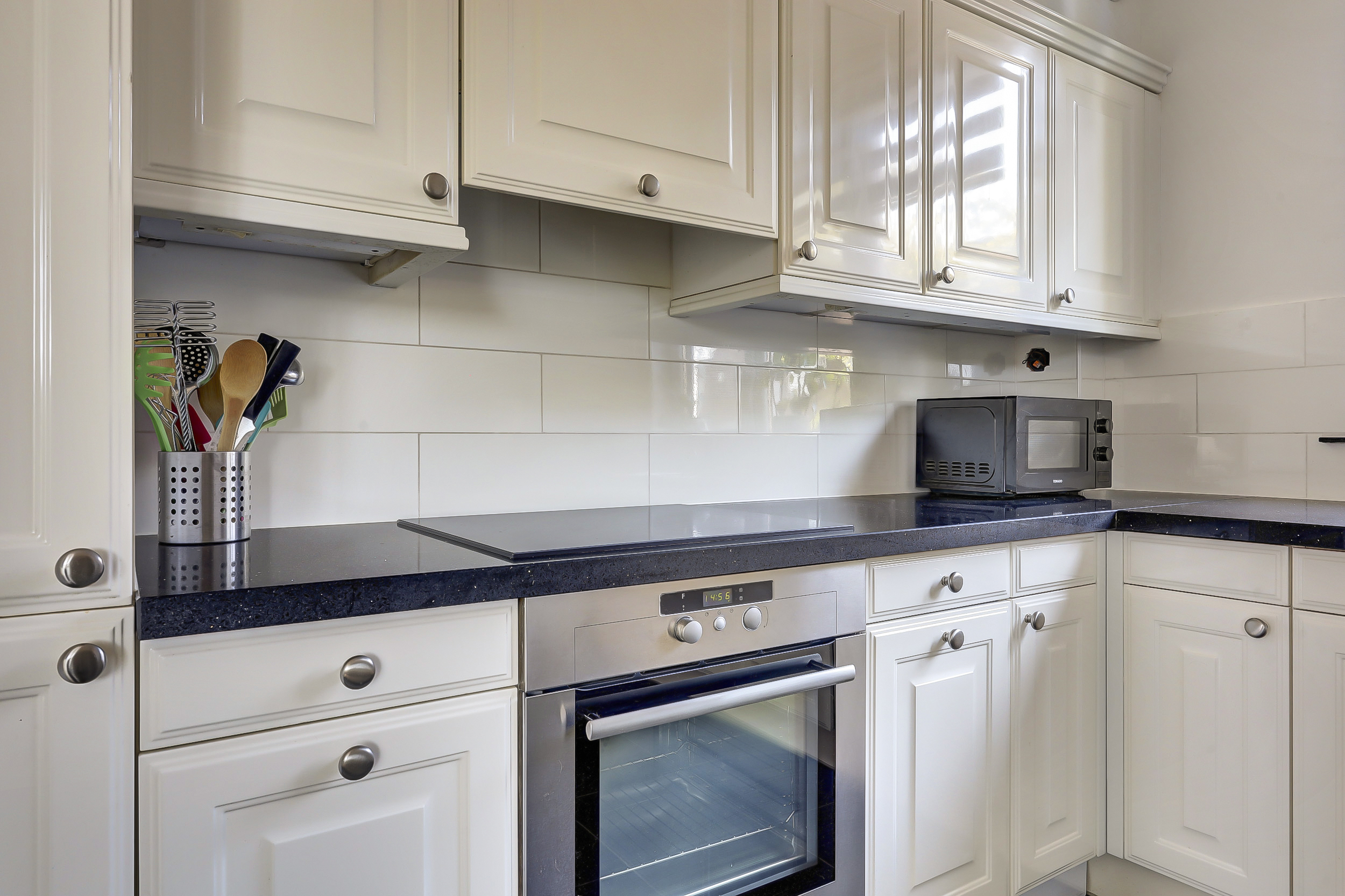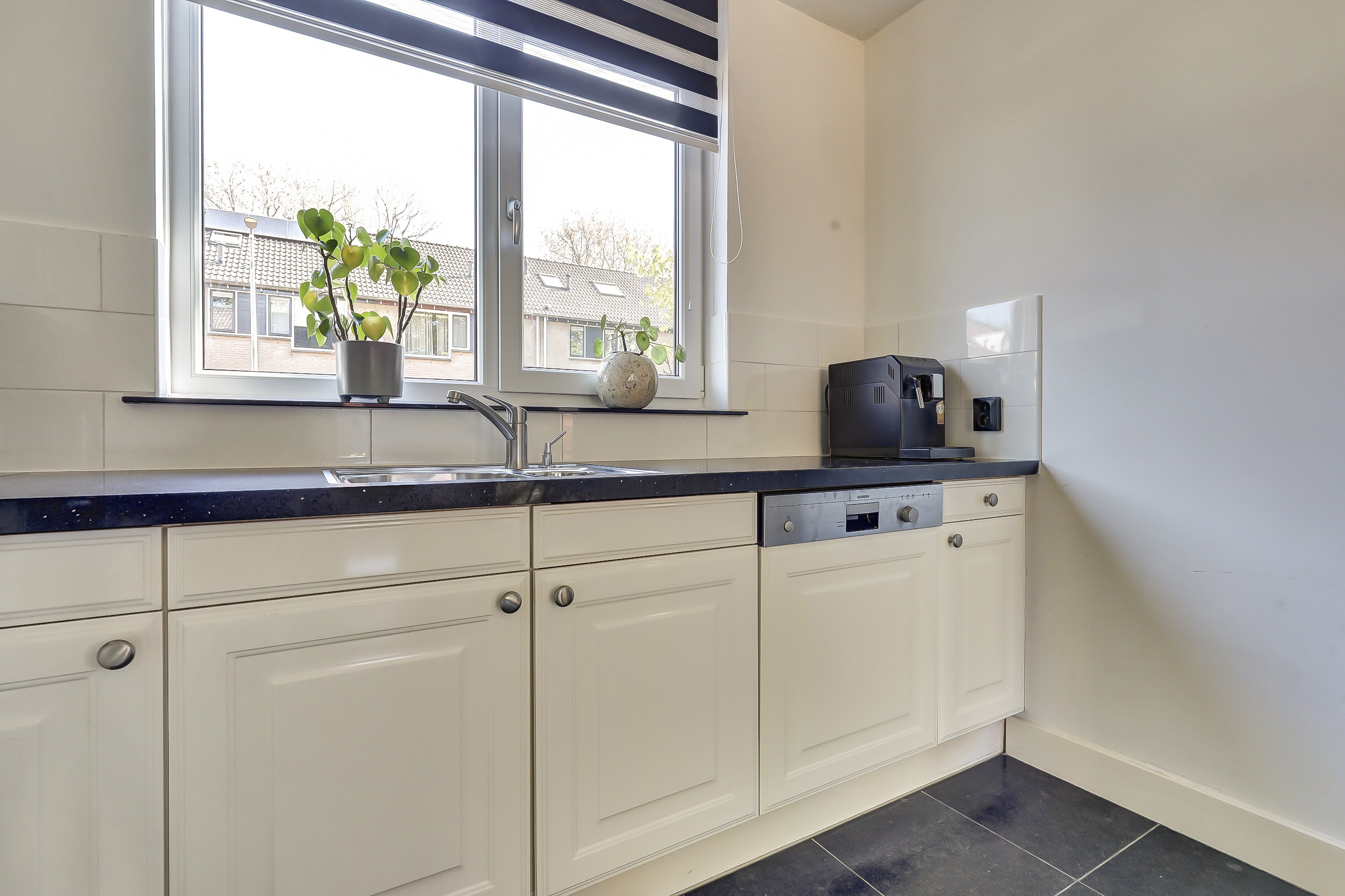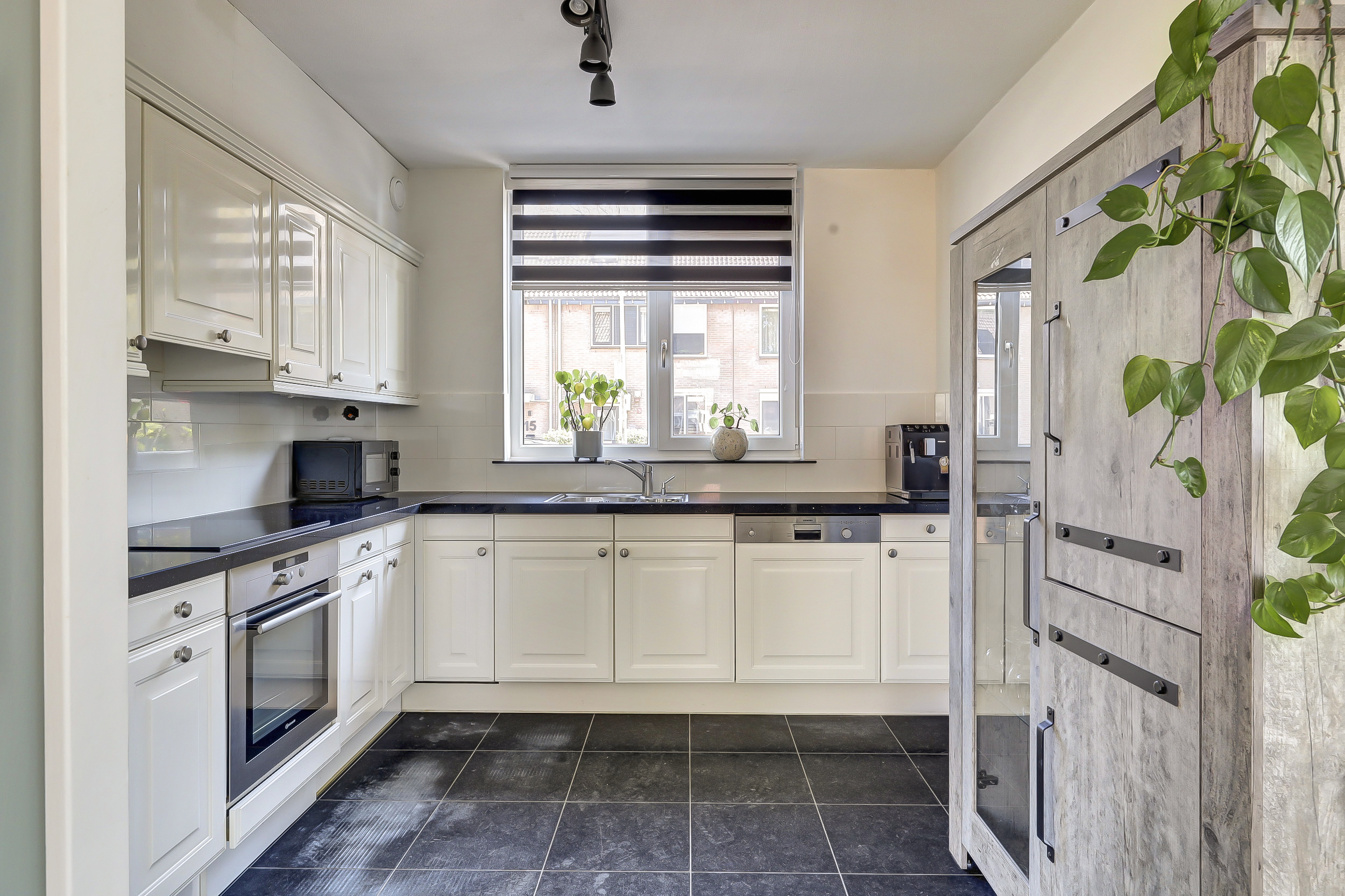 * De open keuken aan de voorzijde is voorzien van een kookplaat, afzuigkap, oven, vaatwasser en een koel/vriescombi.