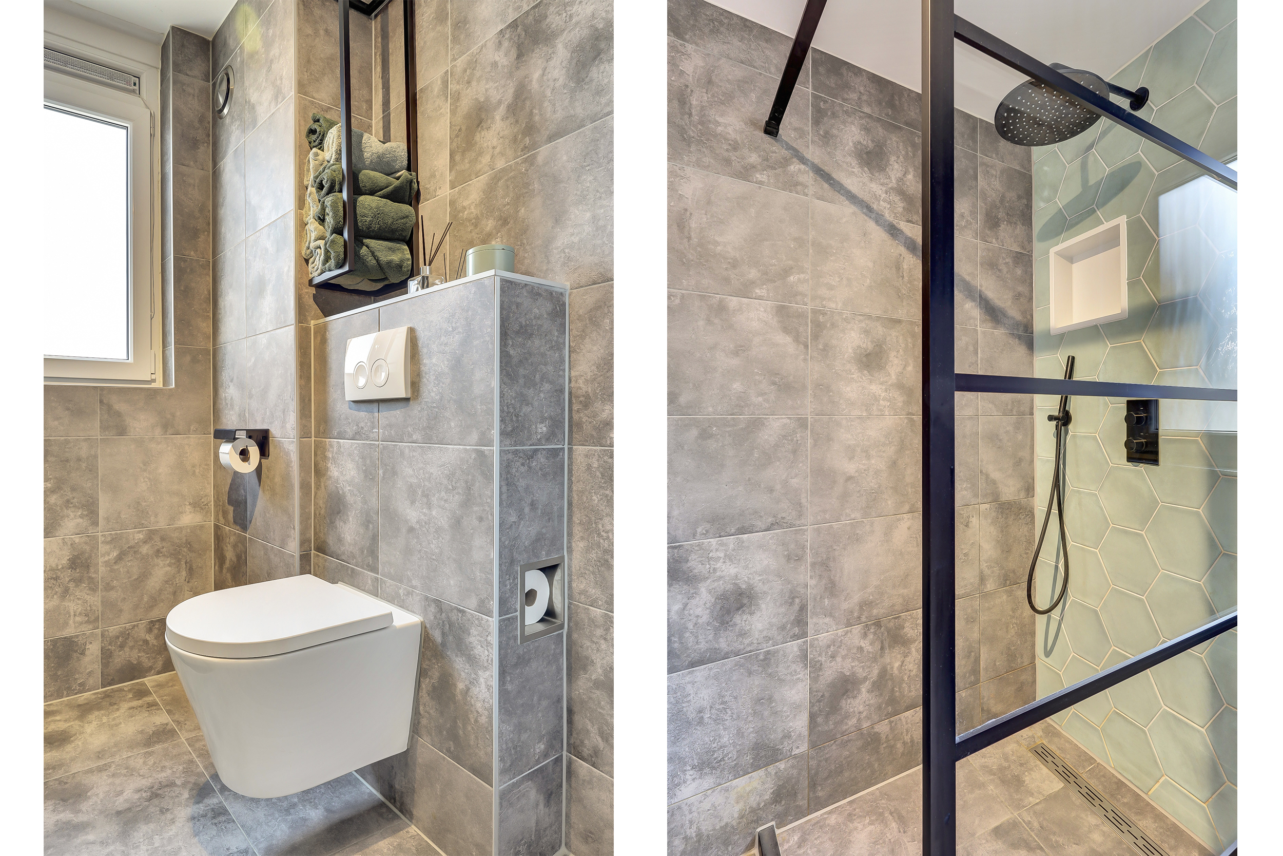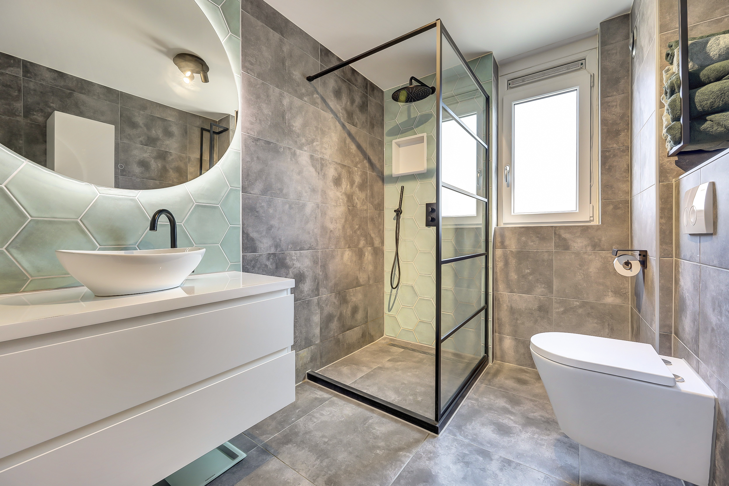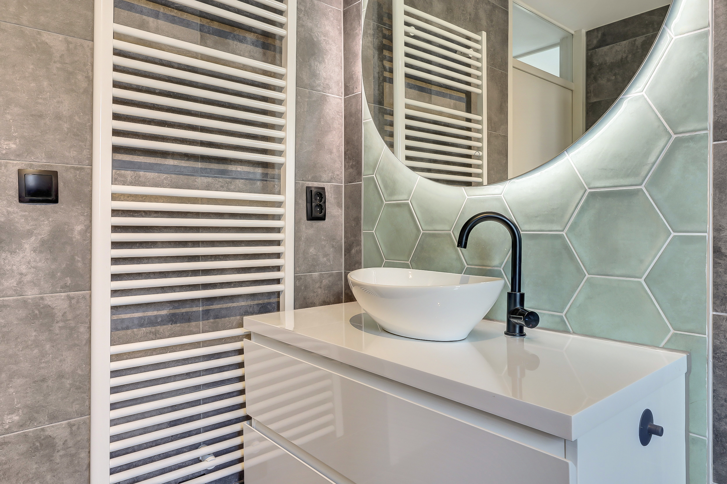 * De moderne badkamer is voorzien van een inloopdouche, wastafelmeubel, toilet en handdoekenradiator.
