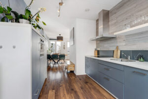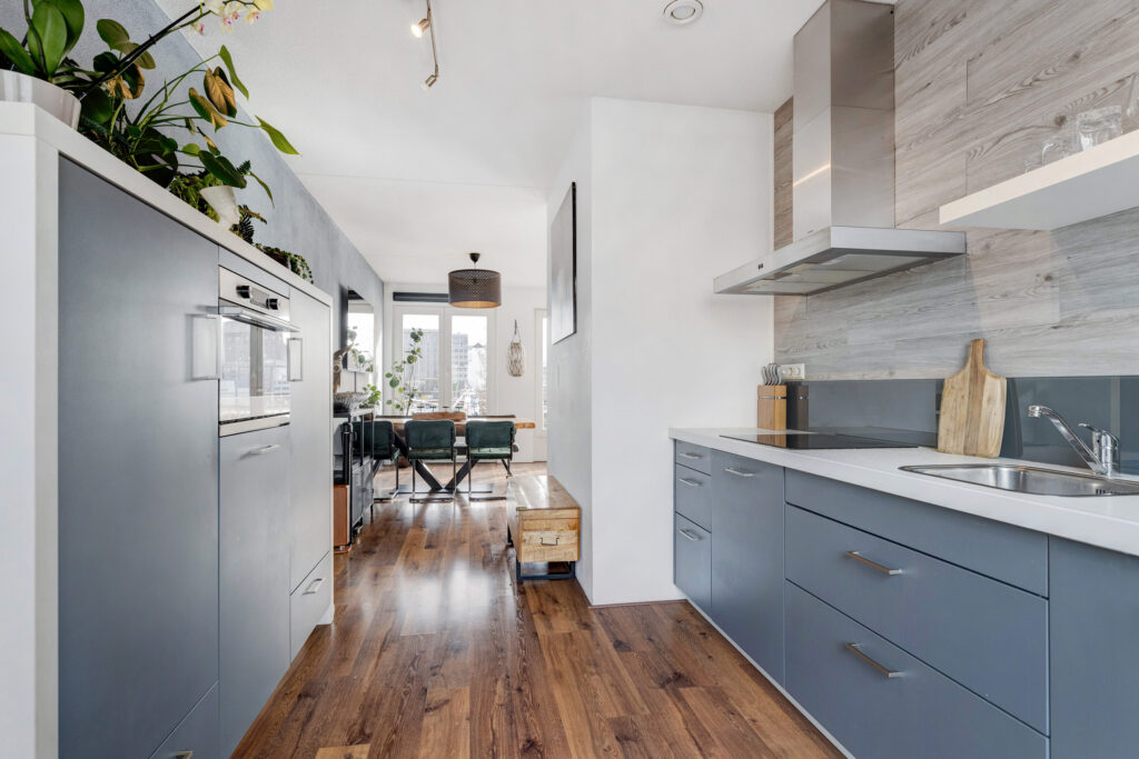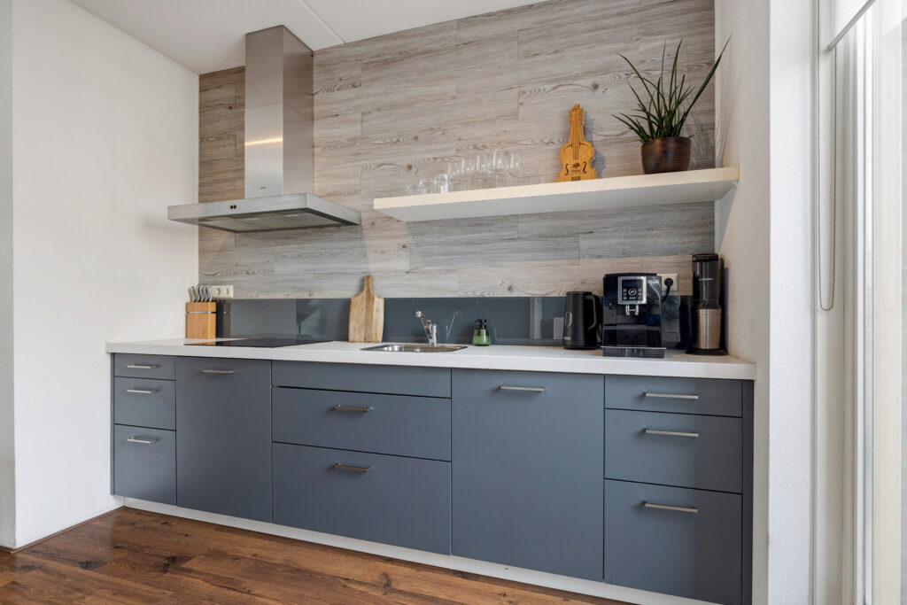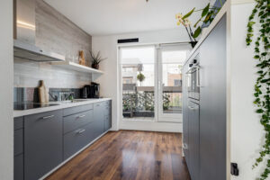 – Moderne, half open keuken aan de achterzijde, voorzien van diverse inbouwapparatuur (inductie kookplaat, afzuigkap, combimagnetron, koelkast, vriezer en een vaatwasser).