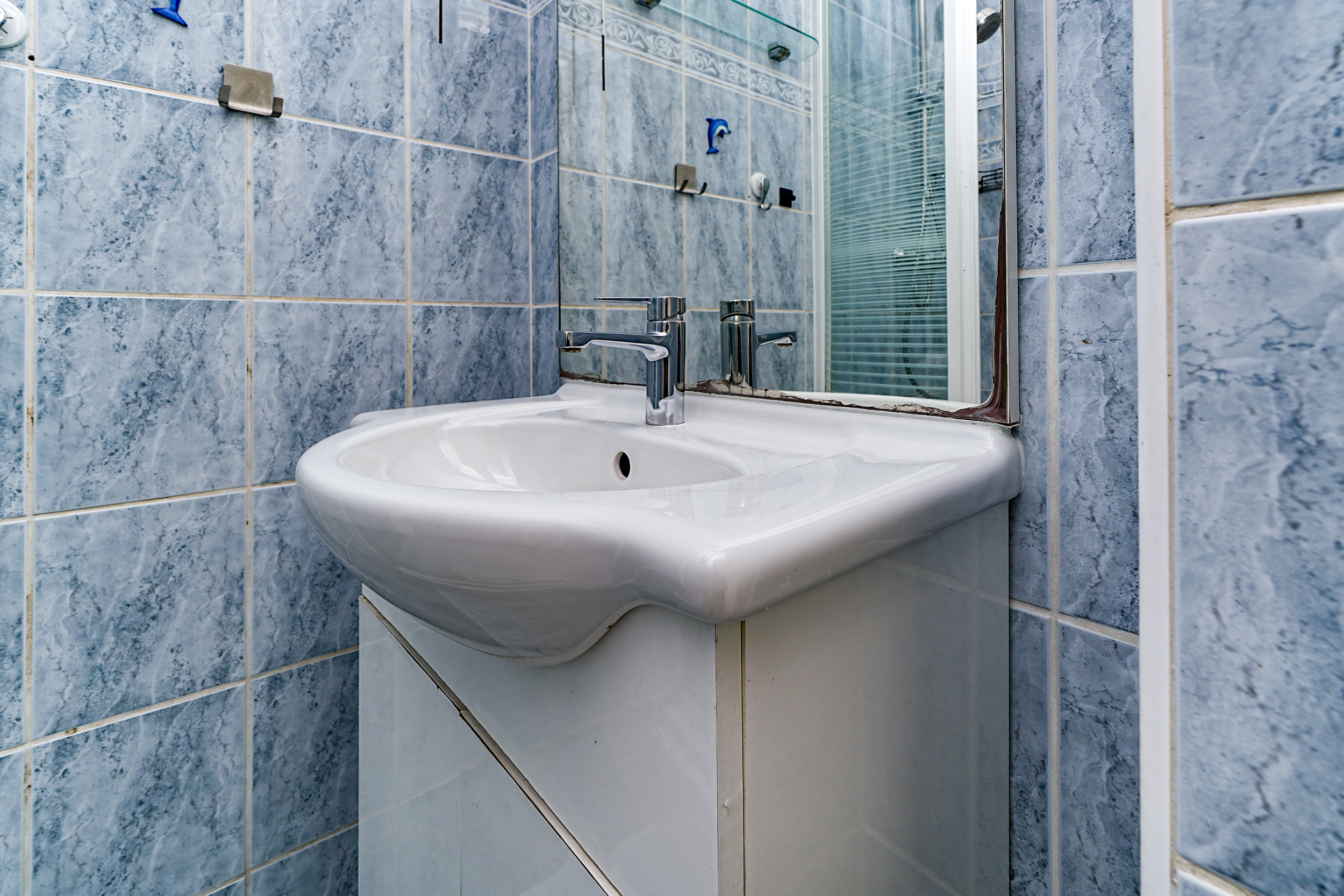 * De badkamer is voorzien van een douchecabine en een wastafelmeubel.