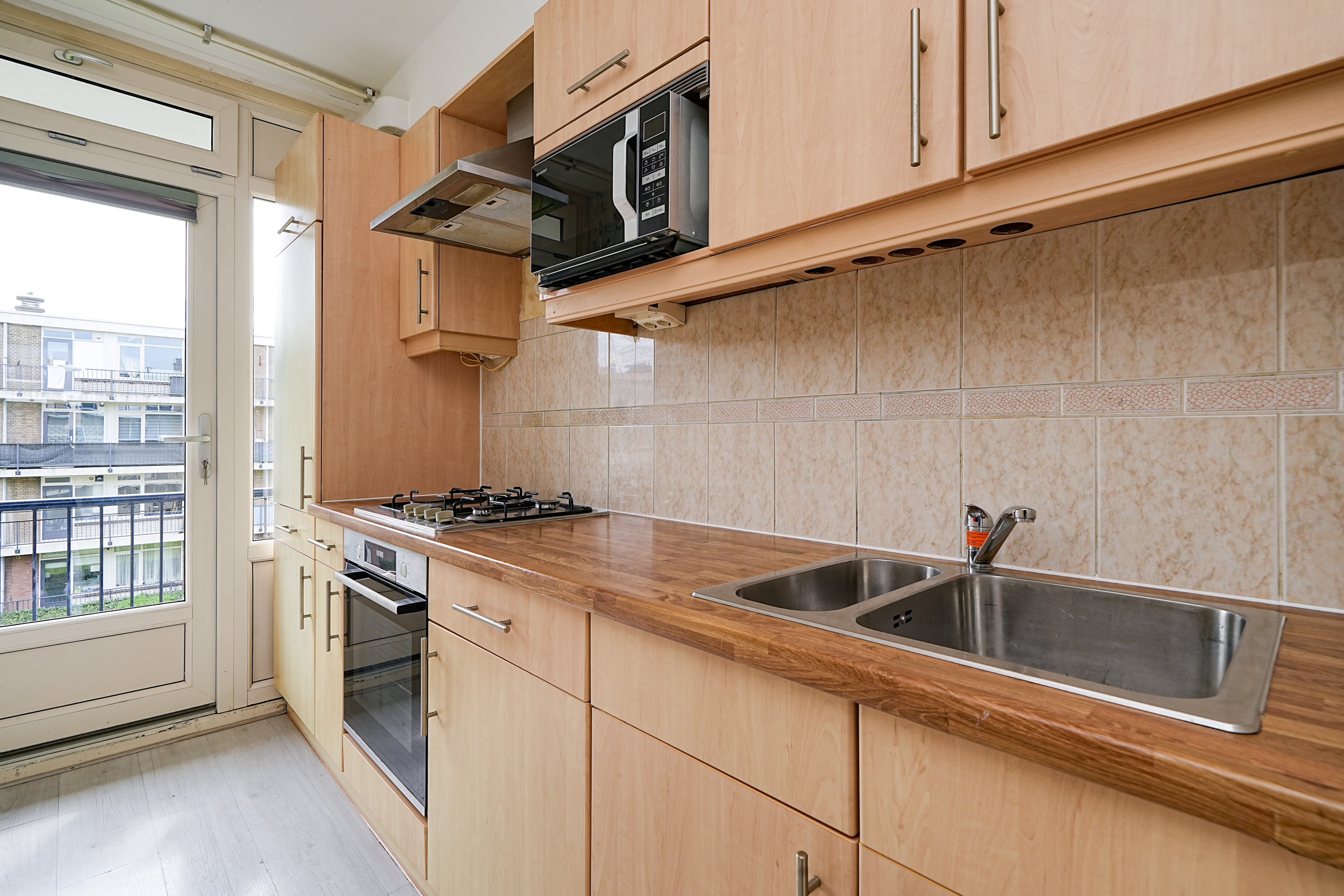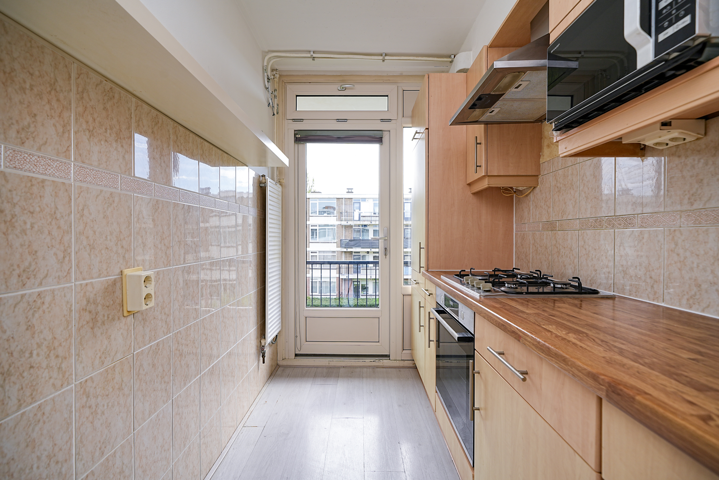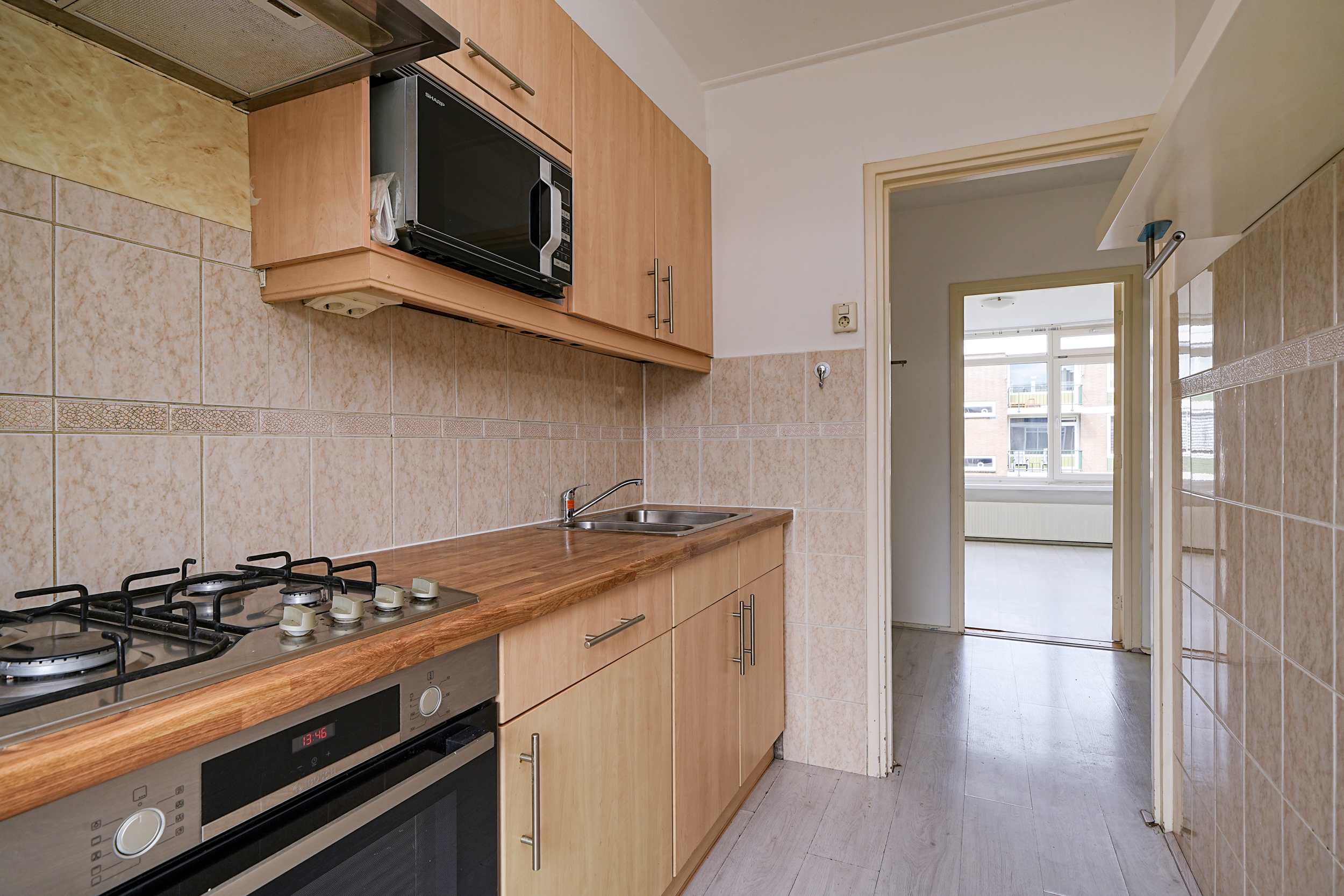 * De keuken bevindt zich aan de achterzijde en is voorzien van een afzuigkap, koelkast, gaskookplaat, magnetron, oven en biedt toegang tot het balkon.