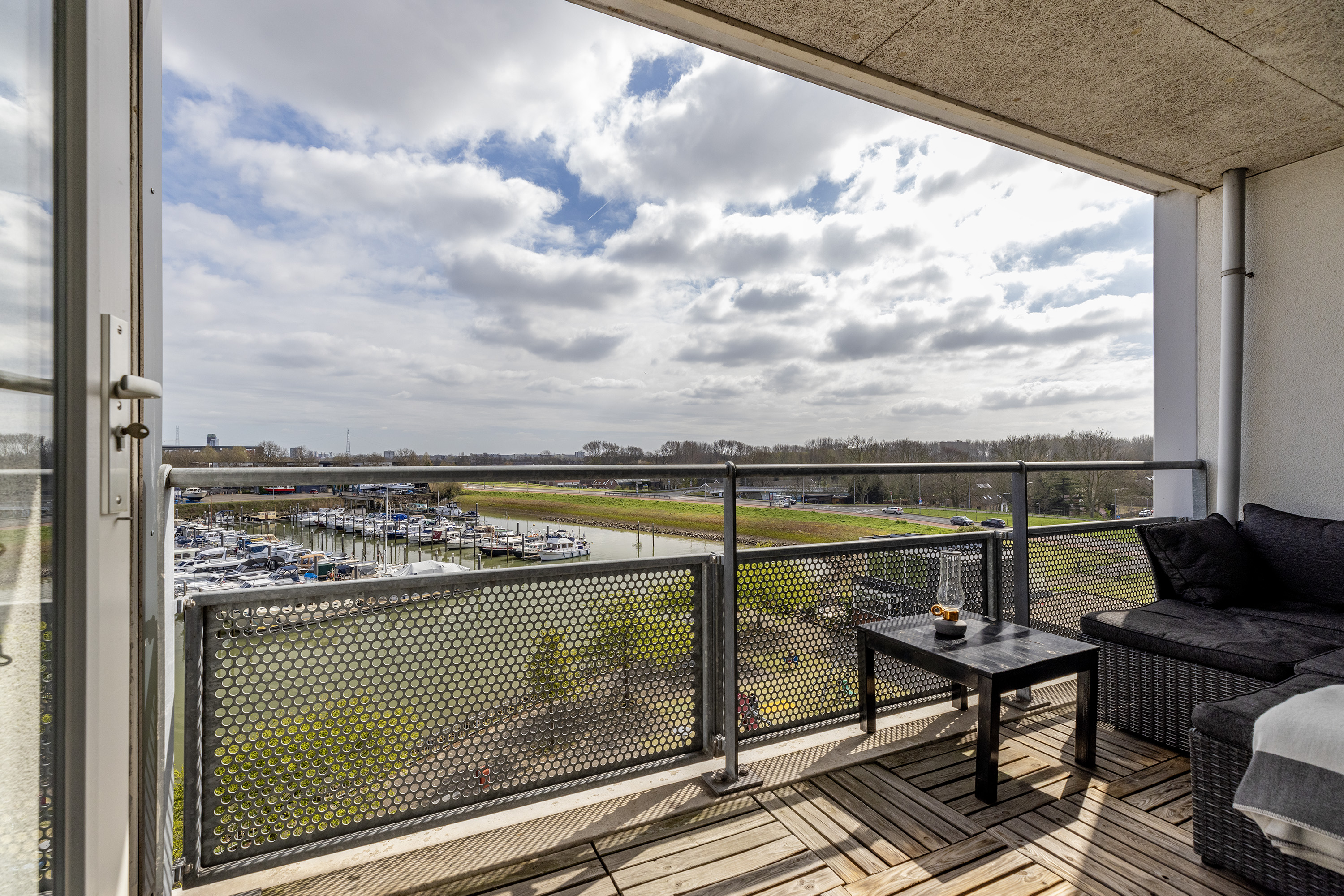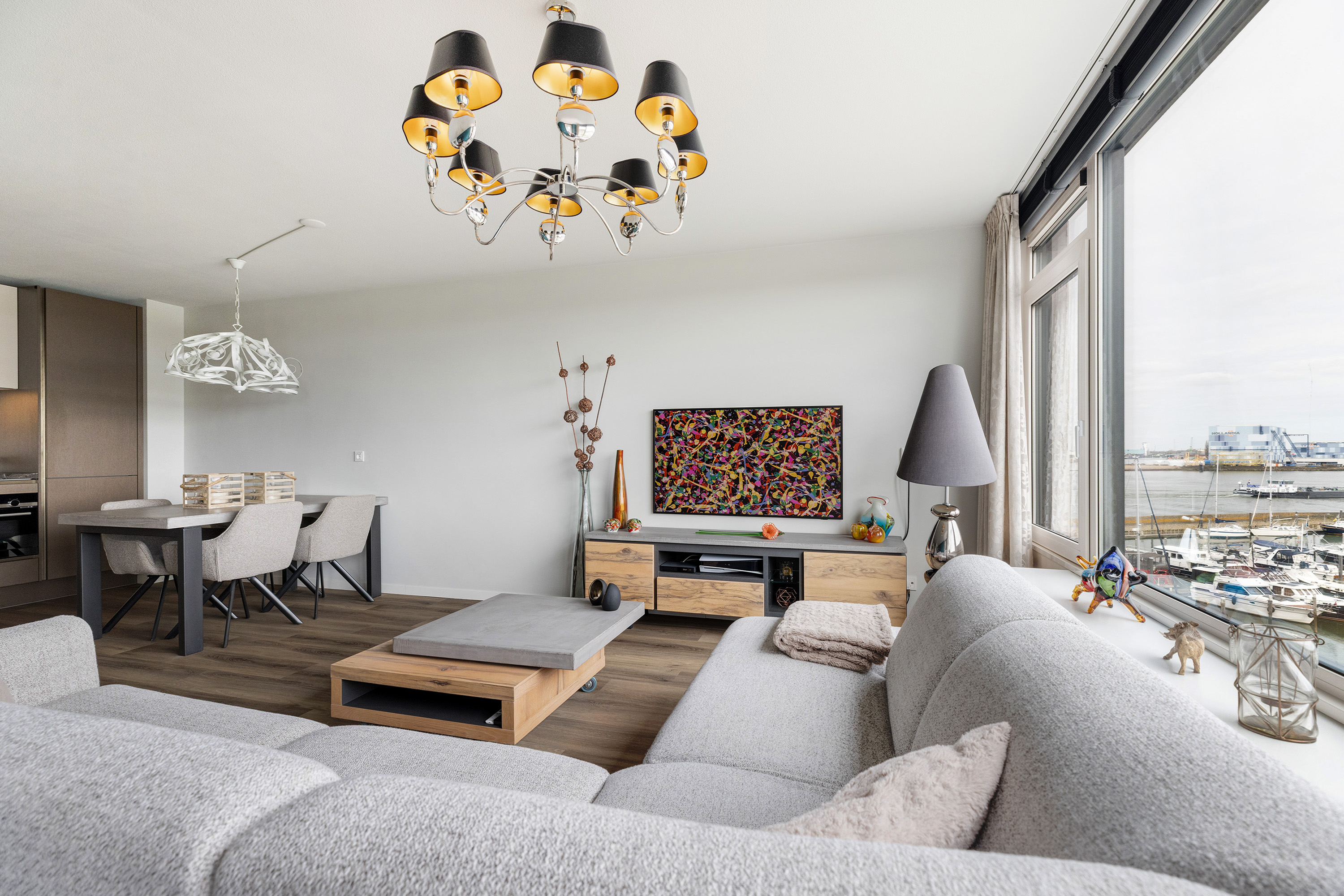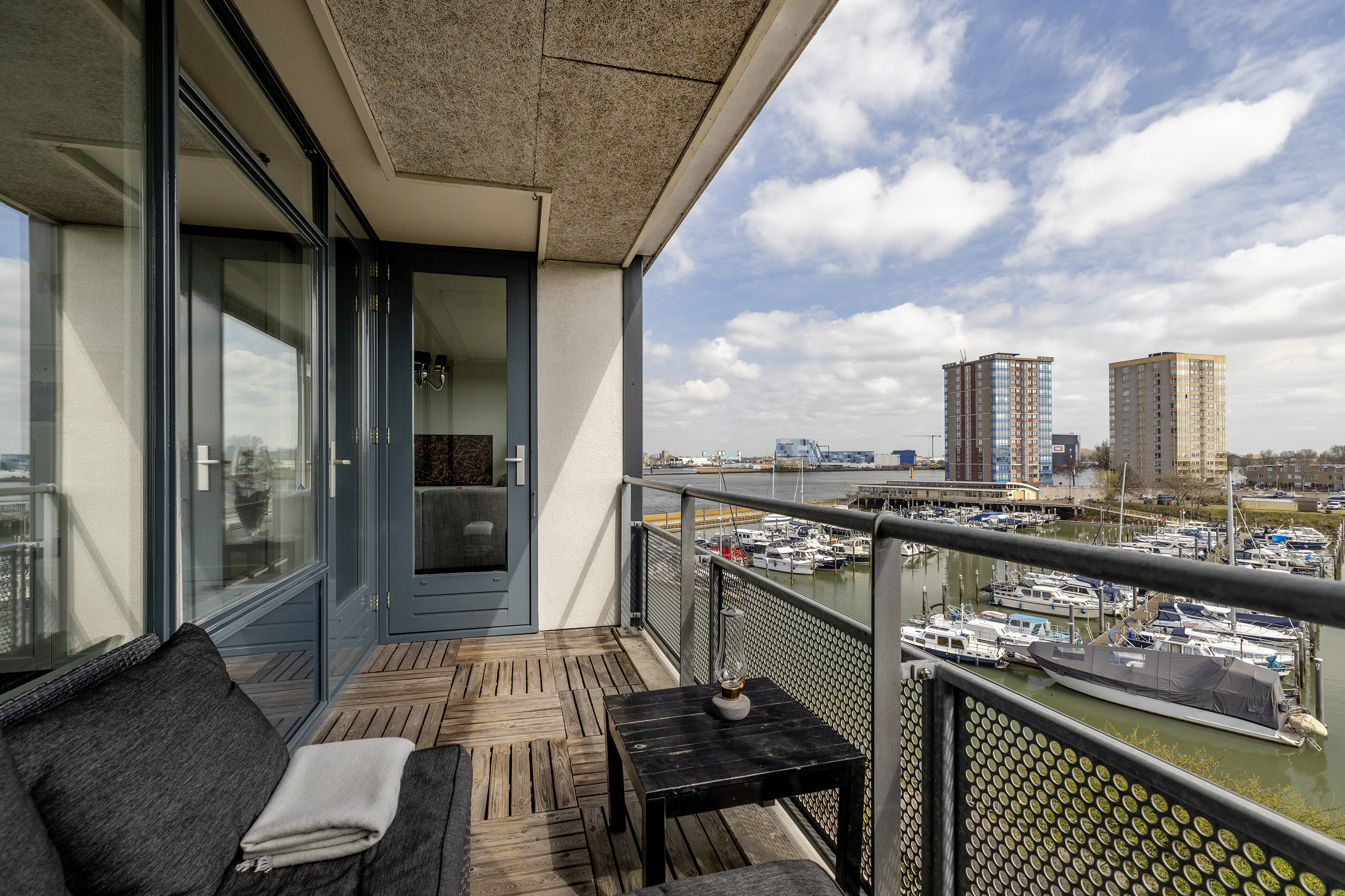* Lichte woonkamer met open keuken en toegang tot het balkon met uitzicht over de jachthaven;