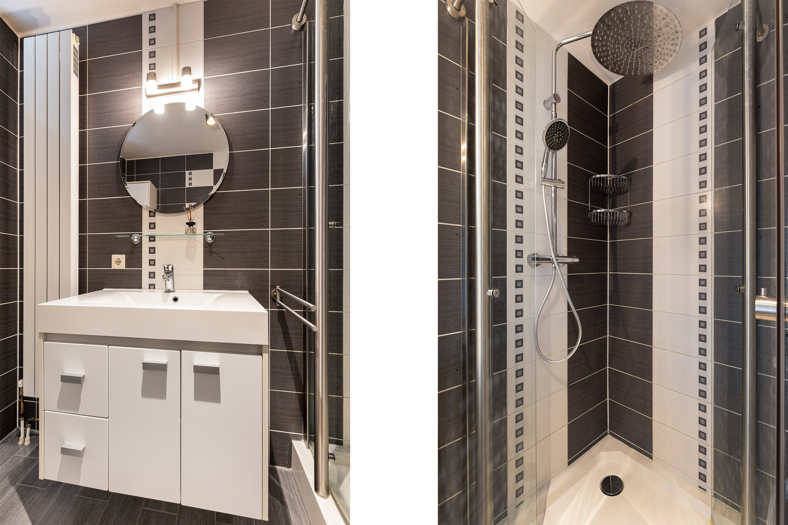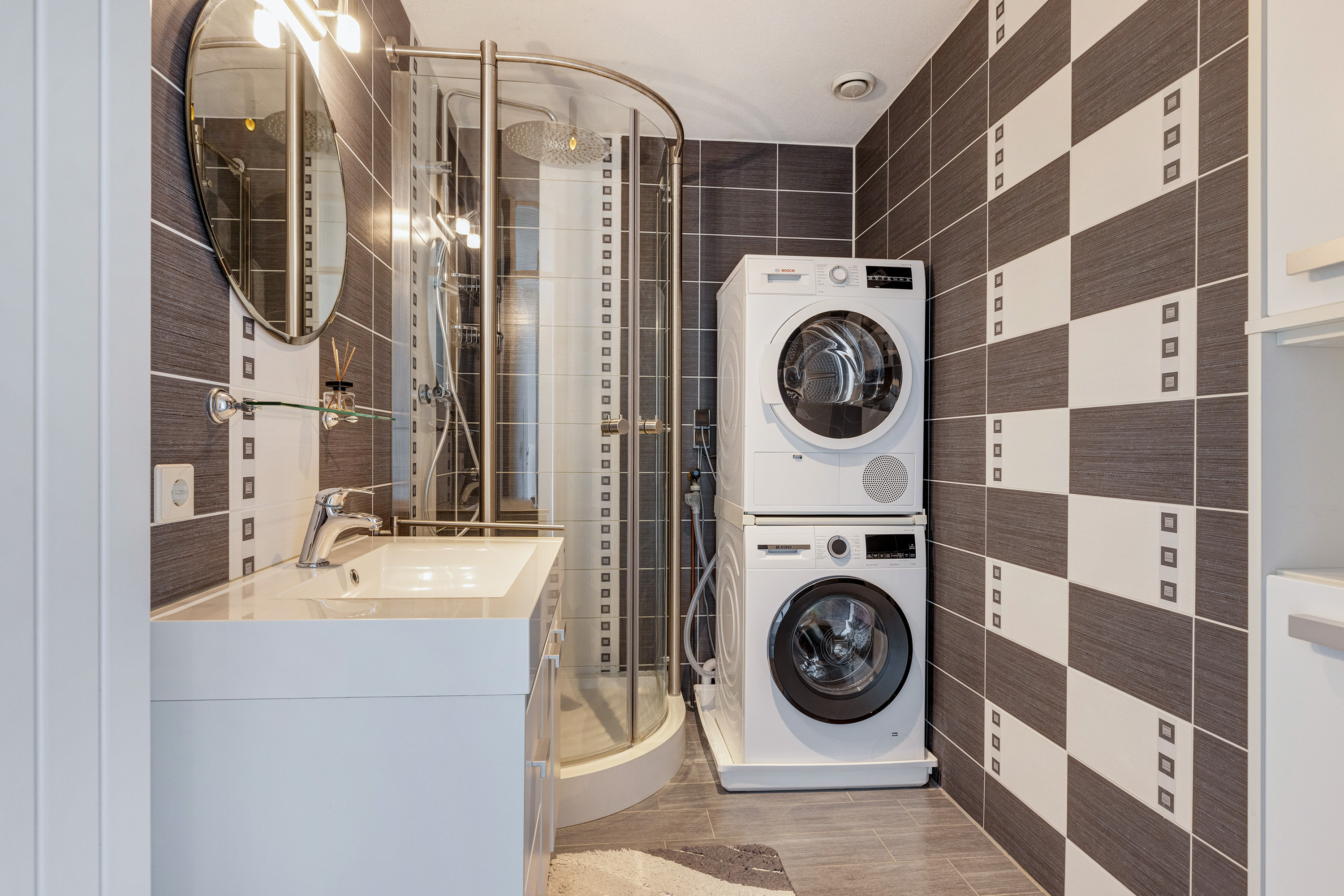 * Badkamer met douchecabine, wastafelmeubel en opstelling voor wasmachine en droger;