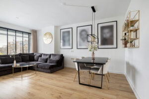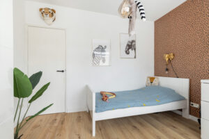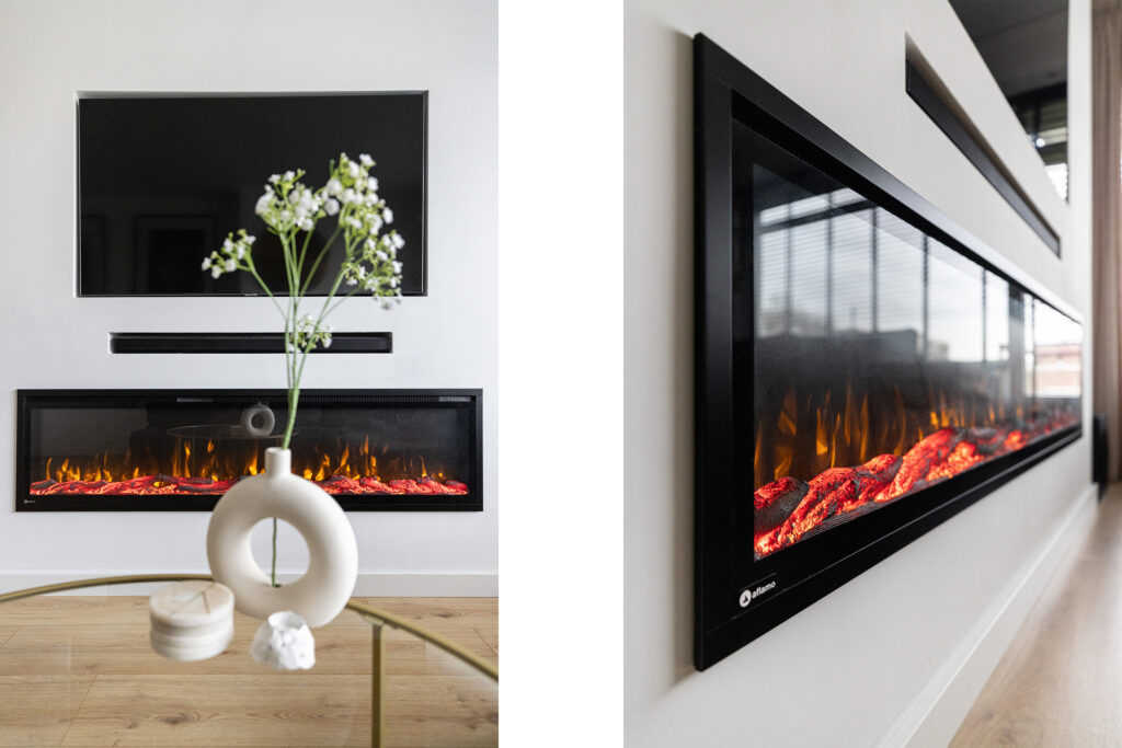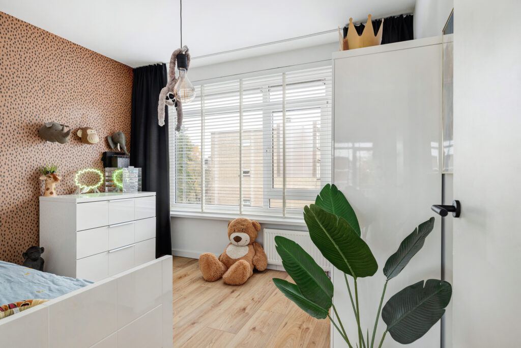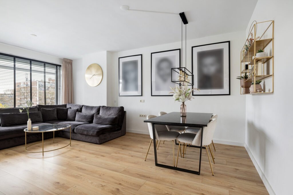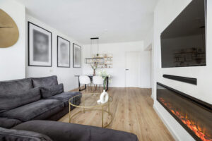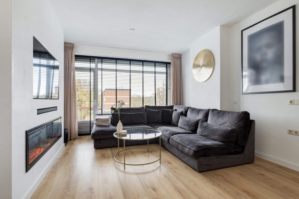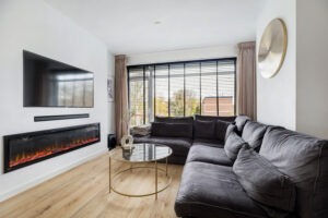 * De ruime woonkamer is voorzien van een cinewall met sfeerhaard. Dankzij de grote raampartijen is er veel lichtinval en de woonkamer geeft toegang het toilet, het balkon aan de voorzijde en één van de slaapkamers.