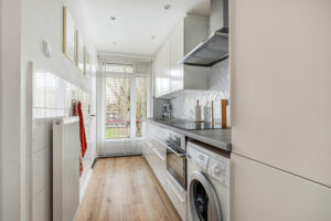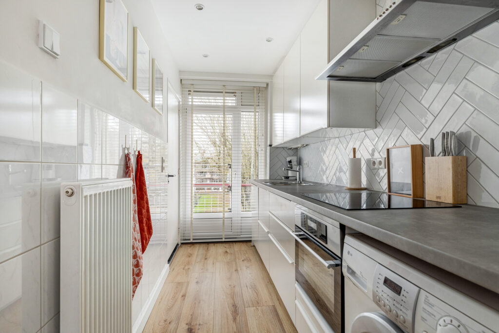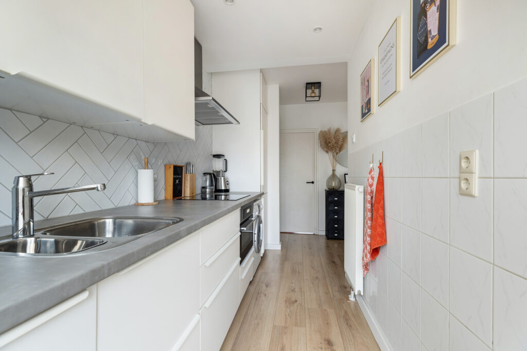 * De keuken (2021) is voorzien van een inductiekookplaat, afzuigkap, combimagnetron, vriezer, vaatwasser en een koelkast. Tevens bevindt zich in de keuken de wasmachineaansluiting. De keuken geeft tevens toegang tot het balkon aan de achterzijde en de badkamer.