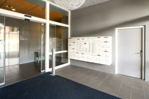 * De centrale entree met brievenbussen, bellentableau, lift en de trapopgang;