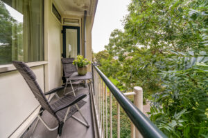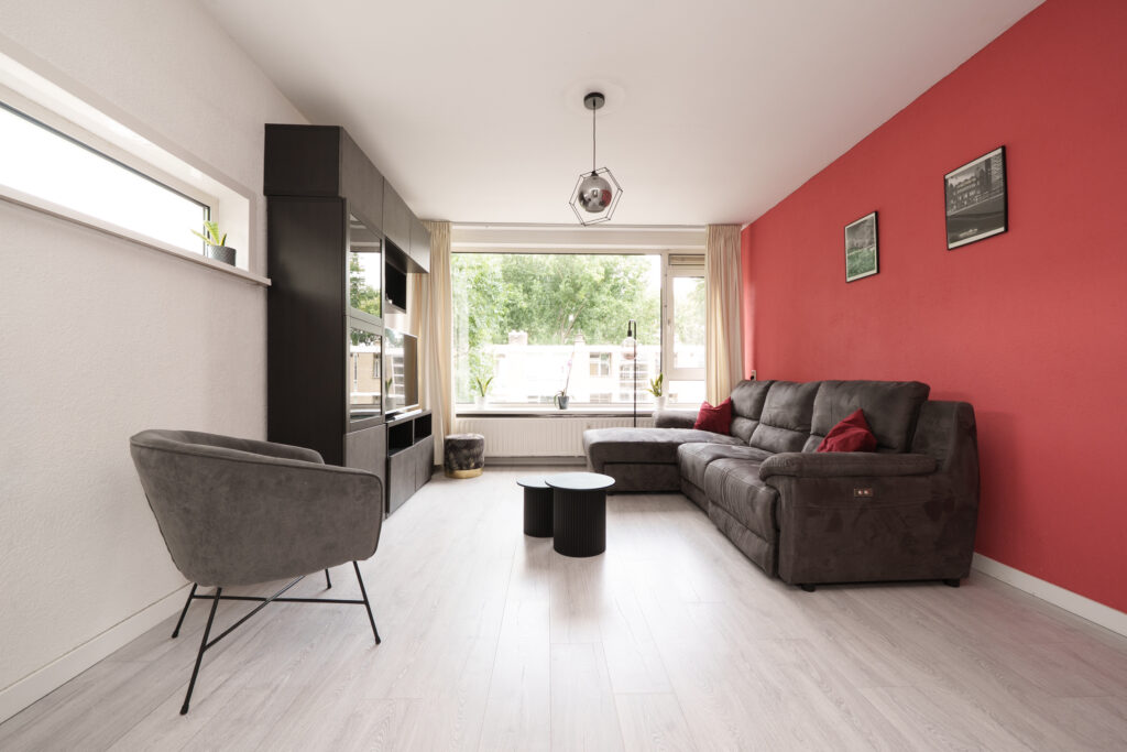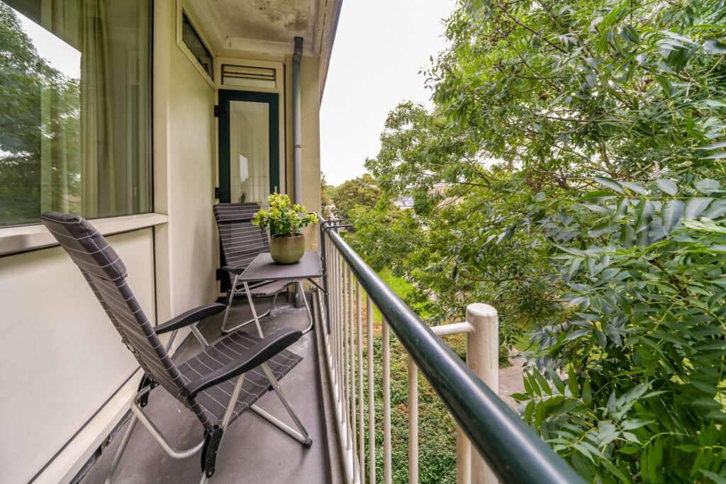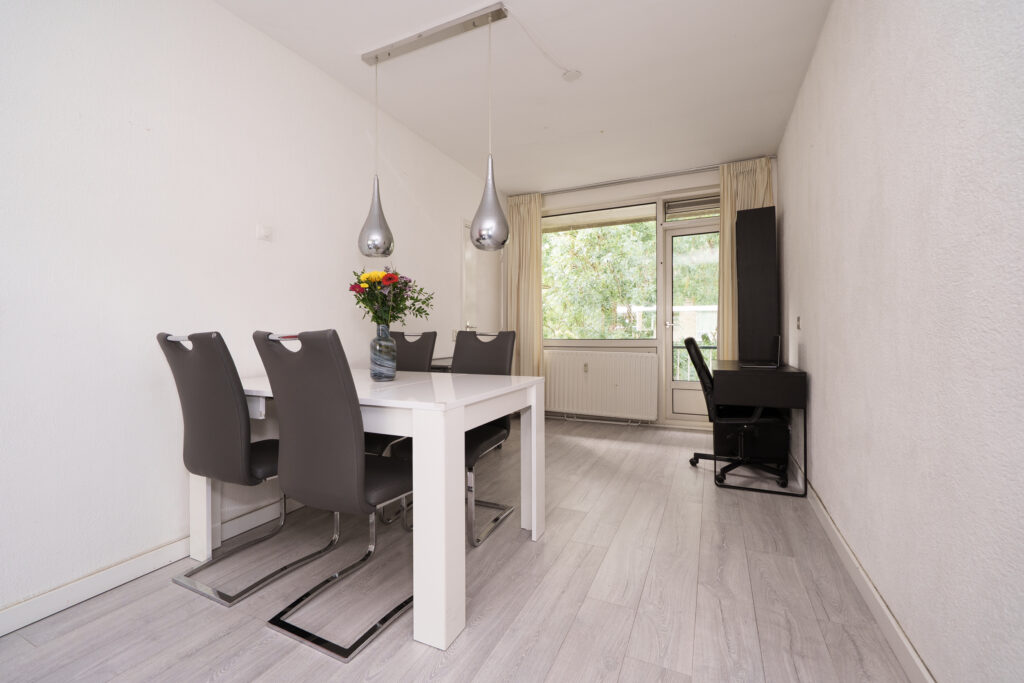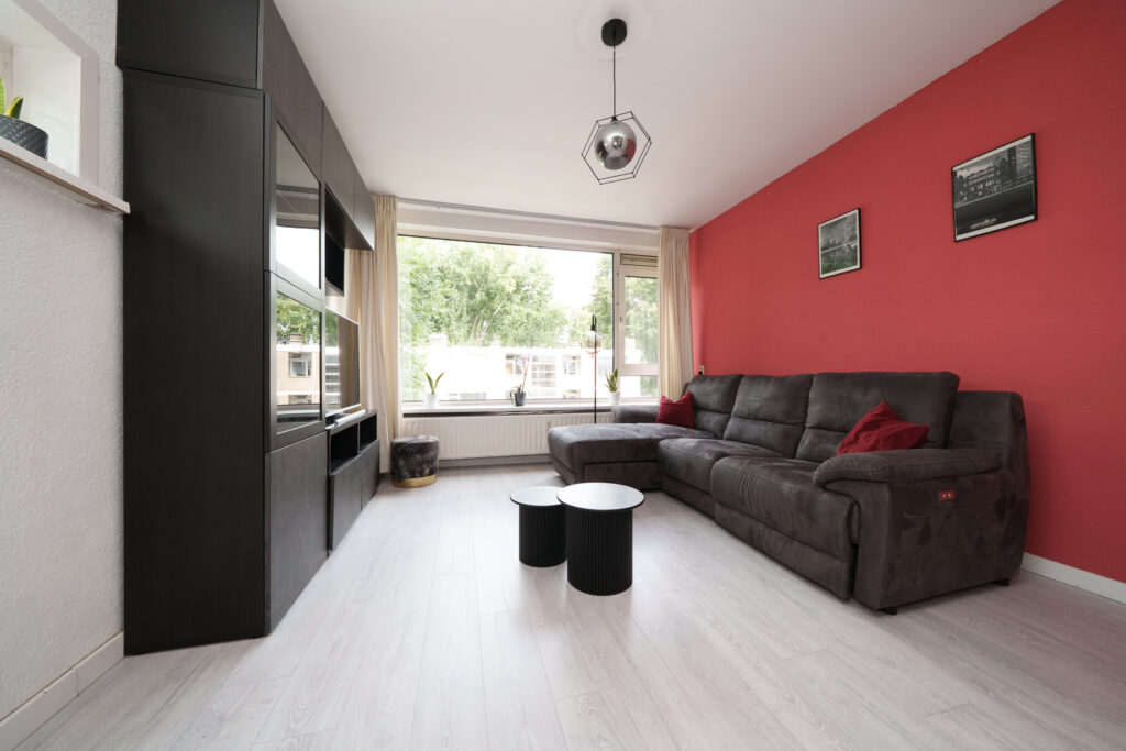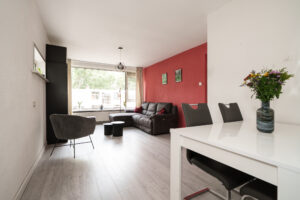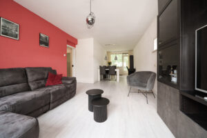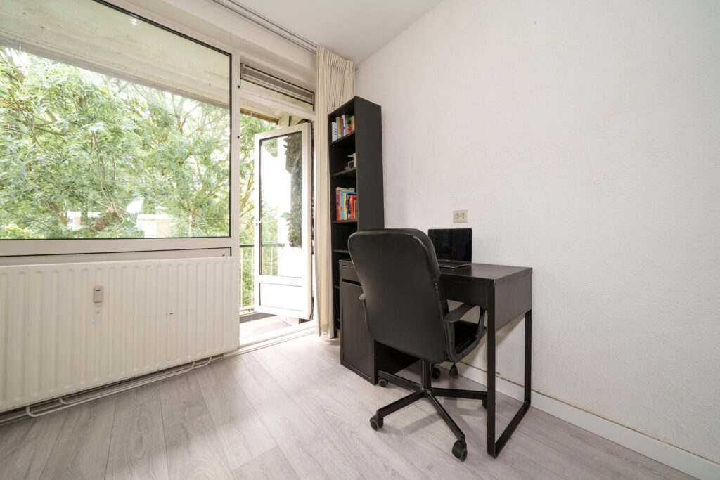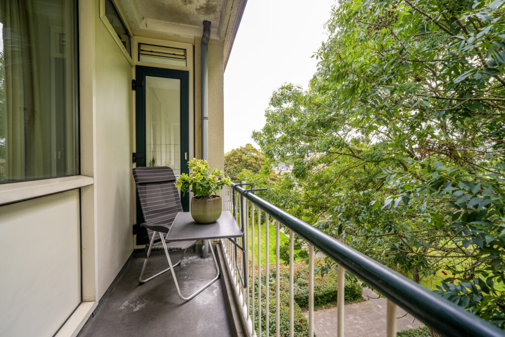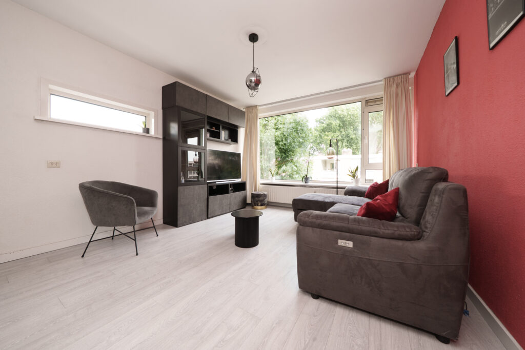 * Ruime en doorzon woonkamer met aan de achterzijde toegang tot de badkamer en het balkon.