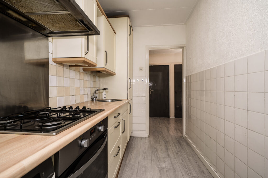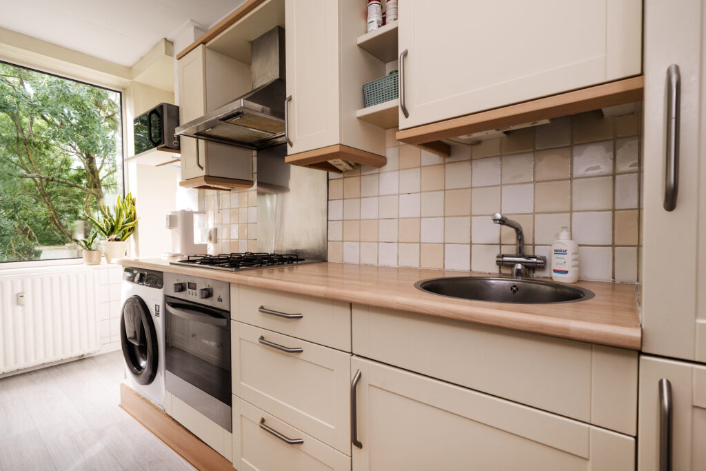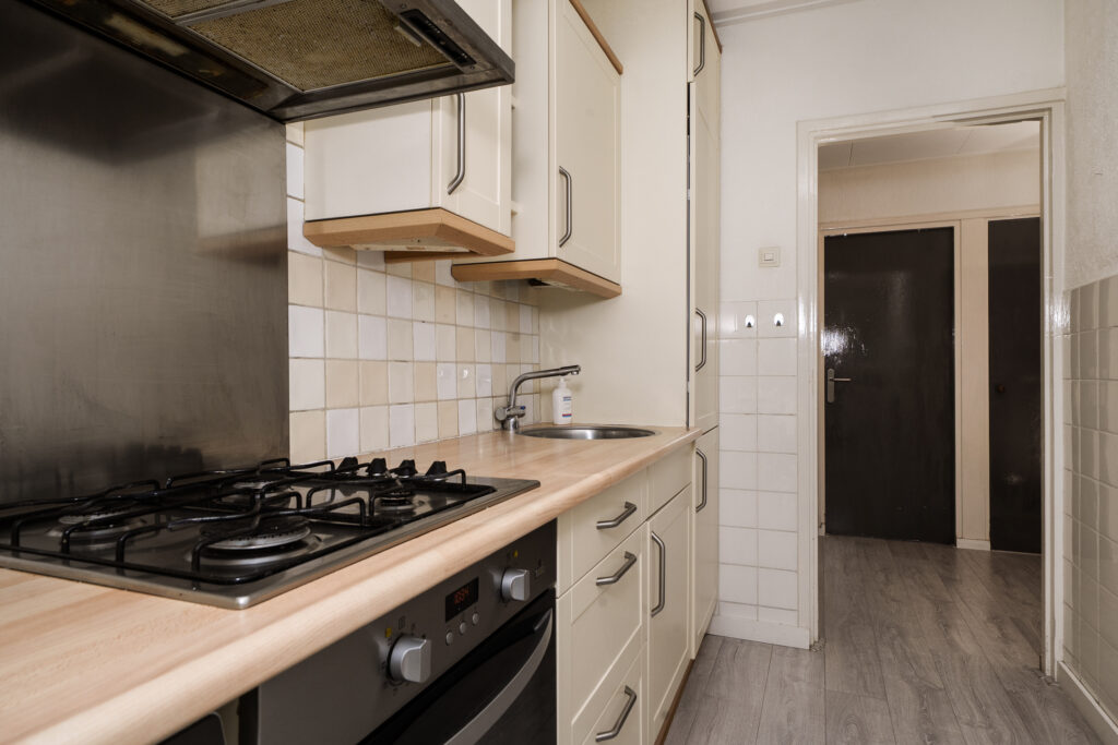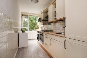 * De keuken is aan de achterzijde gelegen en voorzien van gaskookplaat, afzuigkap, vriezer, oven en een koelkast. Tevens bevindt zich in de keuken de wasmachineaansluiting. Vanuit de keuken is er toegang tot het balkon.