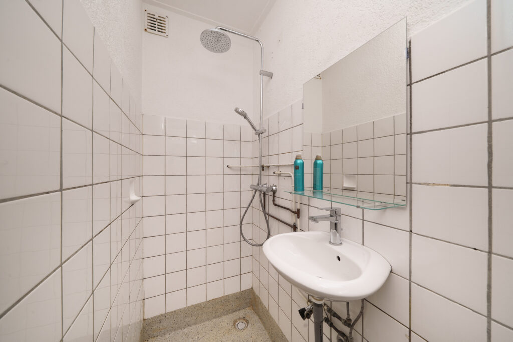* De badkamer is voorzien van een douche en wastafel.