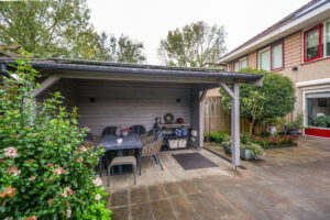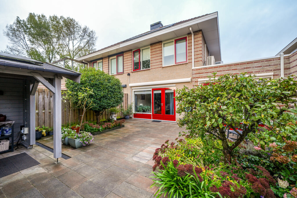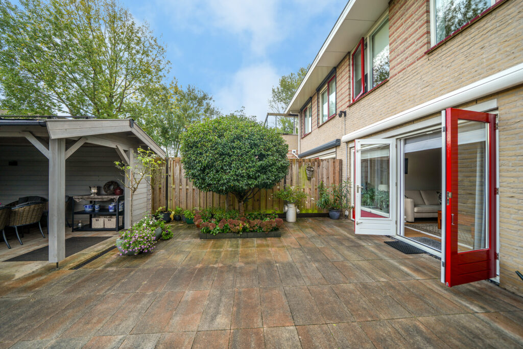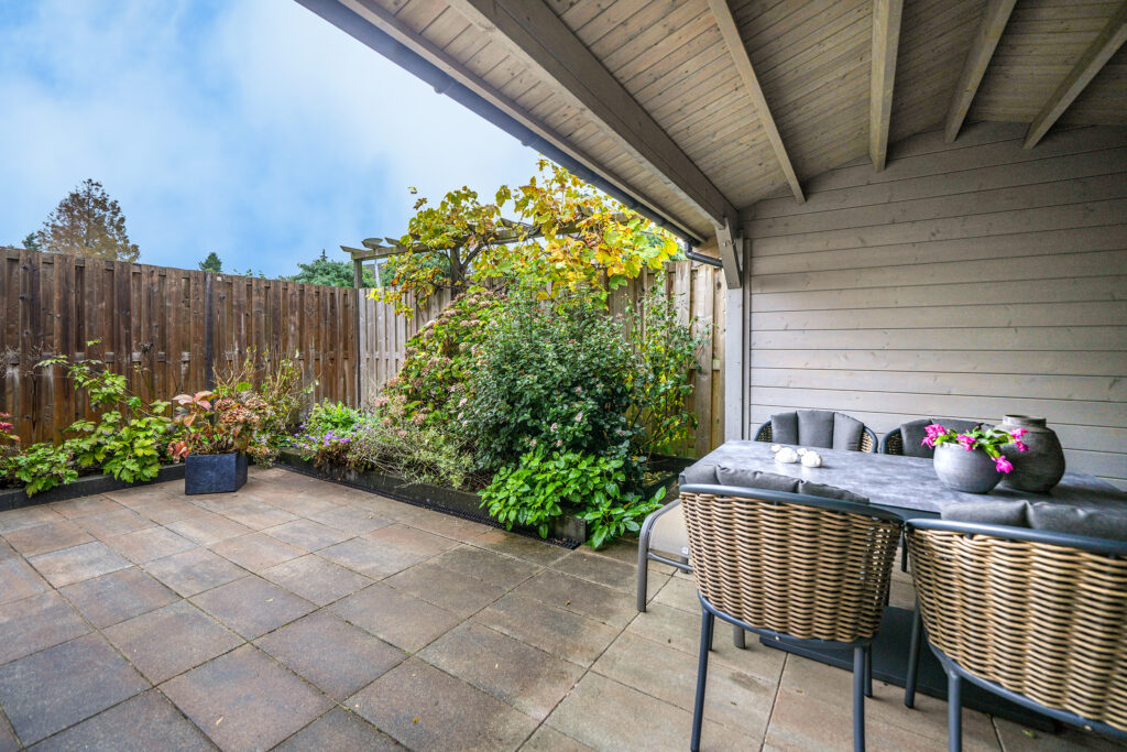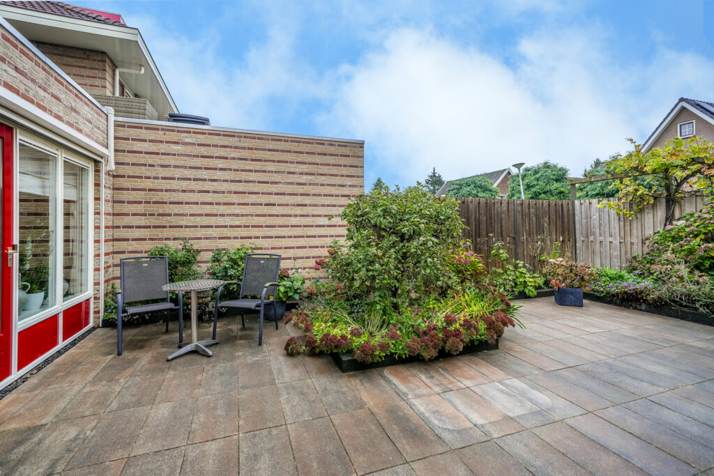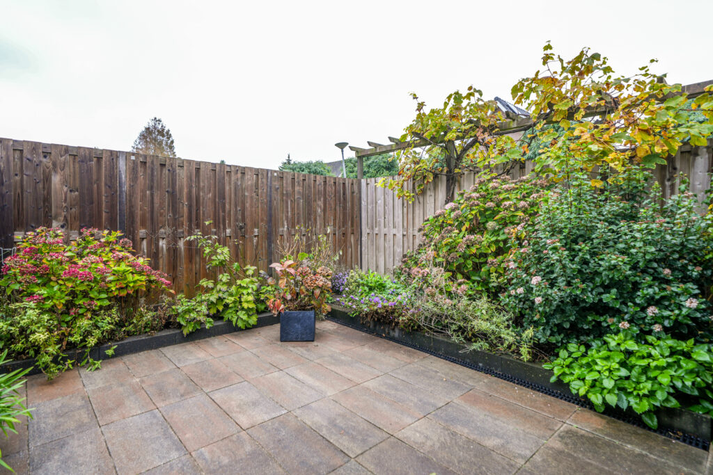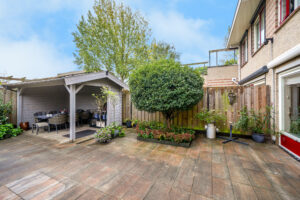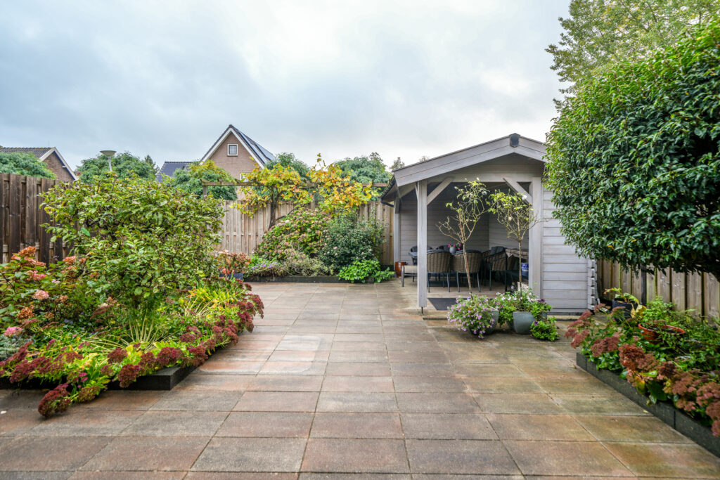 De achtertuin is op het Oosten gelegen en voorzien van een ruimt terras en diverse borders met vaste beplanting. Ook heeft de tuin een fraaie overkapping waarin het op zwoele zomeravonden heerlijk vertoeven is.