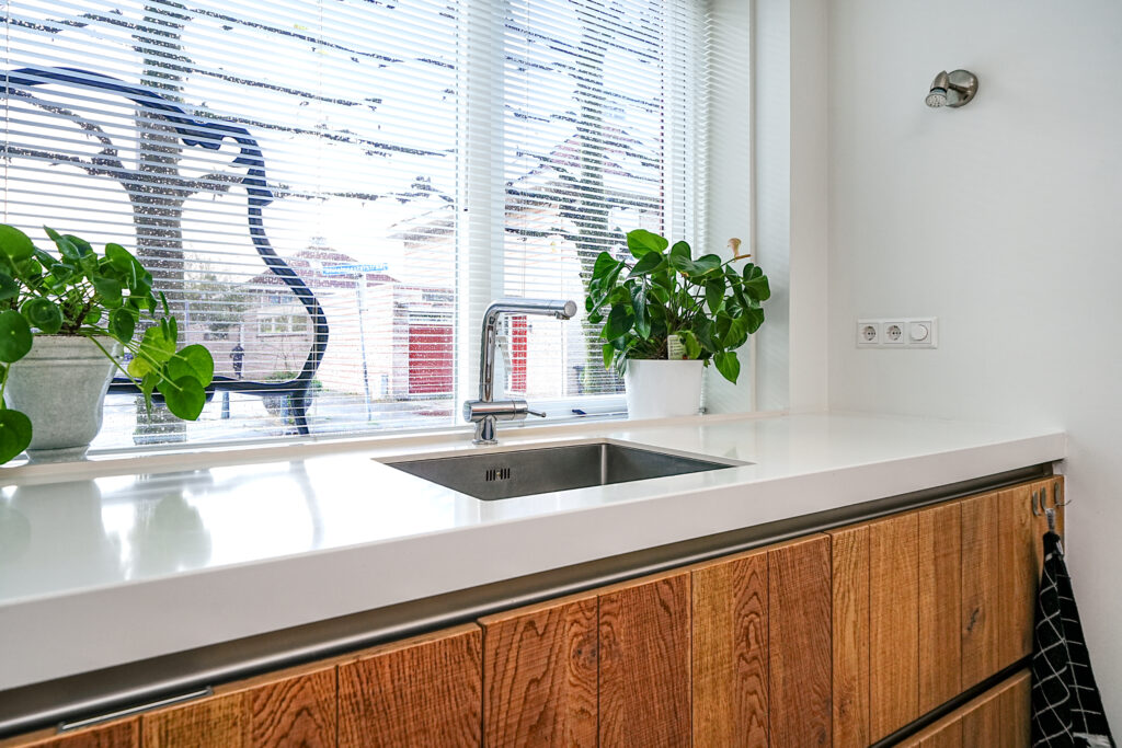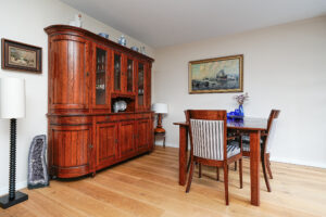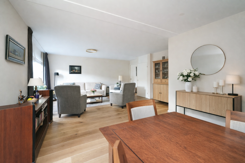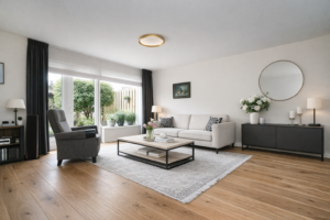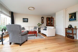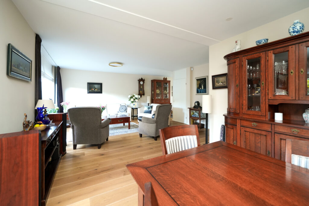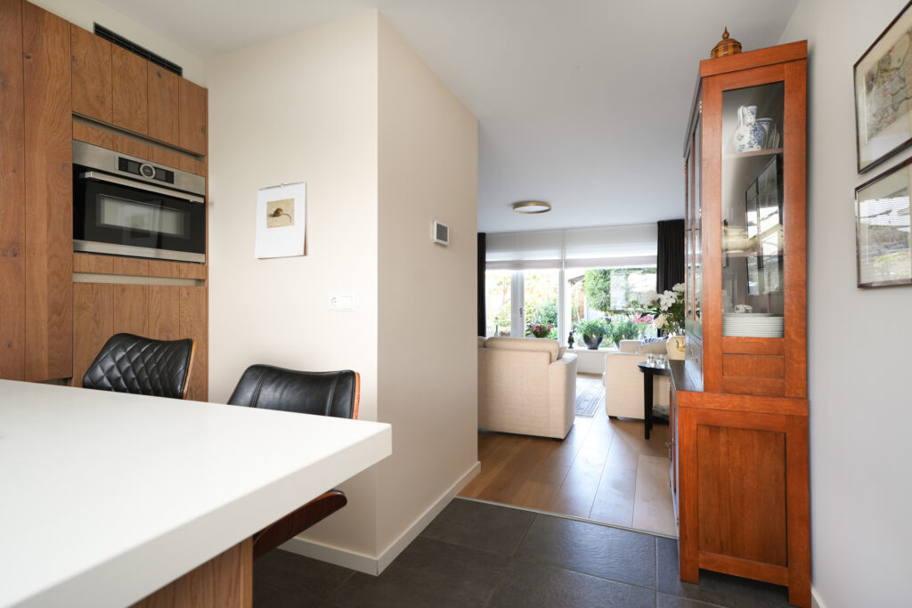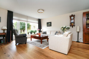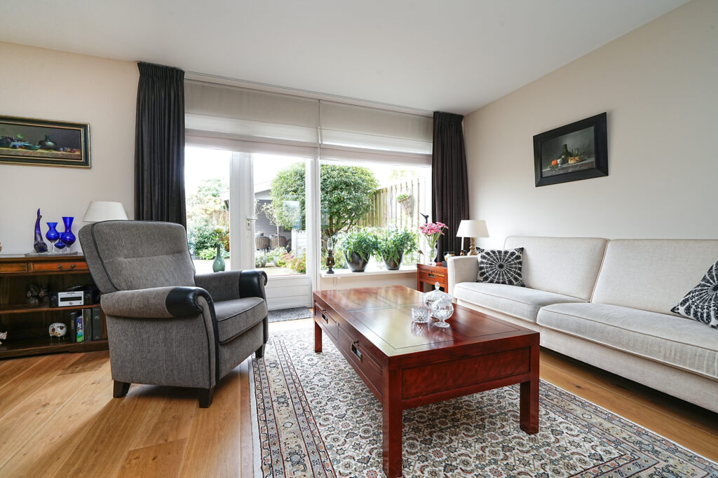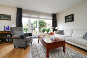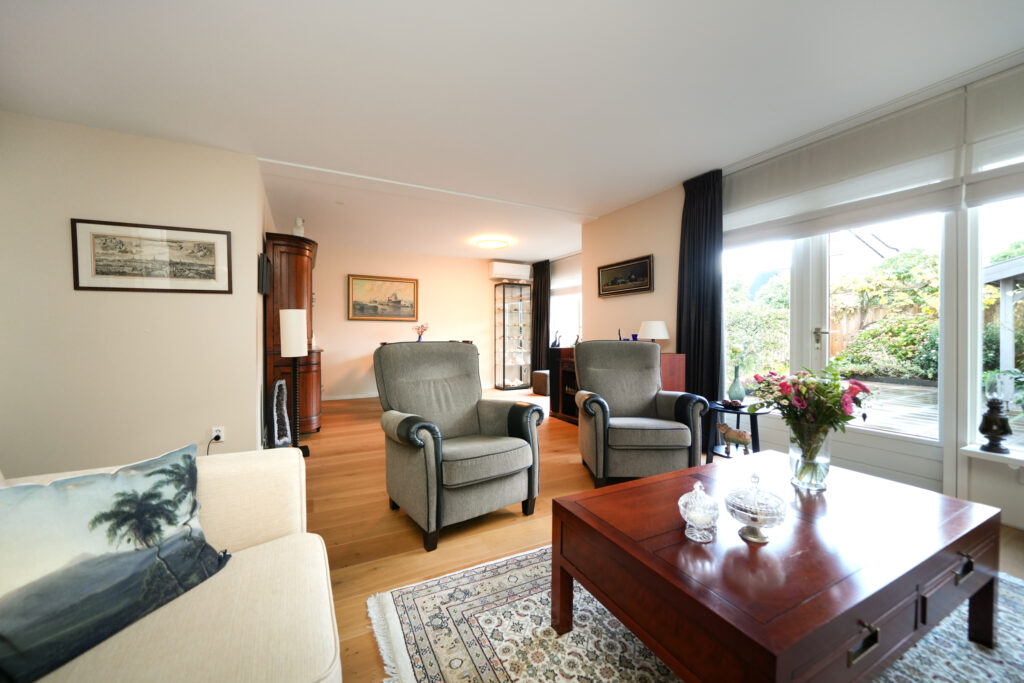– Royale L-vormige woonkamer aan de achterzijde met openslaande deuren naar de achtertuin. De woonkamer is voorzien van fraaie eiken vloerdelen met vloerverwarming, heeft een strakke wandafwerking en is voorzien van airco;