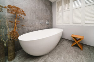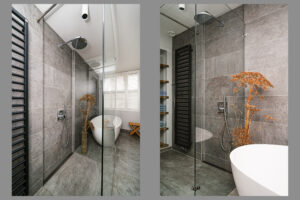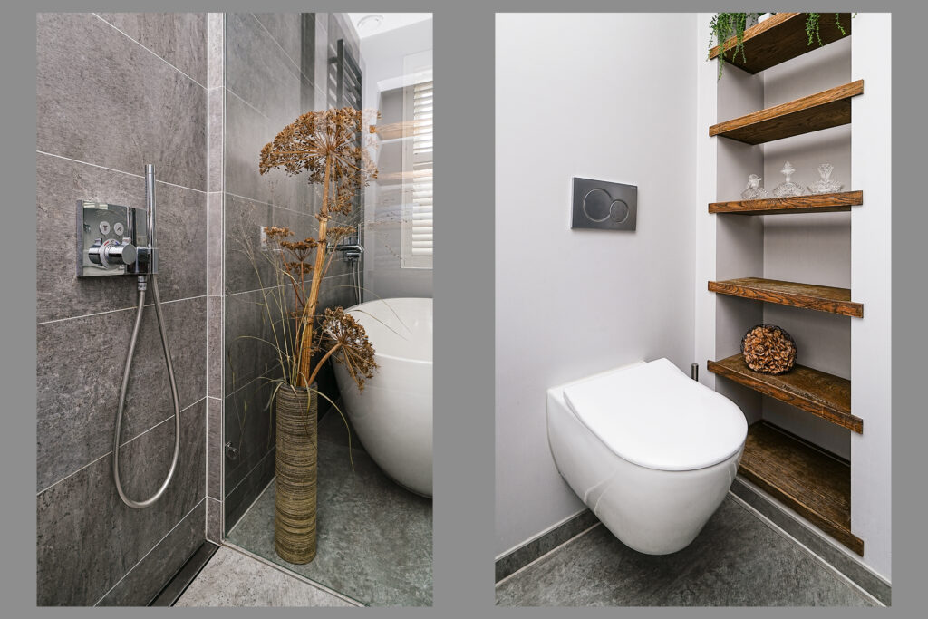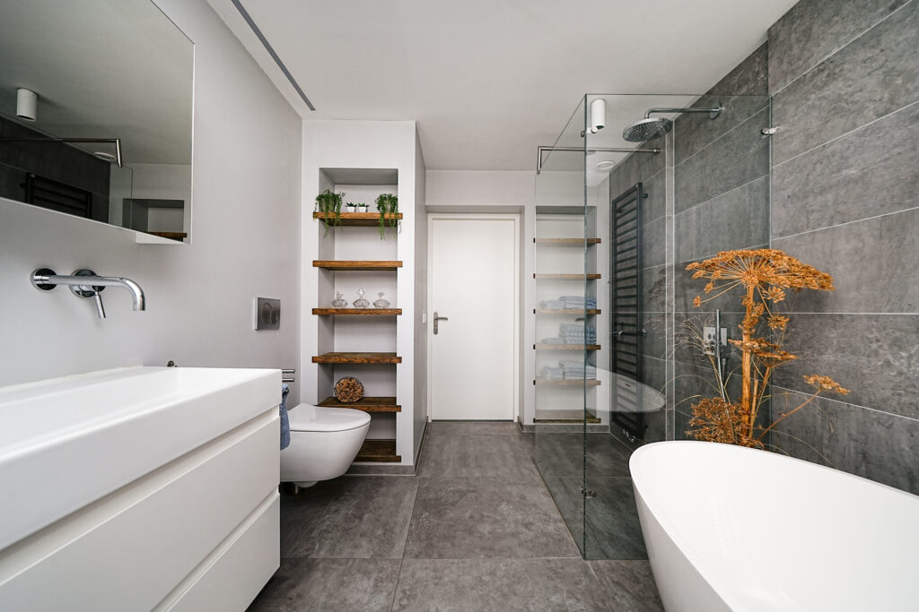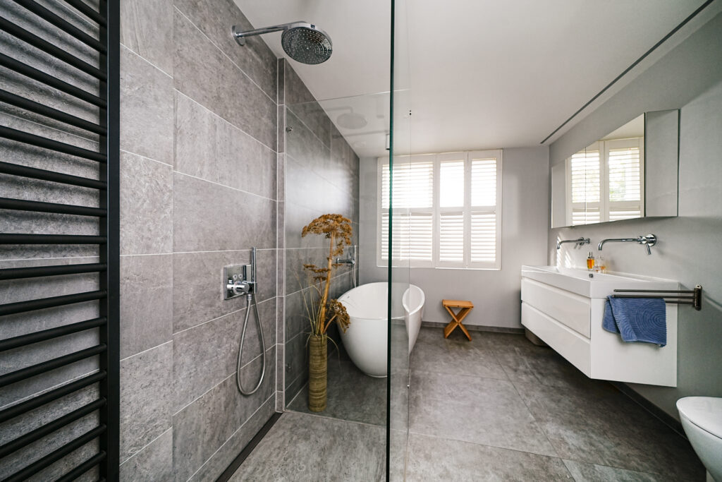 – Fraaie en hoogwaardig afgewerkte badkamer met een vrijstaand ligbad, inloopdouche, dubbele wastafel en toilet;