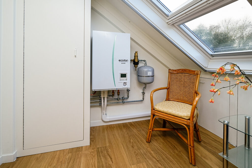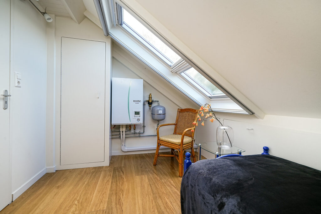 – Inloopberging/slaapkamer met Velux dakraam aan de voorzijde van het huis. In deze ruimte bevindt zich ook een afgesloten kast met daarin de CV-opstelling (met CO-melder). Naast die kast is de warmtepomp geïnstalleerd.