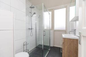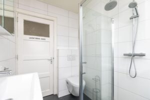 * Geheel betegelde badkamer aan de achterzijde, voorzien van wastafel, inloopdouche en 2e toilet.