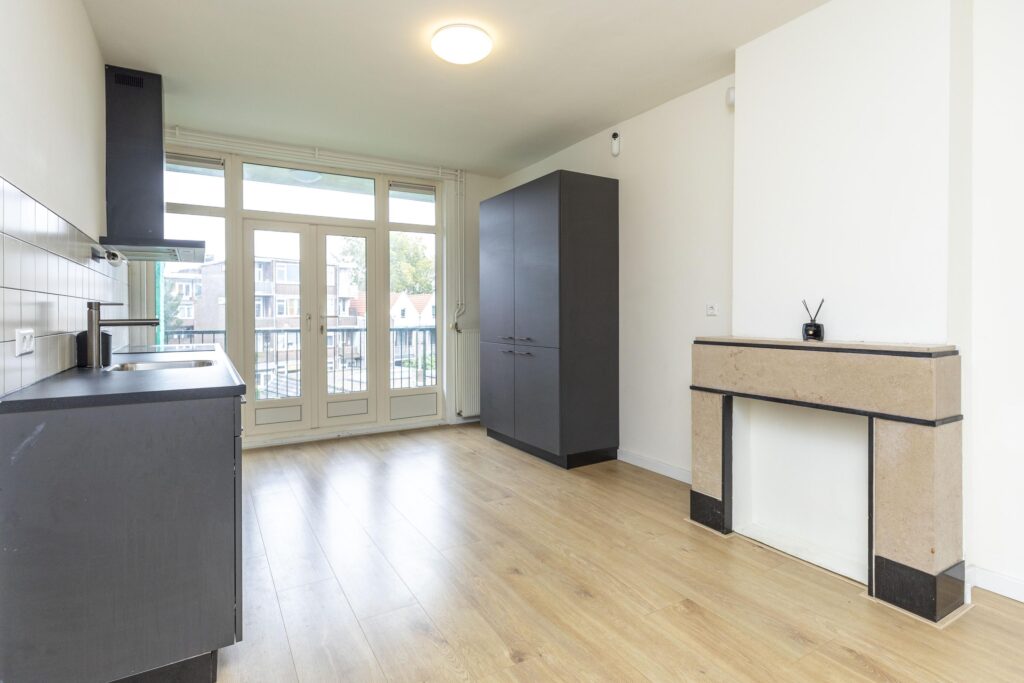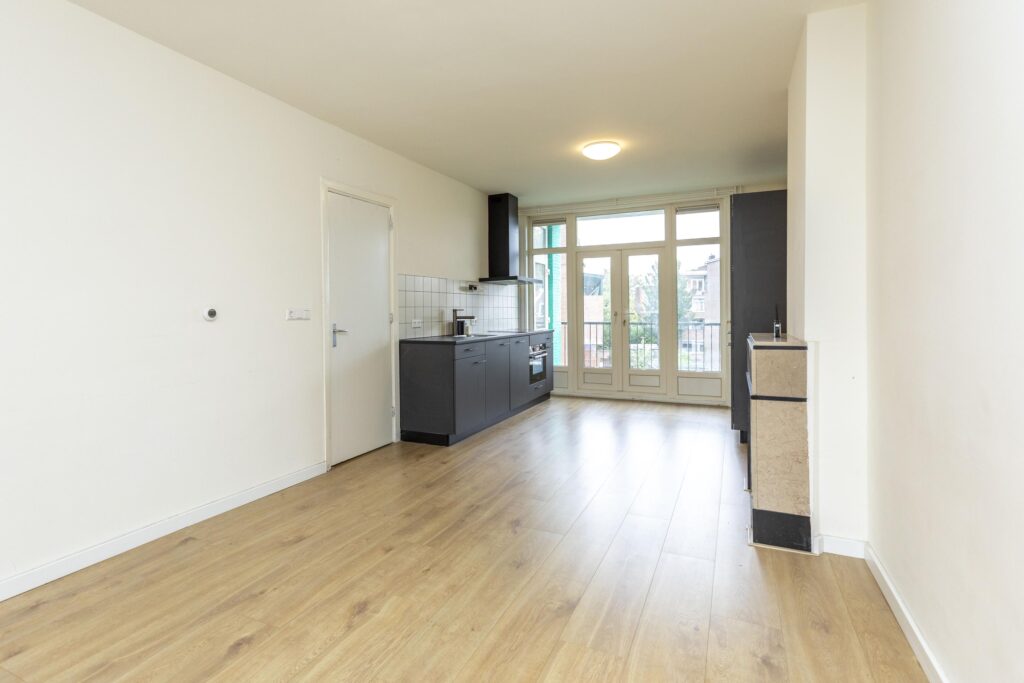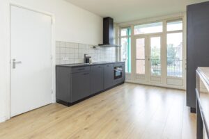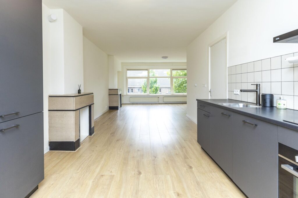 * Moderne keuken (2022) aan de achterzijde, voorzien van diverse inbouwapparatuur (inductie kookplaat, afzuigkap, vriezer, koelkast, combimagnetron en vaatwasser) en openslaande deuren naar het balkon.
