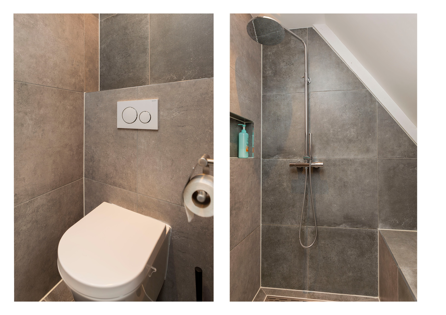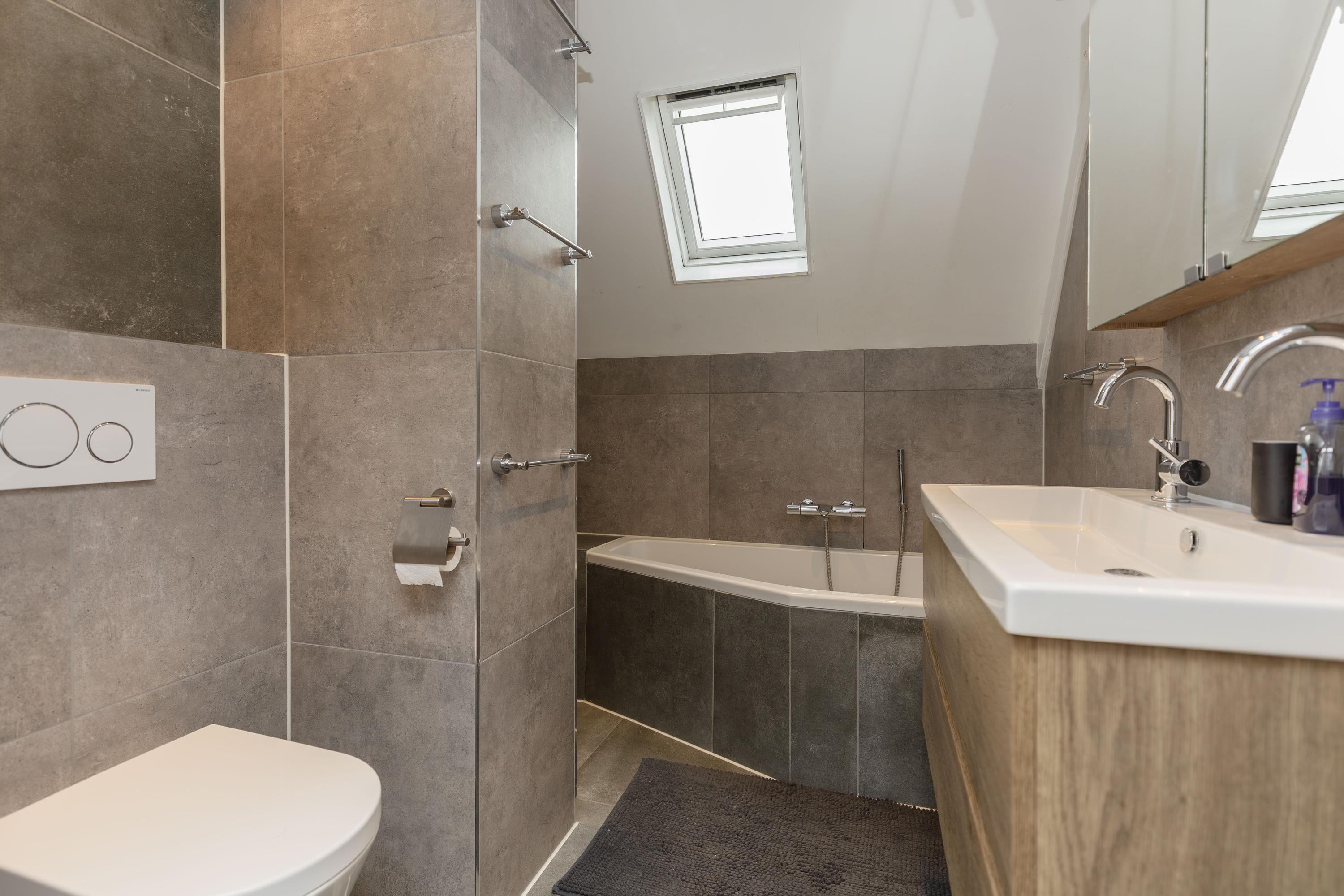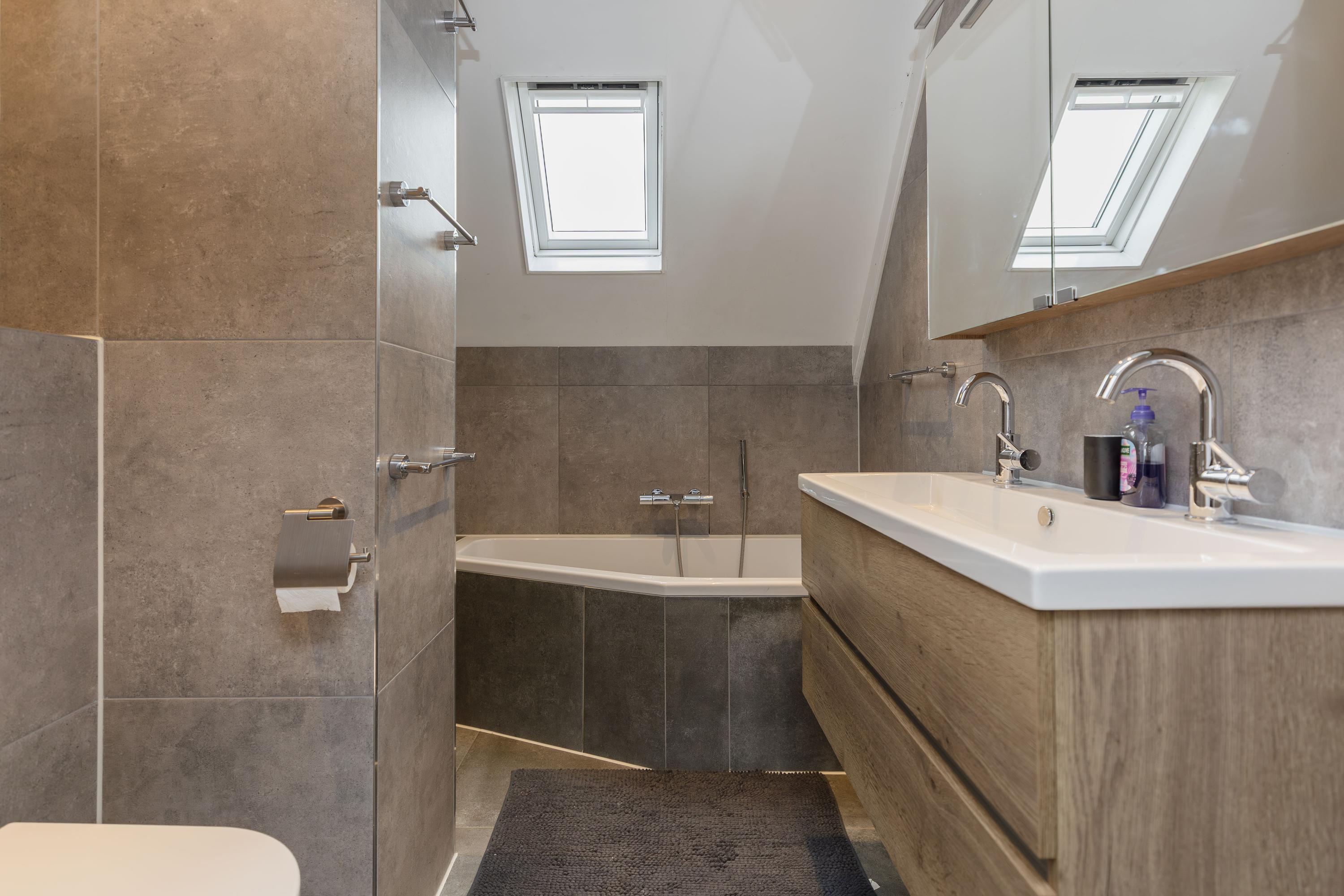 * De moderne badkamer is voorzien van een inloopdouche, ligbad, wastafelmeubel en inbouwtoilet.