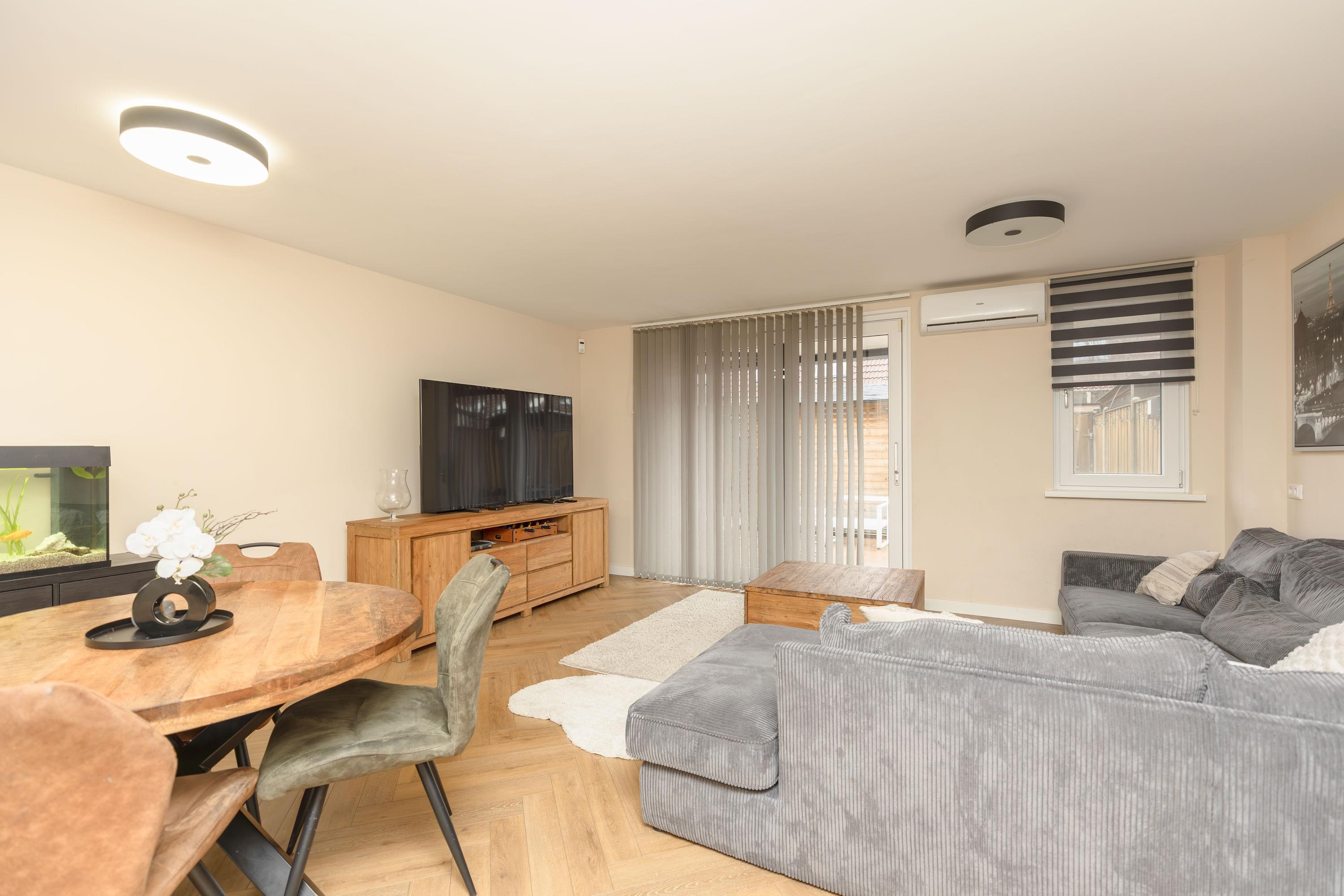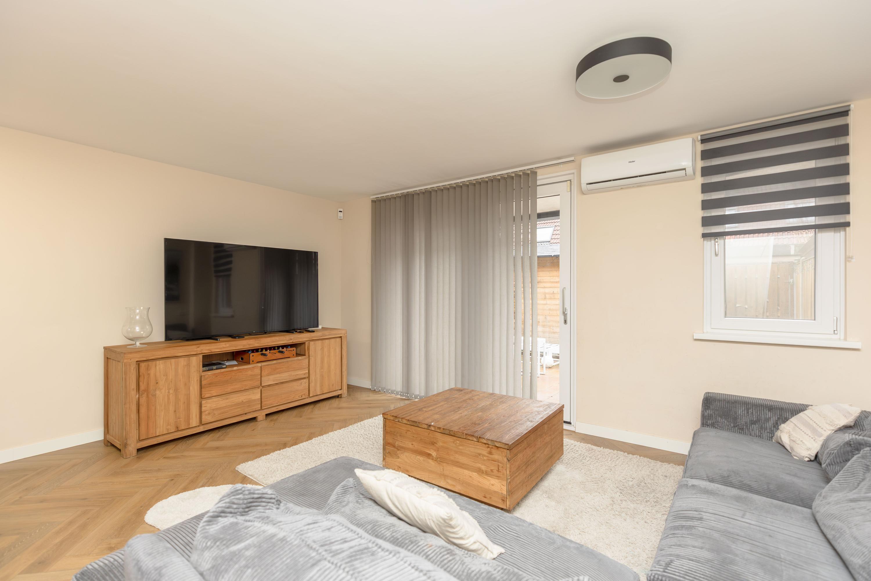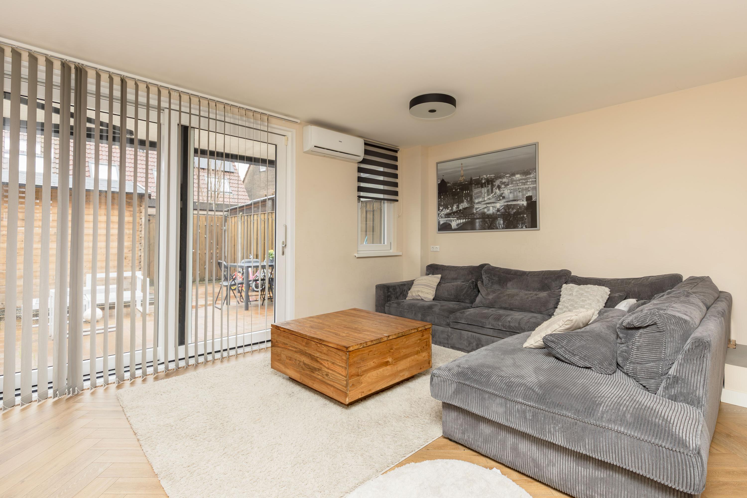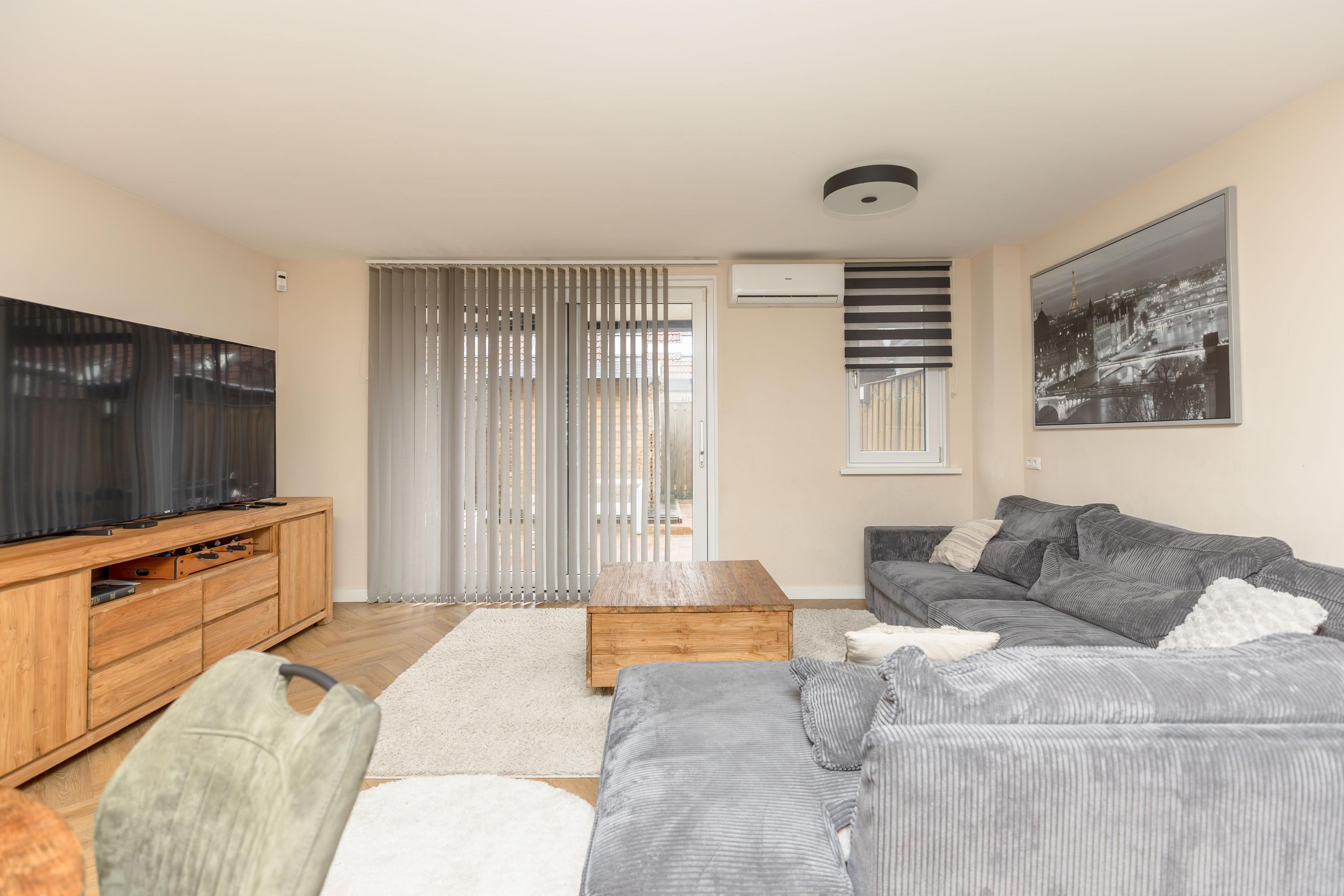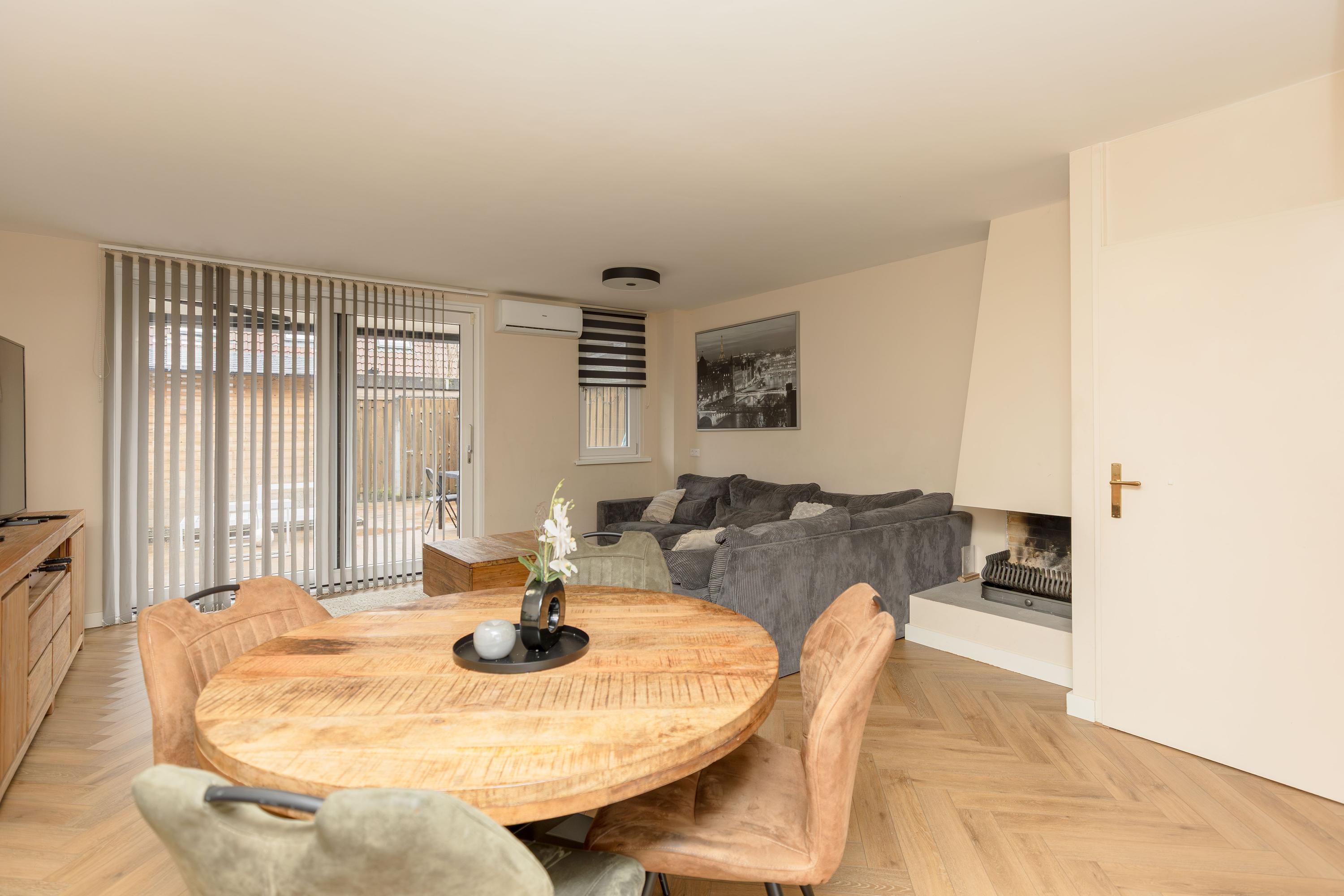 * De woonkamer is gelegen aan de achterzijde van de woning, en doormiddel van een schuifpui is er toegang tot de achtertuin. Tevens is de woonkamer voorzien van airconditioning, vloerverwarming en een open haard;