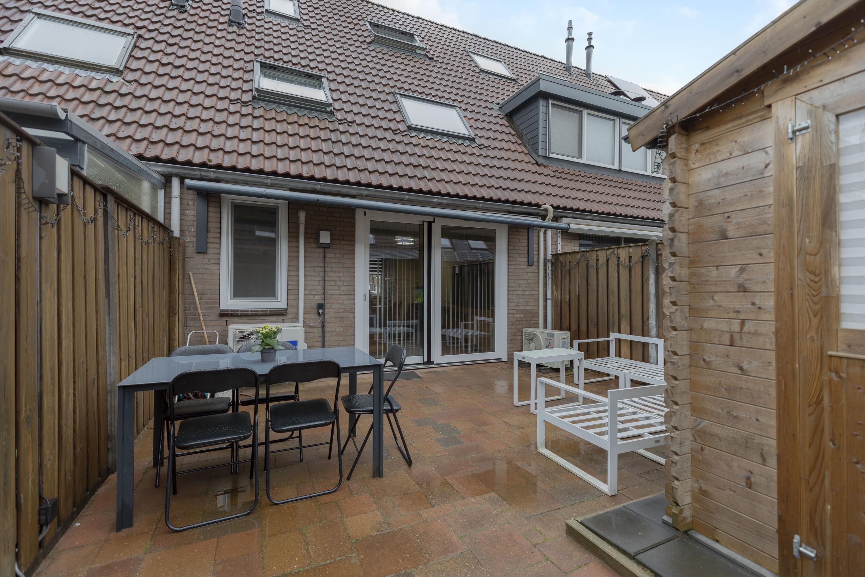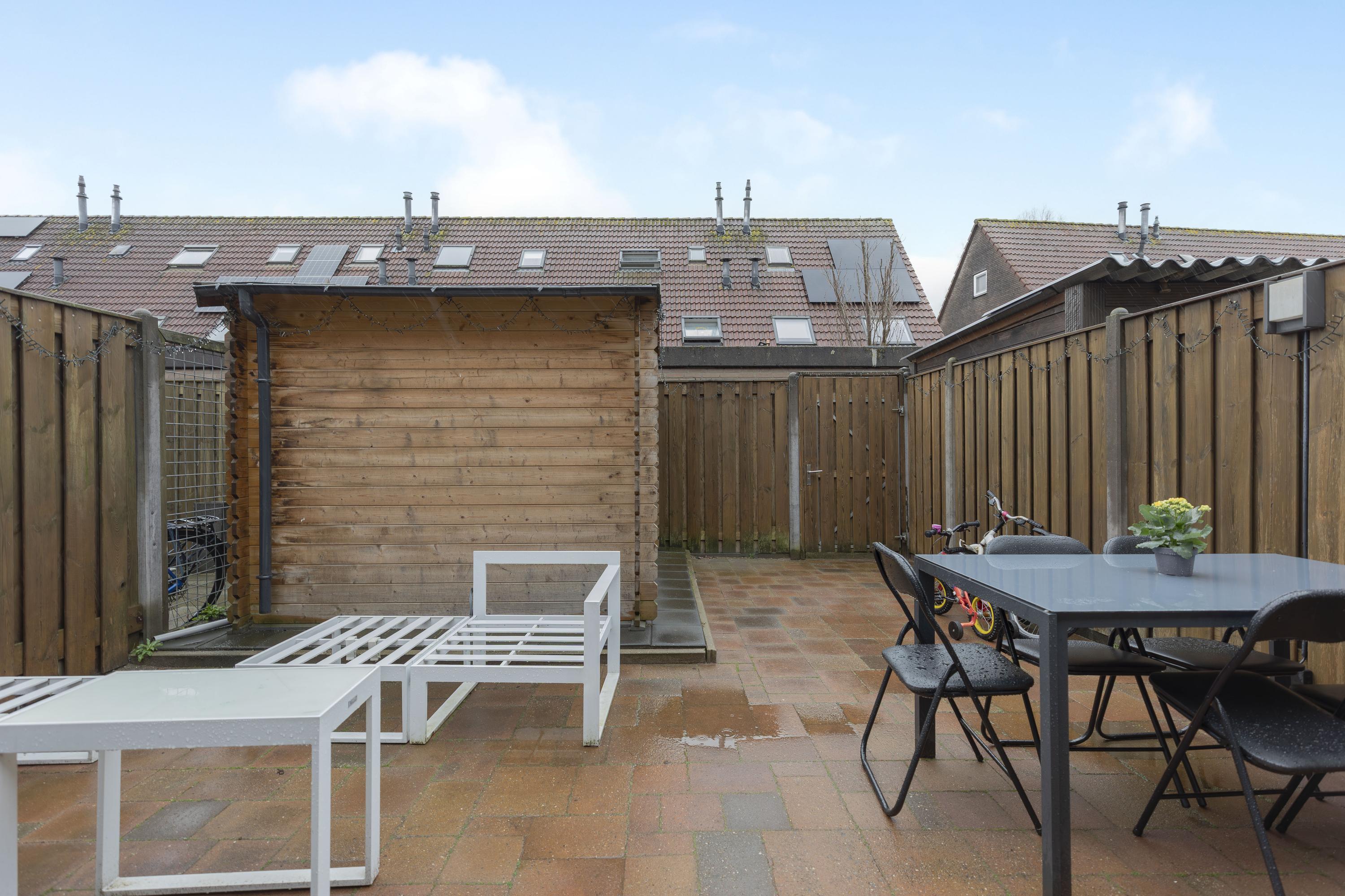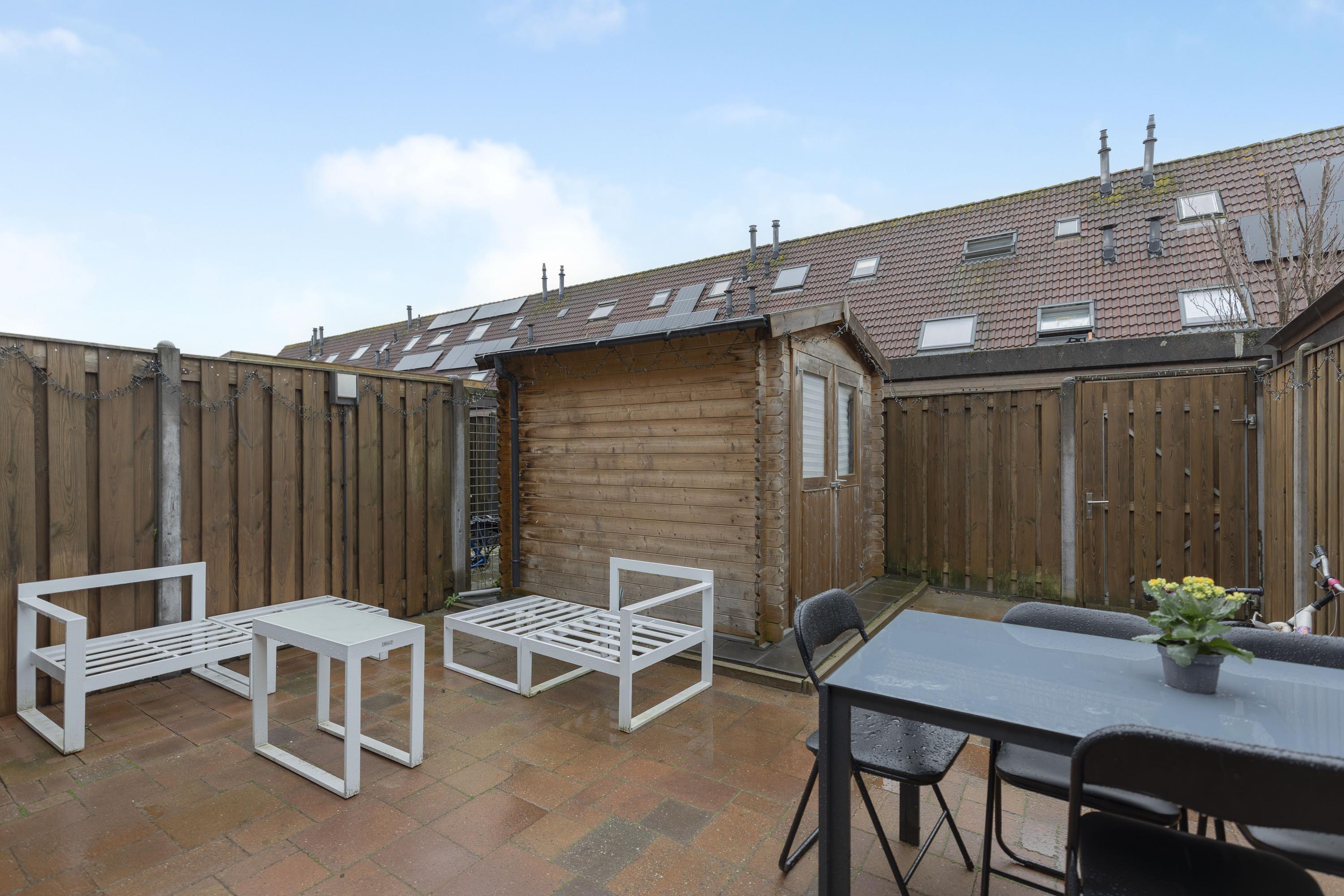 De achtertuin beschikt over een houten berging en een achterom.